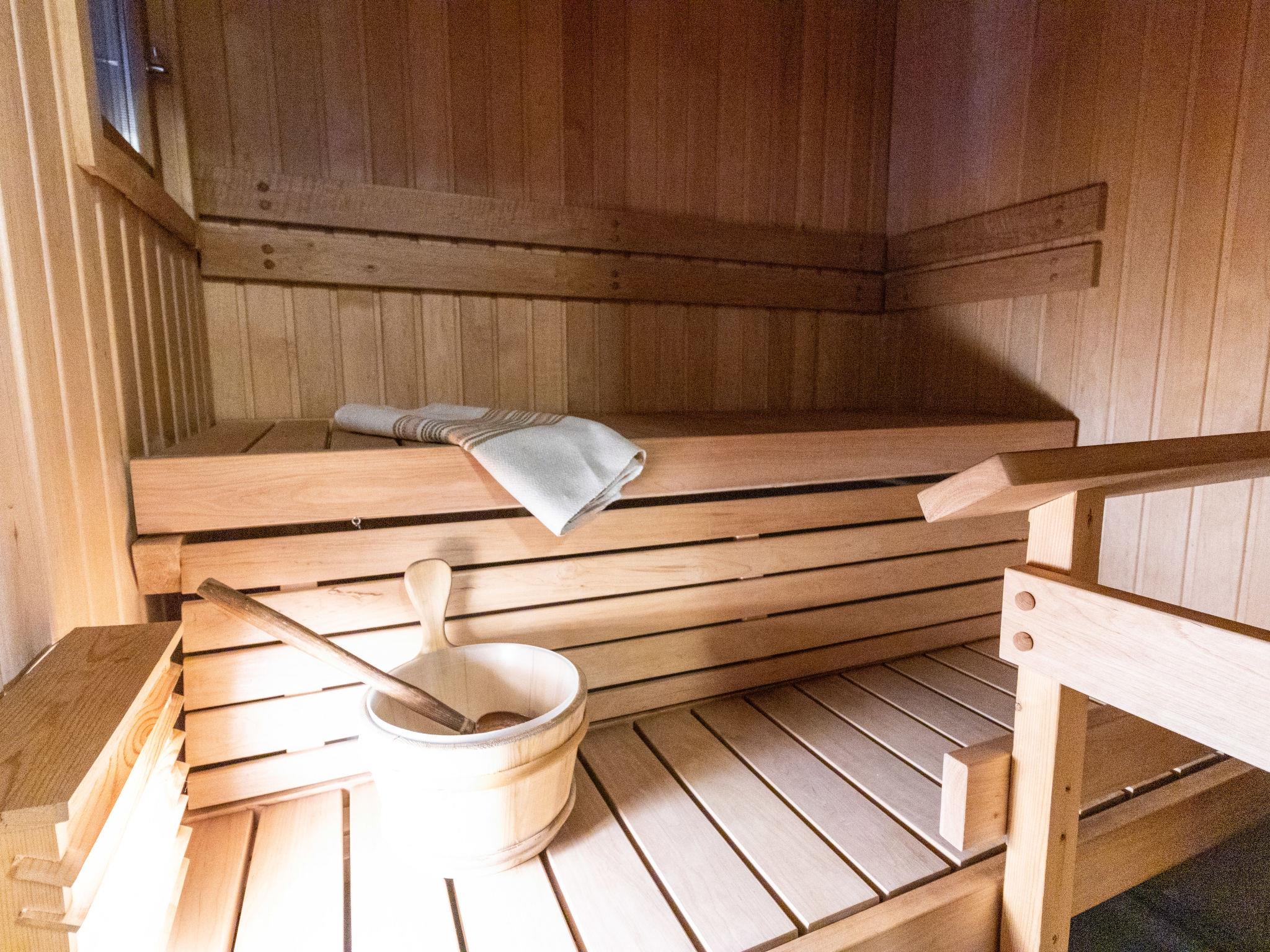 The washroom includes a WC and an electric sauna. There is no fireplace in the apartment. An outdoor storage room accessed from the terrace can accommodate, for example, two bicycles.