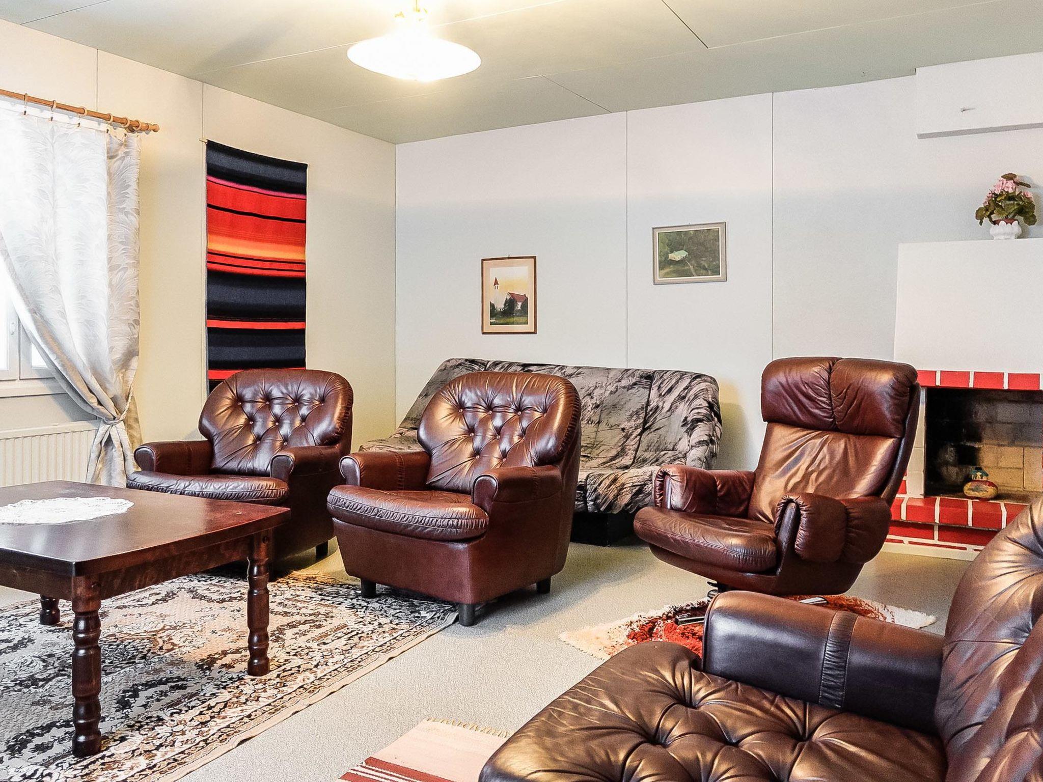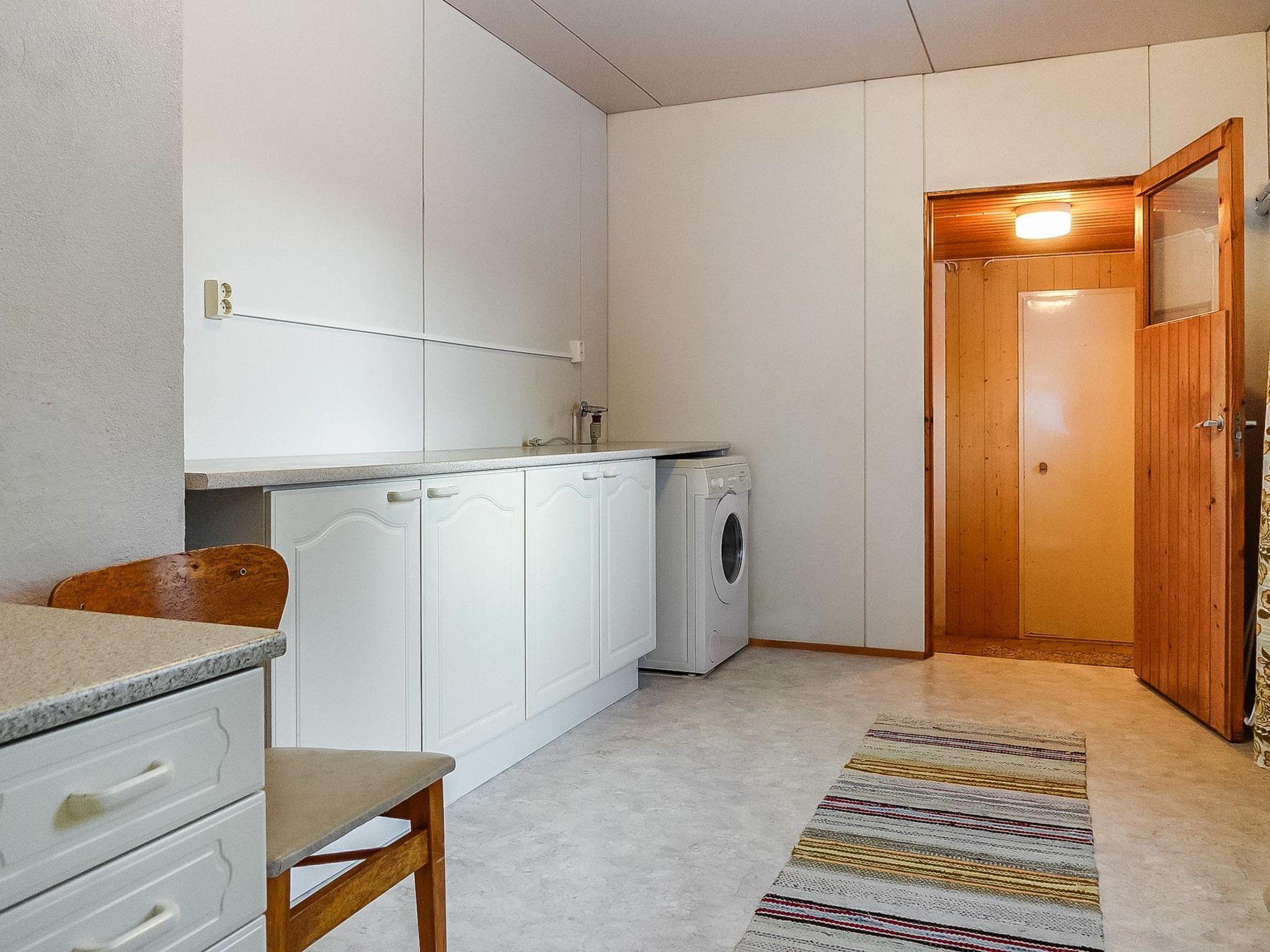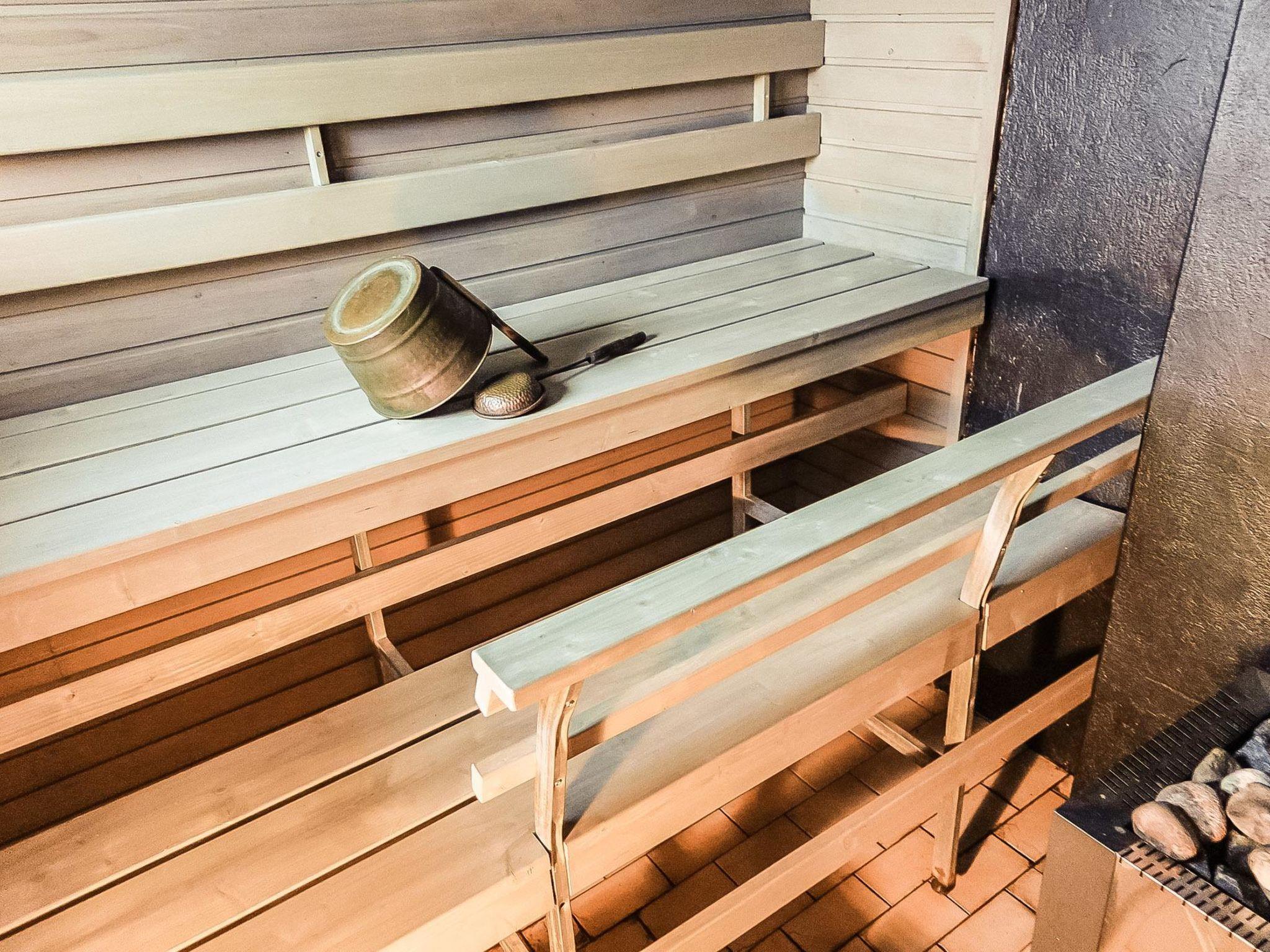 Living room with 2 sofa beds, kitchen, 2 bedrooms with 2 beds, sauna, washroom/WC, utility room, separate WC and covered porch.