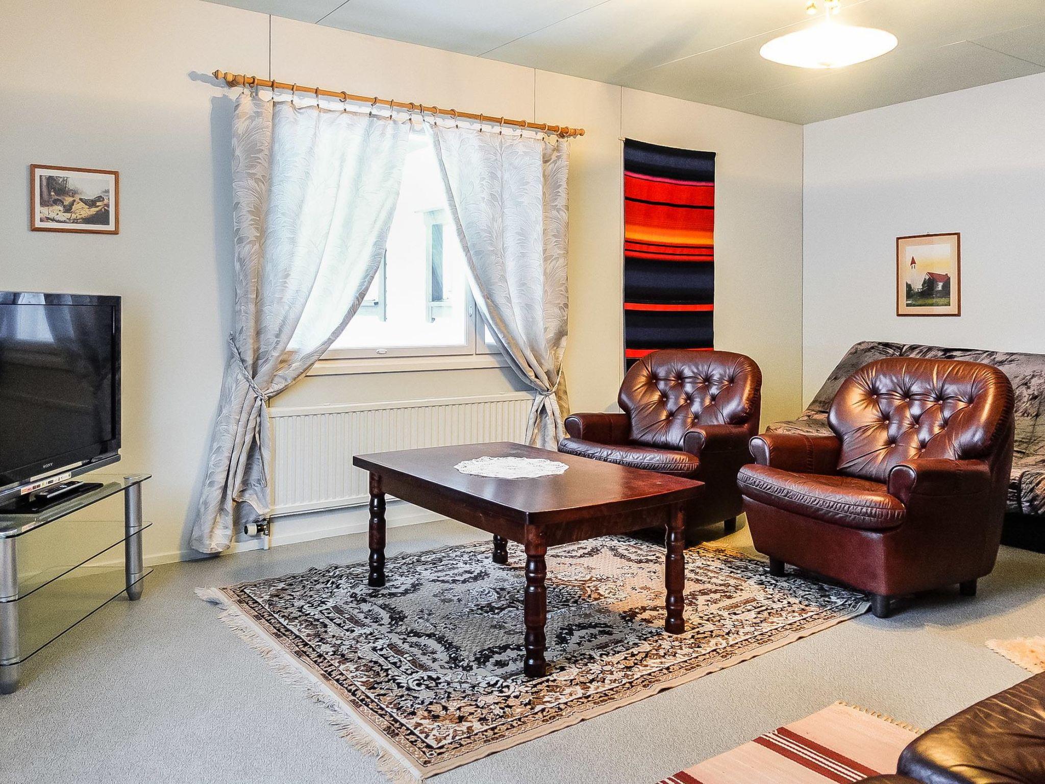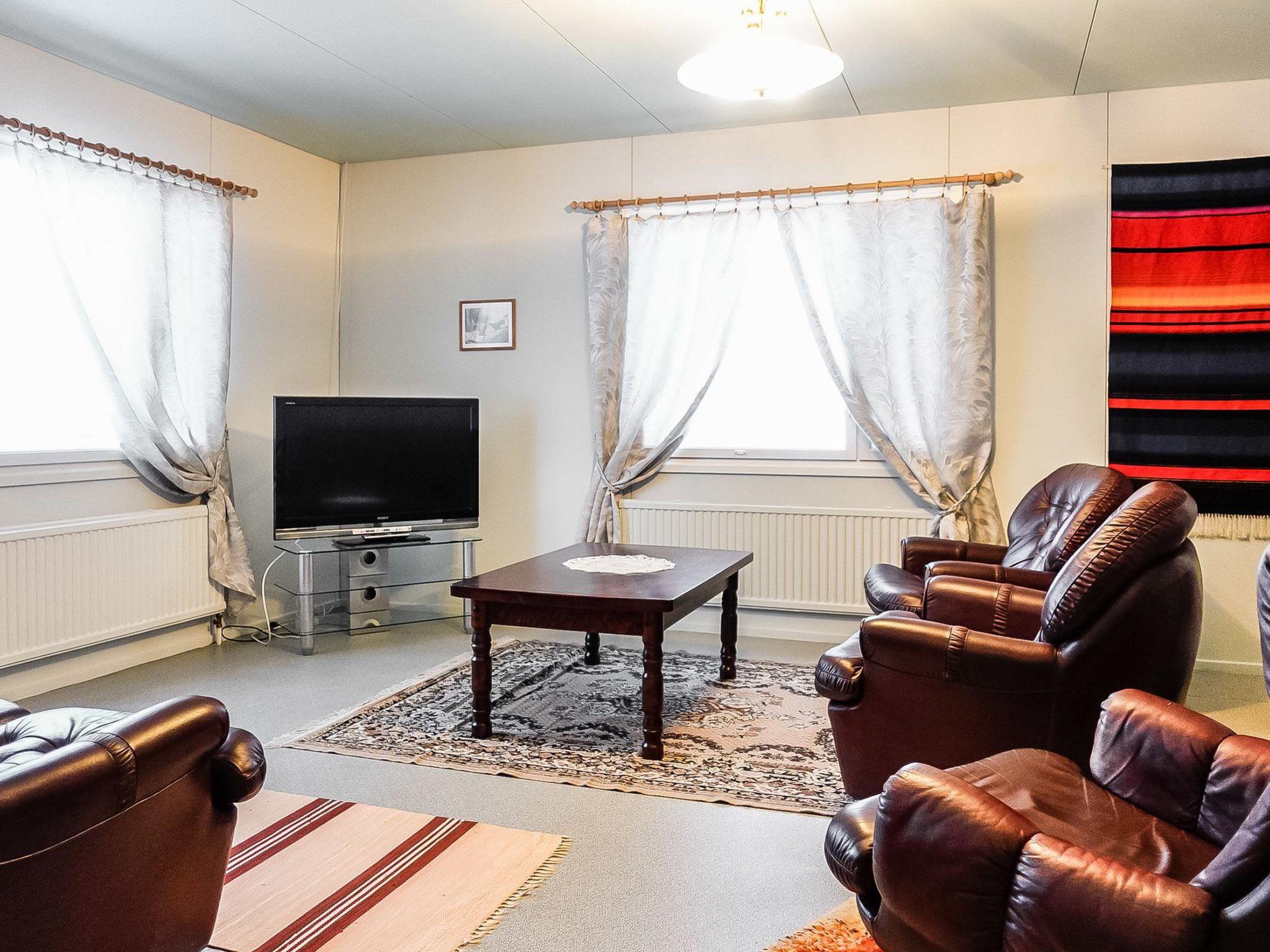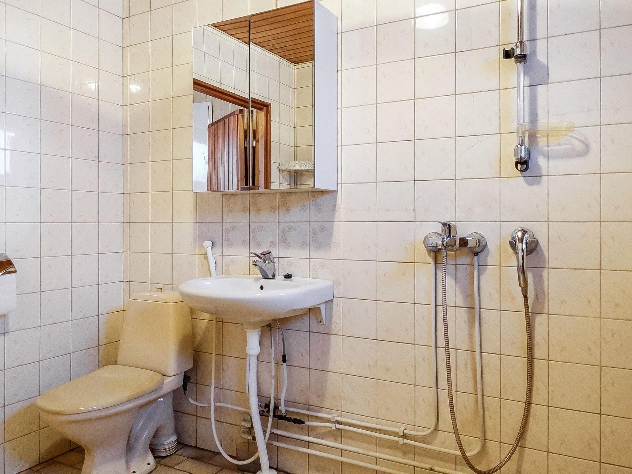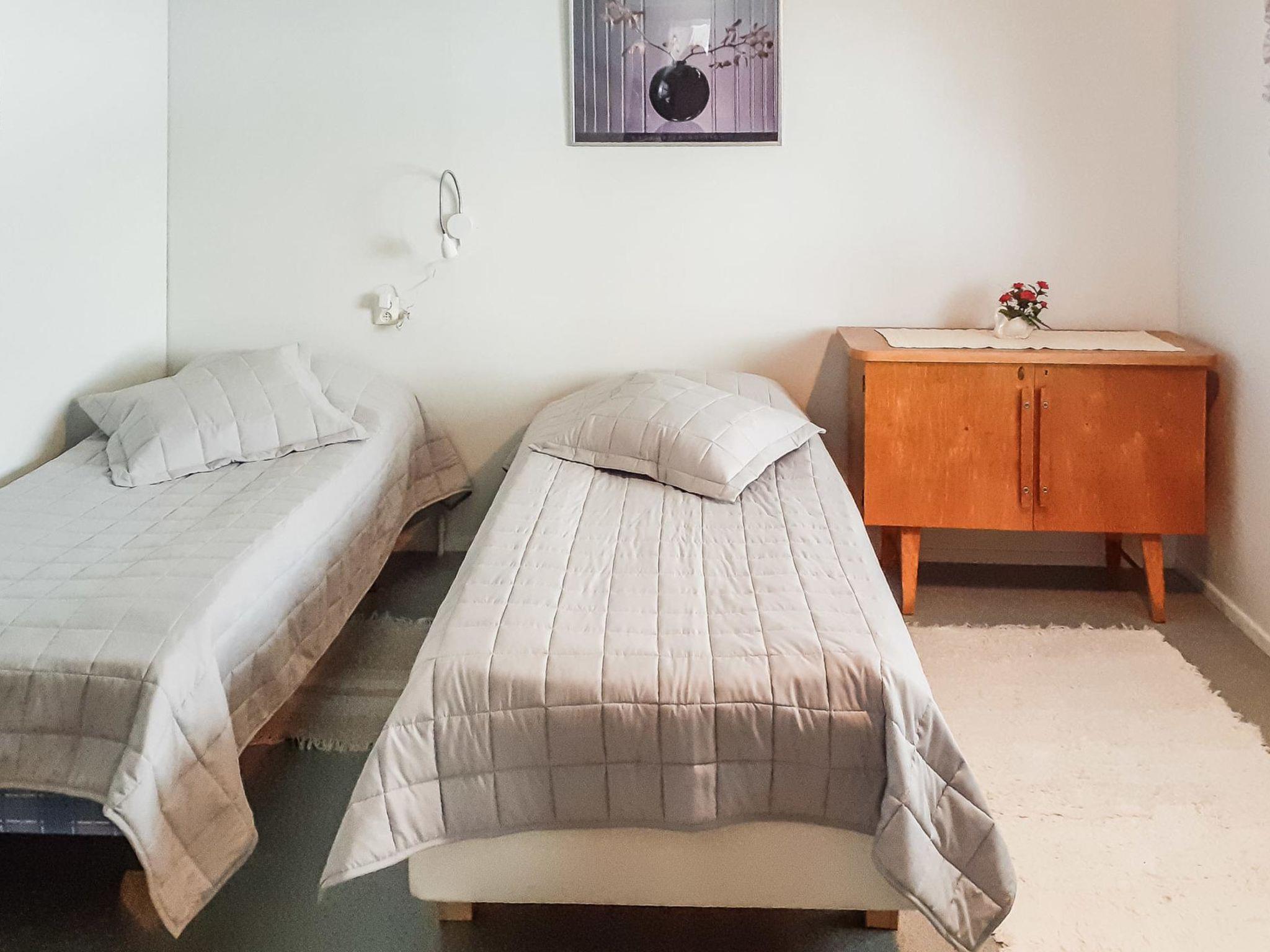 Living room with 2 sofa beds, kitchen, 2 bedrooms with 2 beds, sauna, washroom/WC, utility room, separate WC and covered porch.