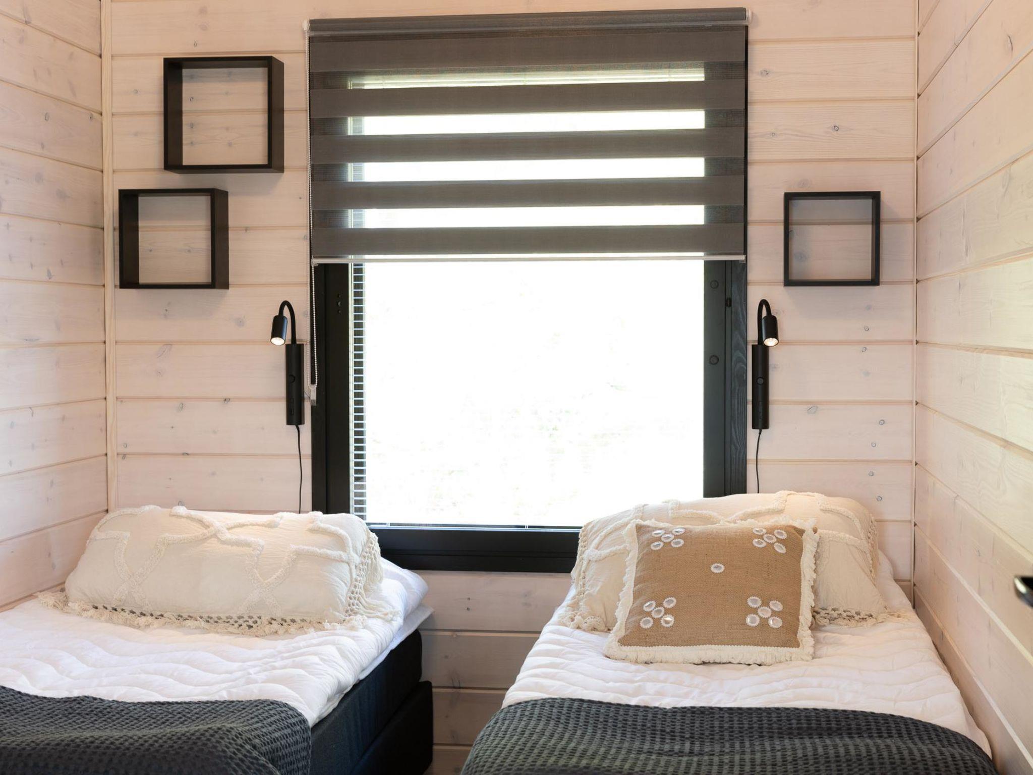This wooden cabin was completed in 2023. There is a combined kitchen/living room, one bedroom with a double bed, and two additional bedrooms each with two single beds. The cabin includes a sauna, a bathroom with a toilet, an additional toilet, a utility room, and an entrance hall. There is also a terrace.