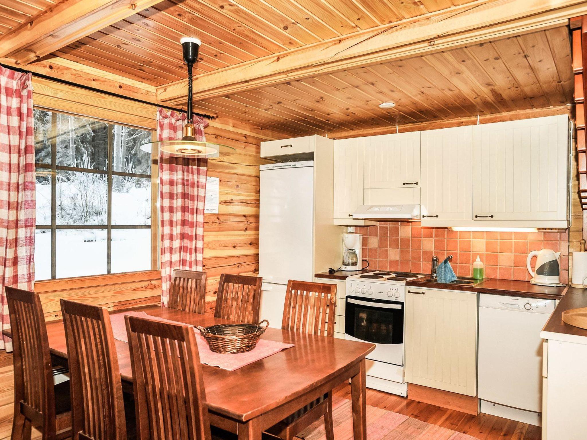 Log cabin 2006, living room / kitchen with sofa bed, 2 bedrooms with 2 beds in each (one downstairs, another upstairs), sleeping loft with 4 beds, wood-heated sauna, washroom, toilet downstairs and upstairs, covered porch.