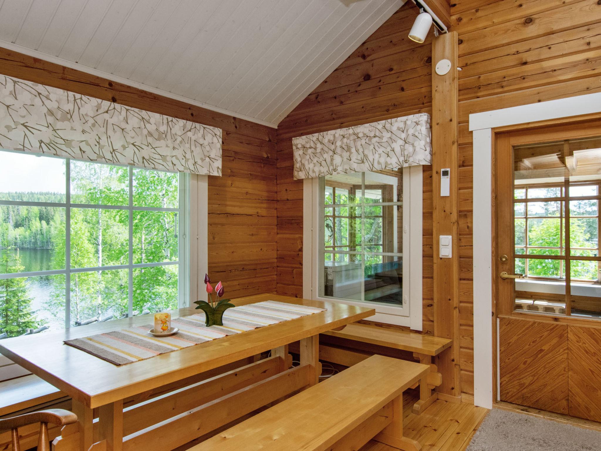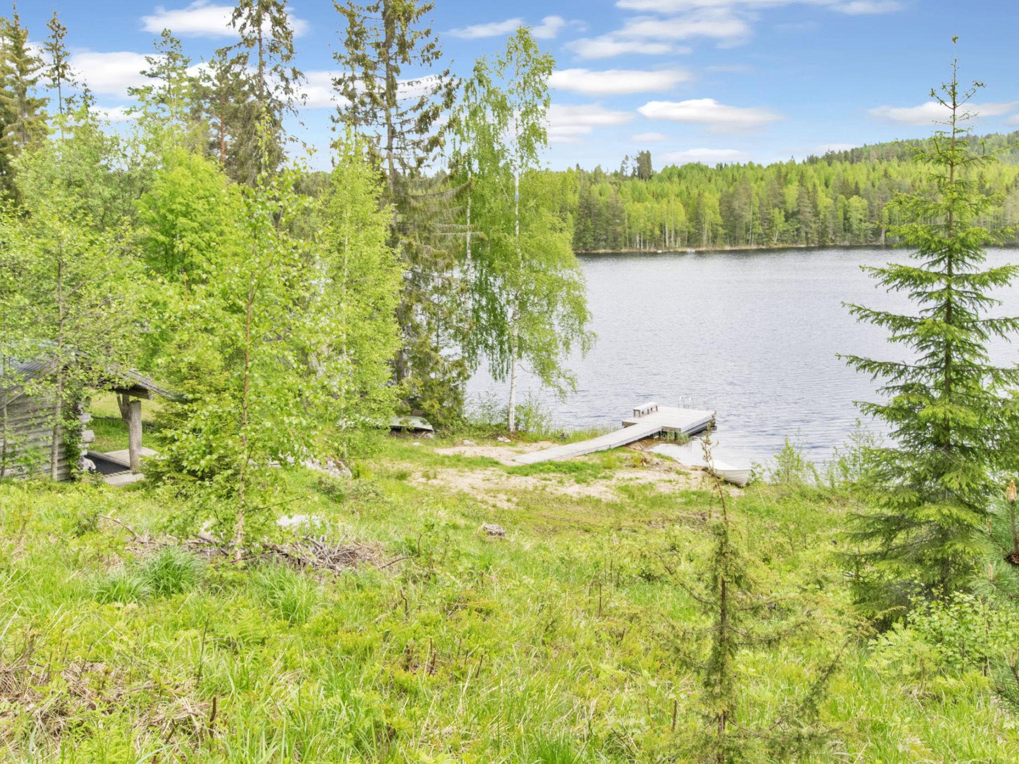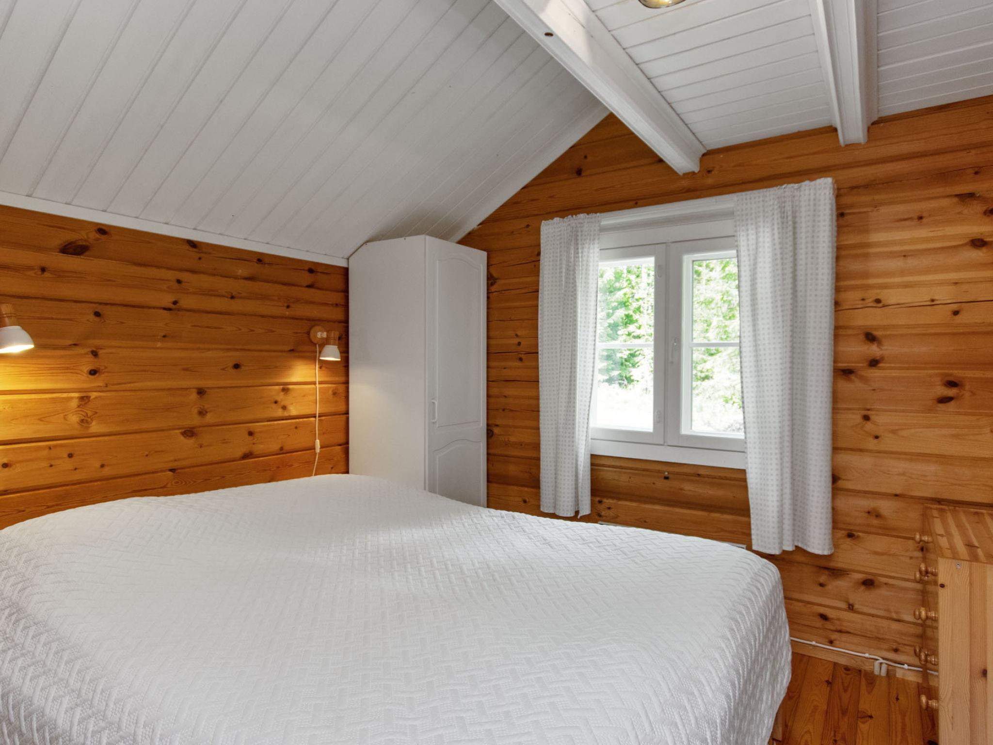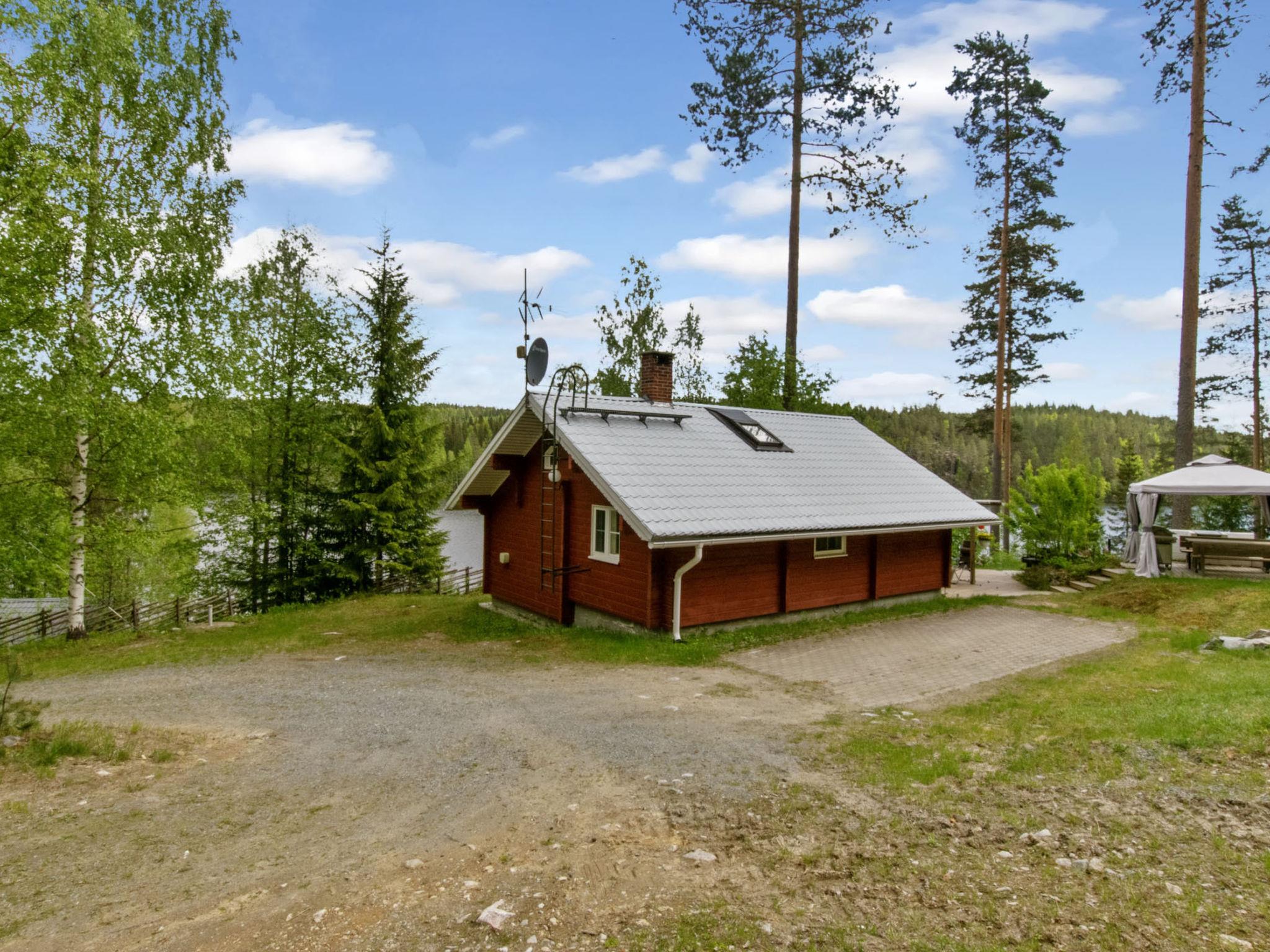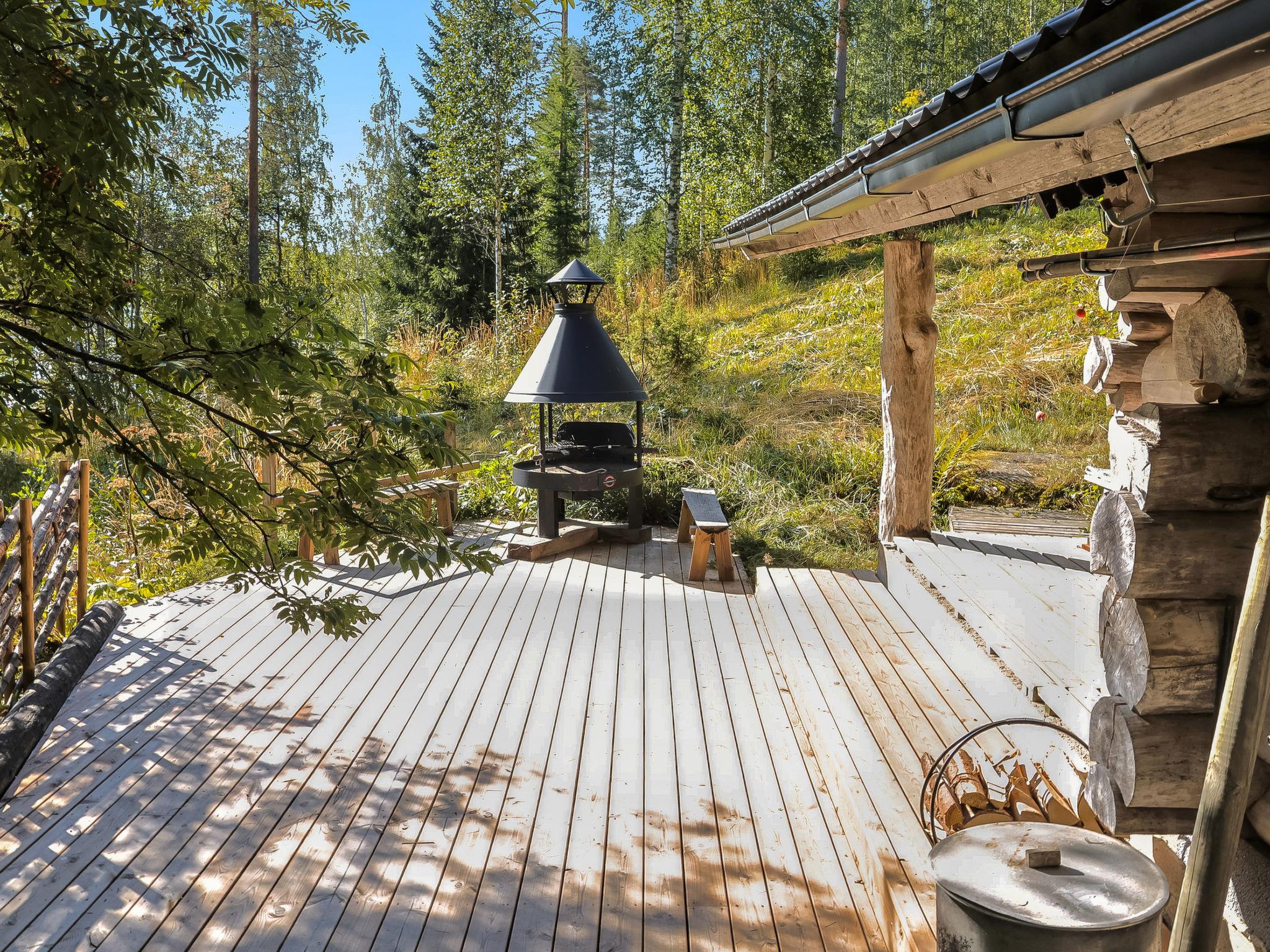 80 km southwest of Joensuu, Lake Pölläkkäjärvi 35 m (1,9 km²), shallow sanded mud and partly rocky bottom, own beach, rowing boat and jetty. Log cottage 1991, living room, kitchen, bedroom with double bed, sleeping gallery (9 m²) with 2 beds, sleeping gallery (4 m²) with 2 beds, bathroom, sauna (elec. stove), terrace. Own separate sauna building (10 m²) with wood heated stove (smoke sauna oven not in use), in sauna building a room with 2 beds, electricity and water supply.