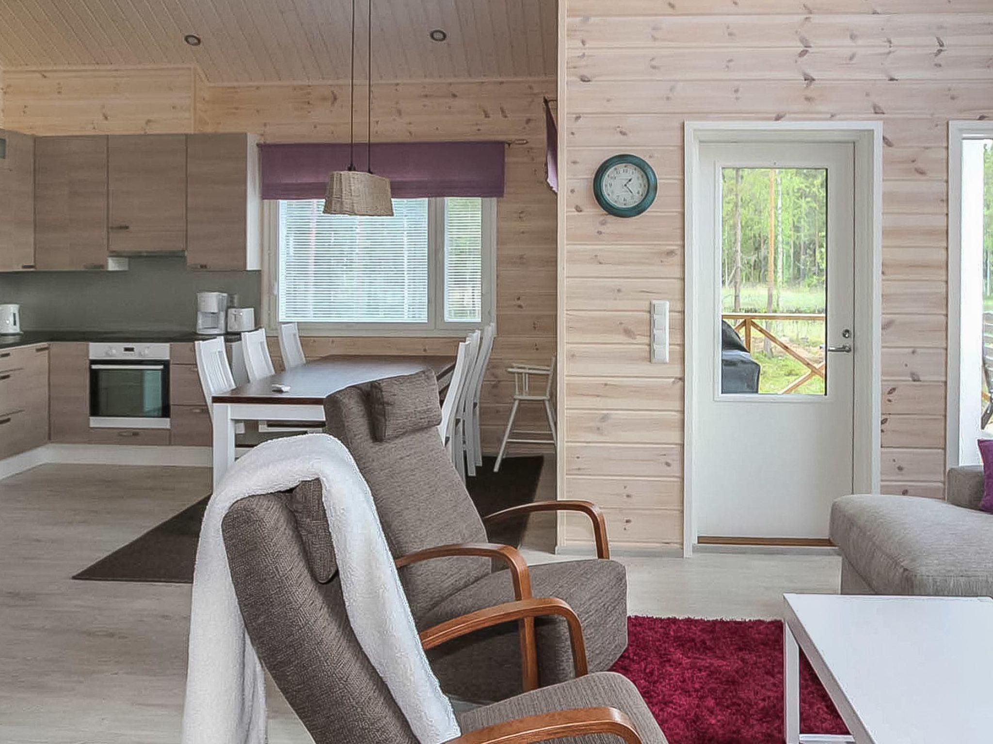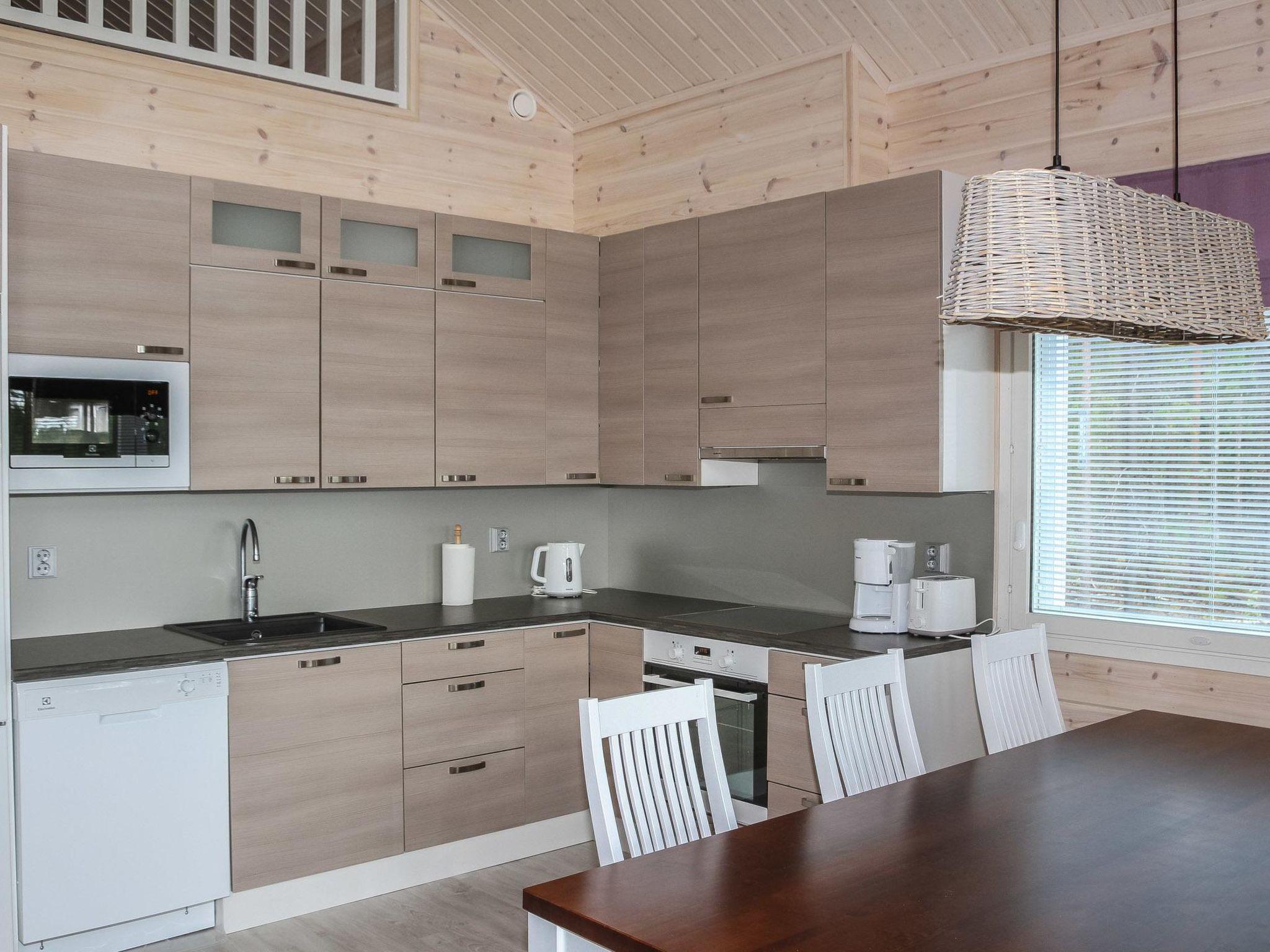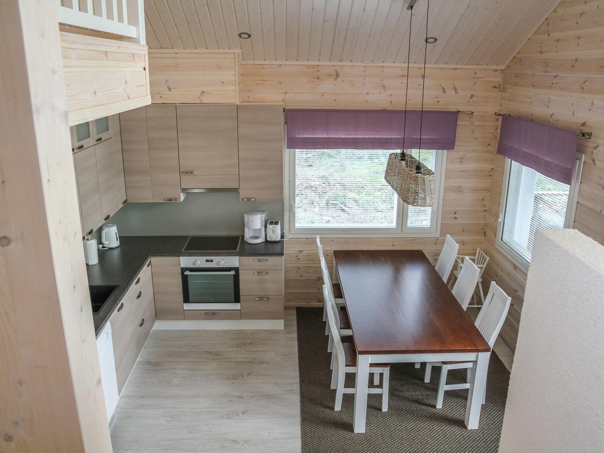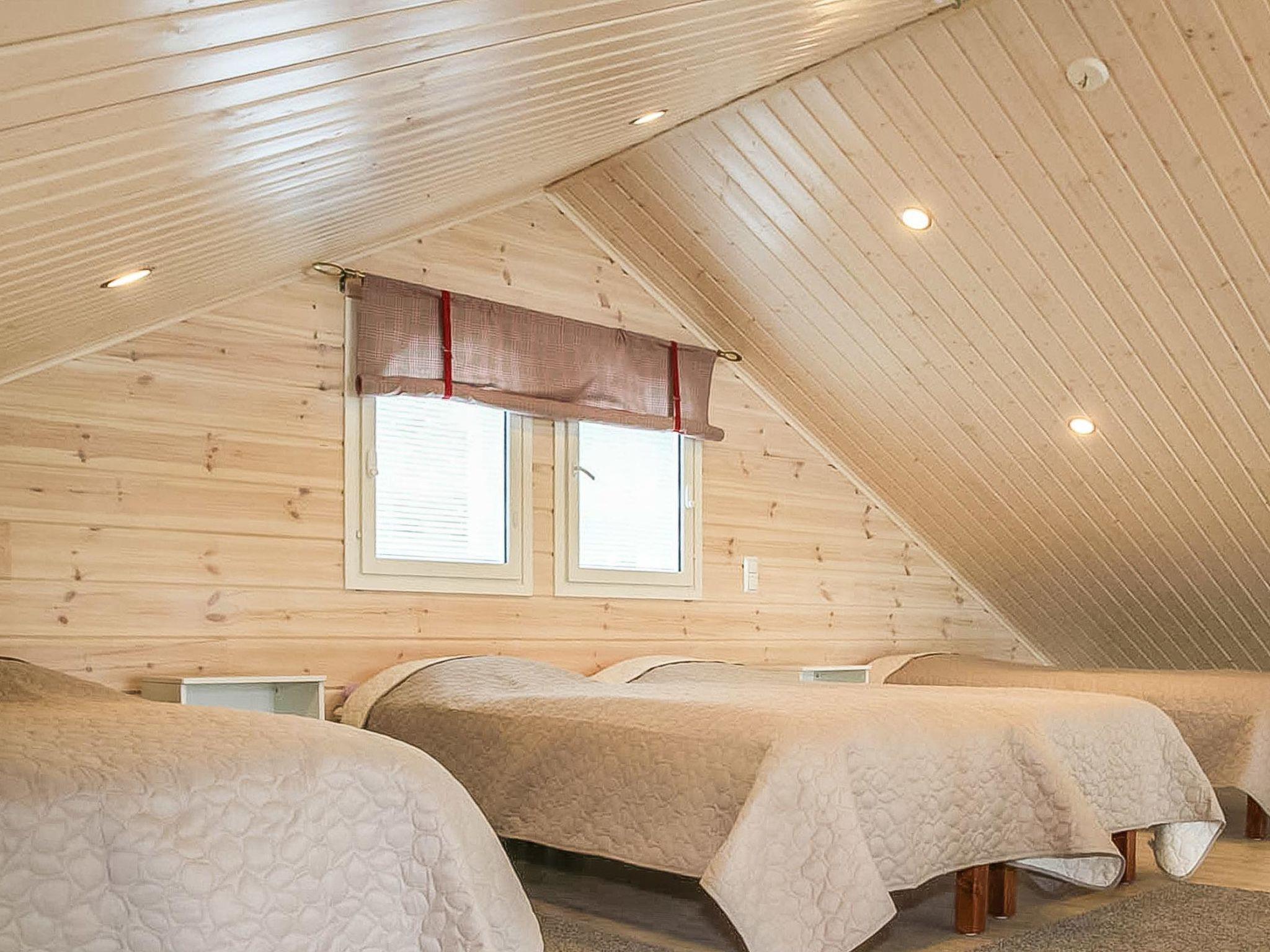 Wooden cabin 2014, living room/kitchen, bedroom (12 m²) two beds, bedroom (10 m²) two beds, sleeping loft (20 m², floor area approx. 40 m²) four beds, dressing room, washroom, sauna, separate WC.