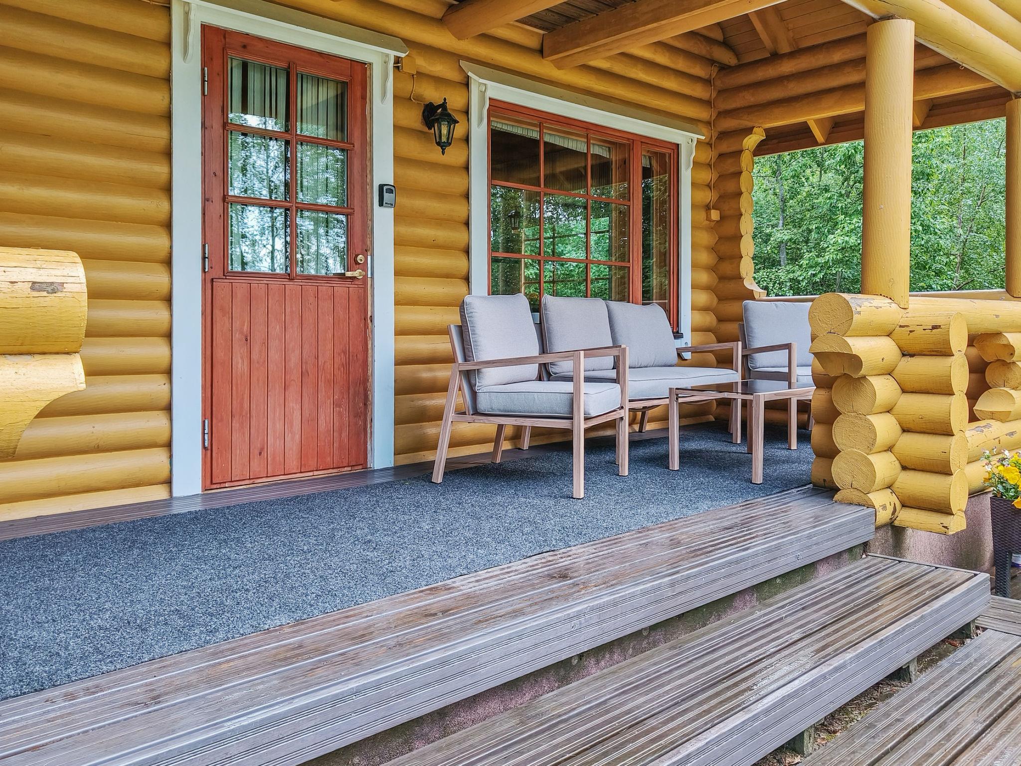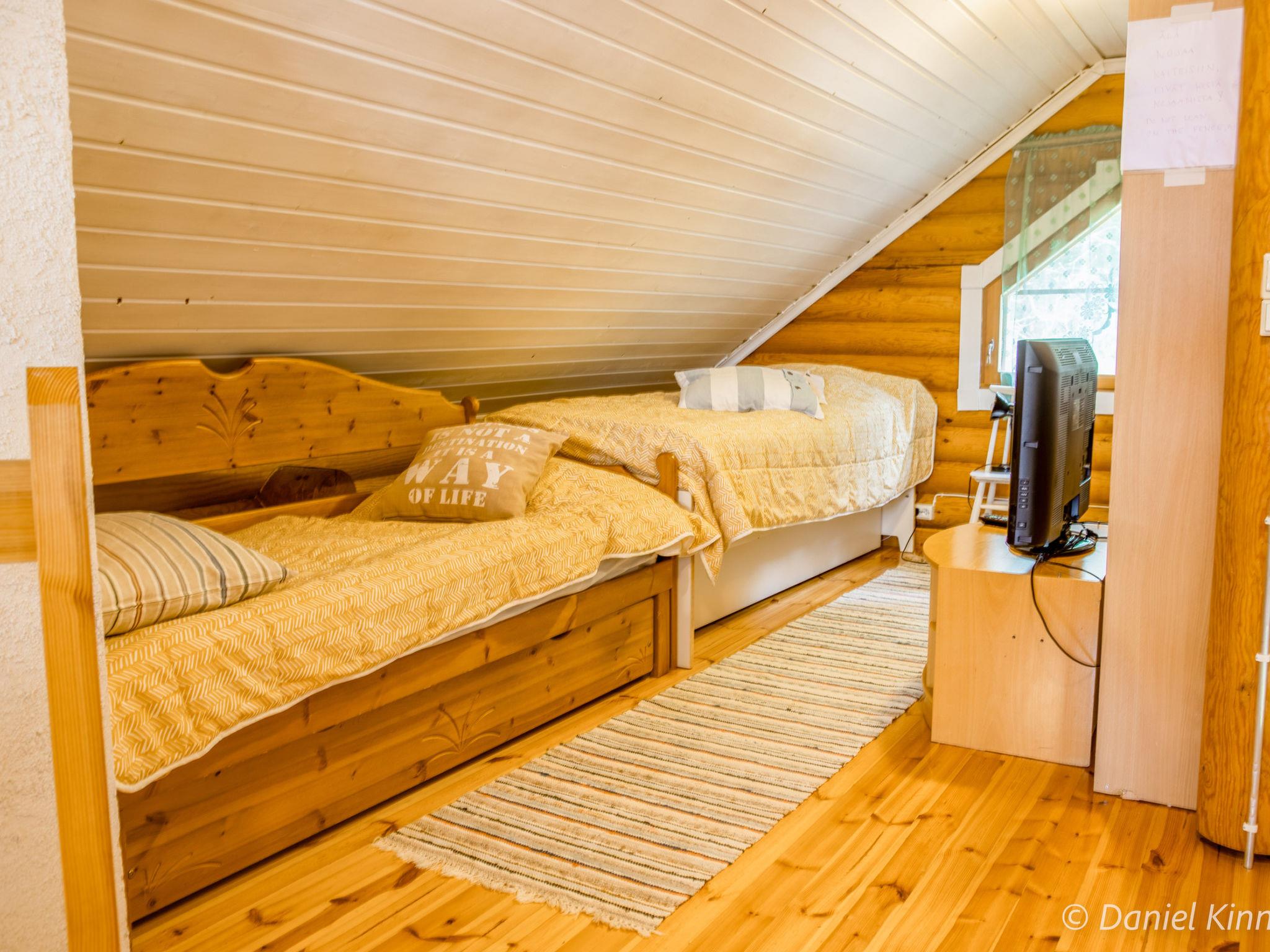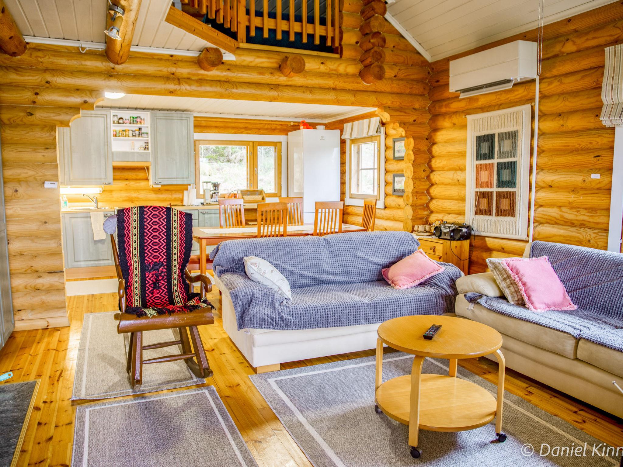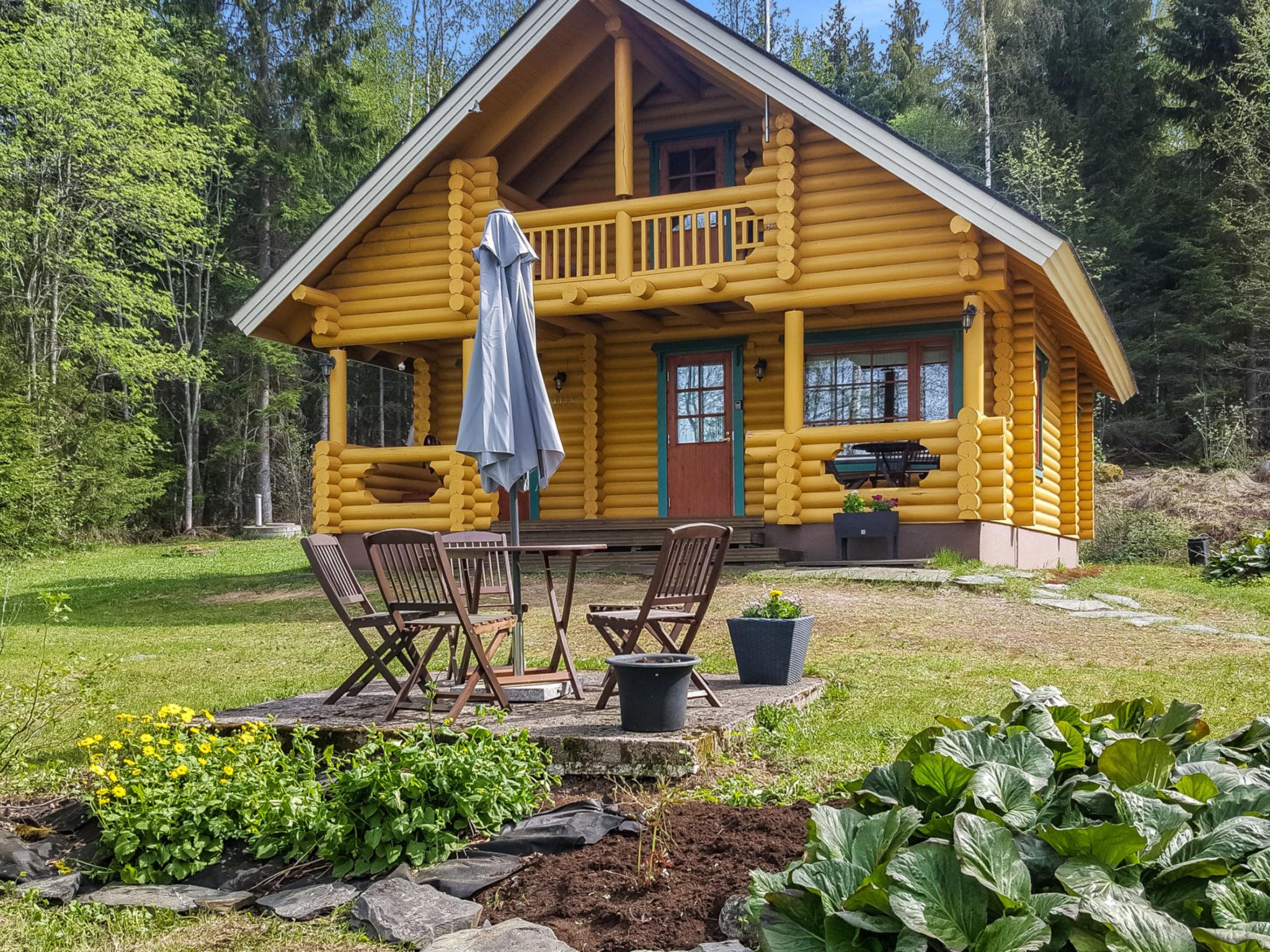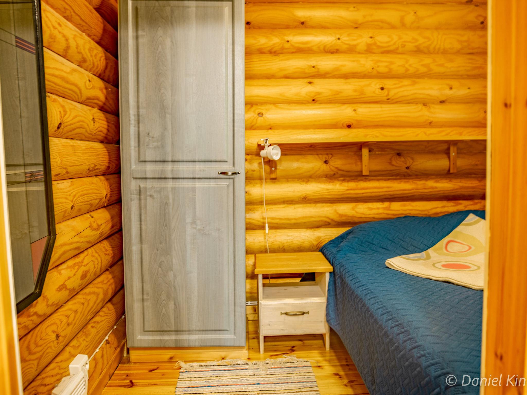 Log cottage 2003, living room/kitchen, alcove double bed (width 140 cm), sleeping loft double bed (width 140 cm), single bed (width 90 cm) and sofa bed (area 18 m², sloping ceilings, highest point 2 m, steep stairs to sleeping loft), dressing room, sauna, open porch and balcony. Access to sauna through porch.