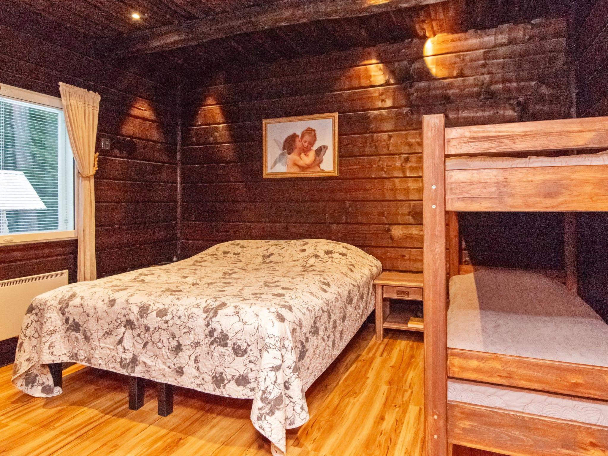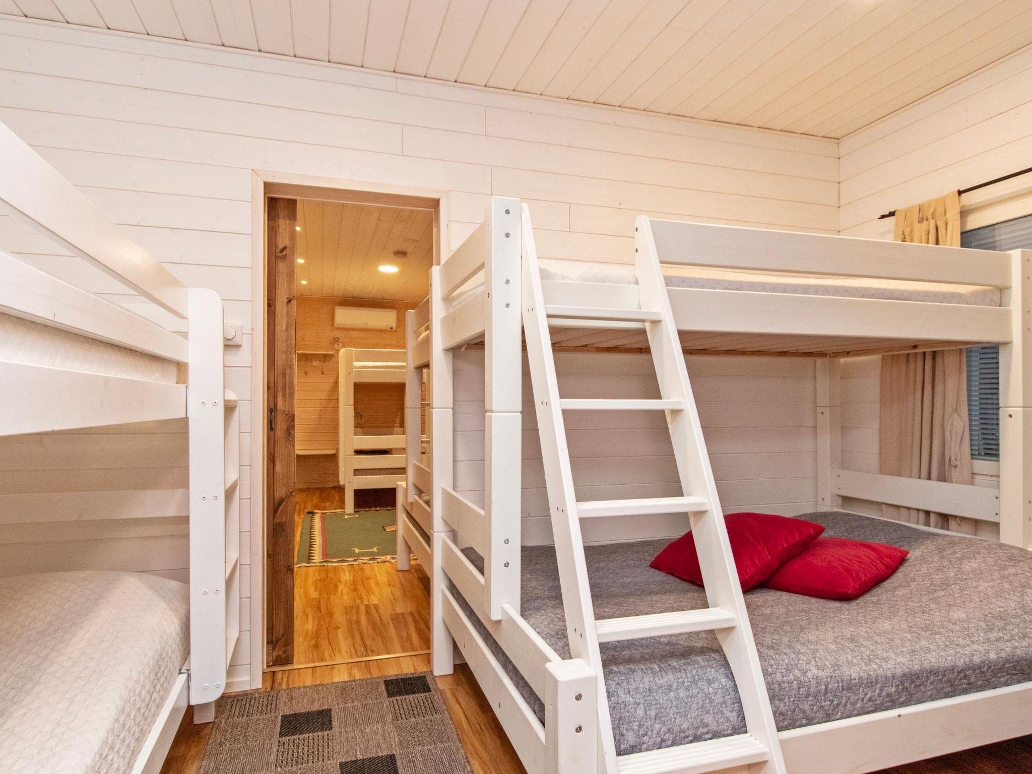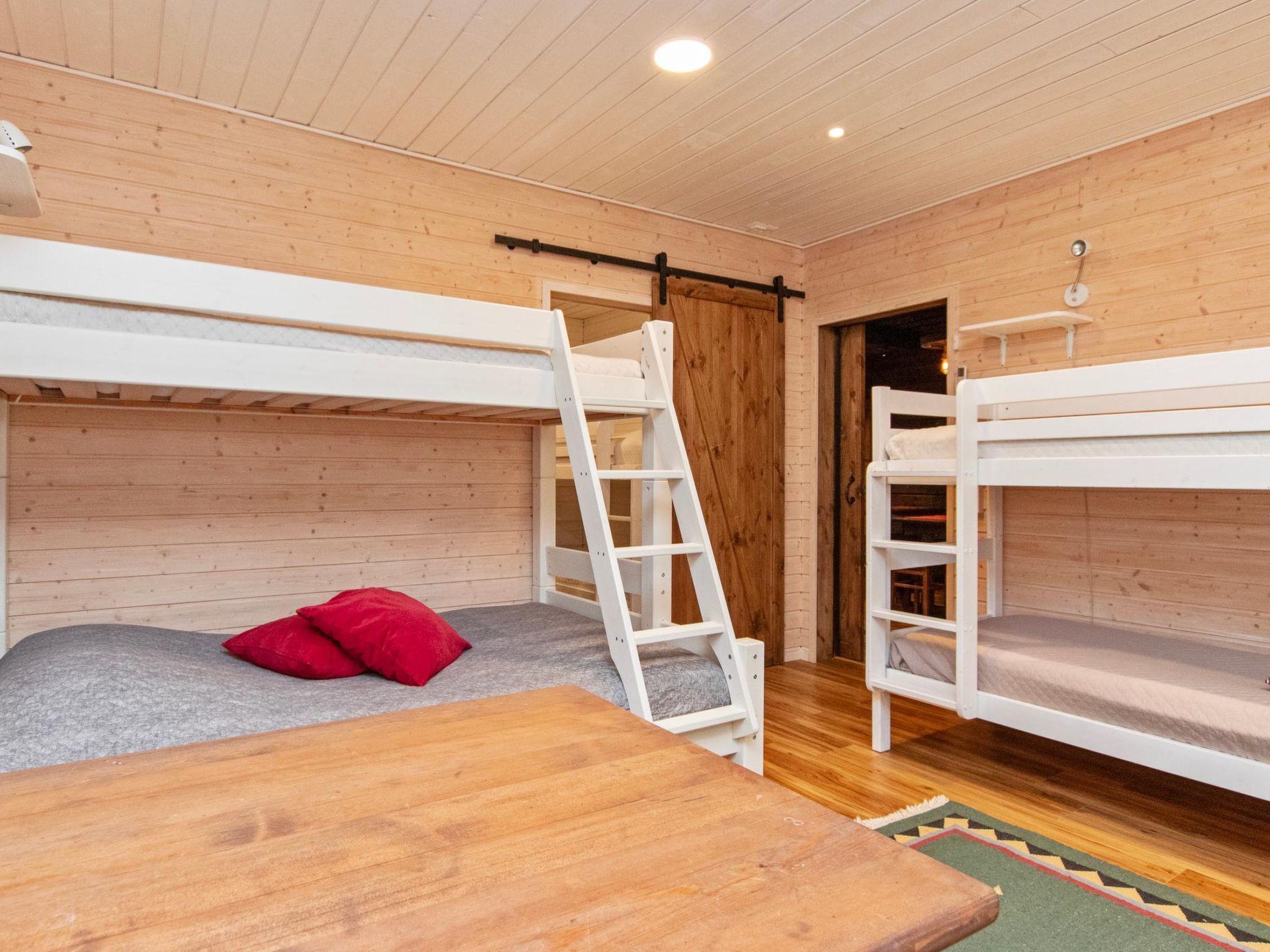 This spacious rental cabin has four bedrooms. The first bedroom includes two beds and a bunk bed for two, the second has five bunk beds accommodating 11 people, the third has two bunk beds for five people, and the fourth has two beds. The fireplace/TV room features one bunk bed for two and a corner sofa. The updated kitchen and large dining/living area can accommodate the entire group to eat together. There are 2 indoor WCs and 2 showers.