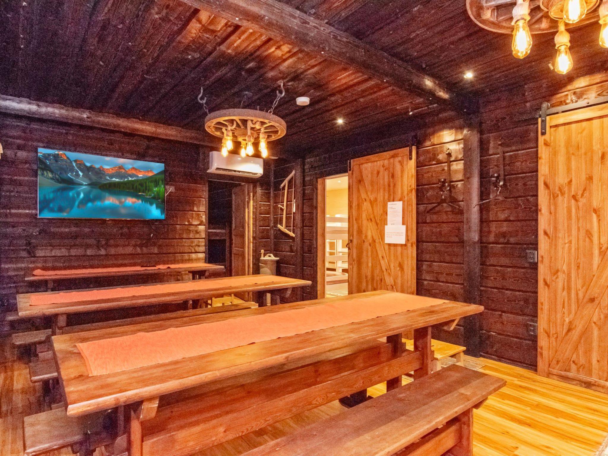 By the river, there is an atmospheric wood-heated sauna with a washing area with two showers, a fireplace room, and a large terrace extending over the river.