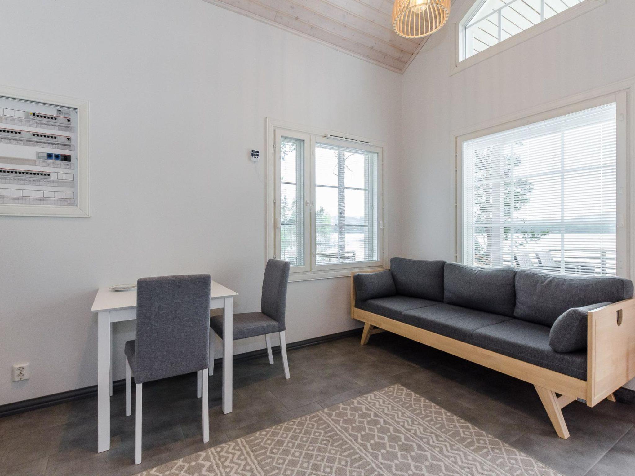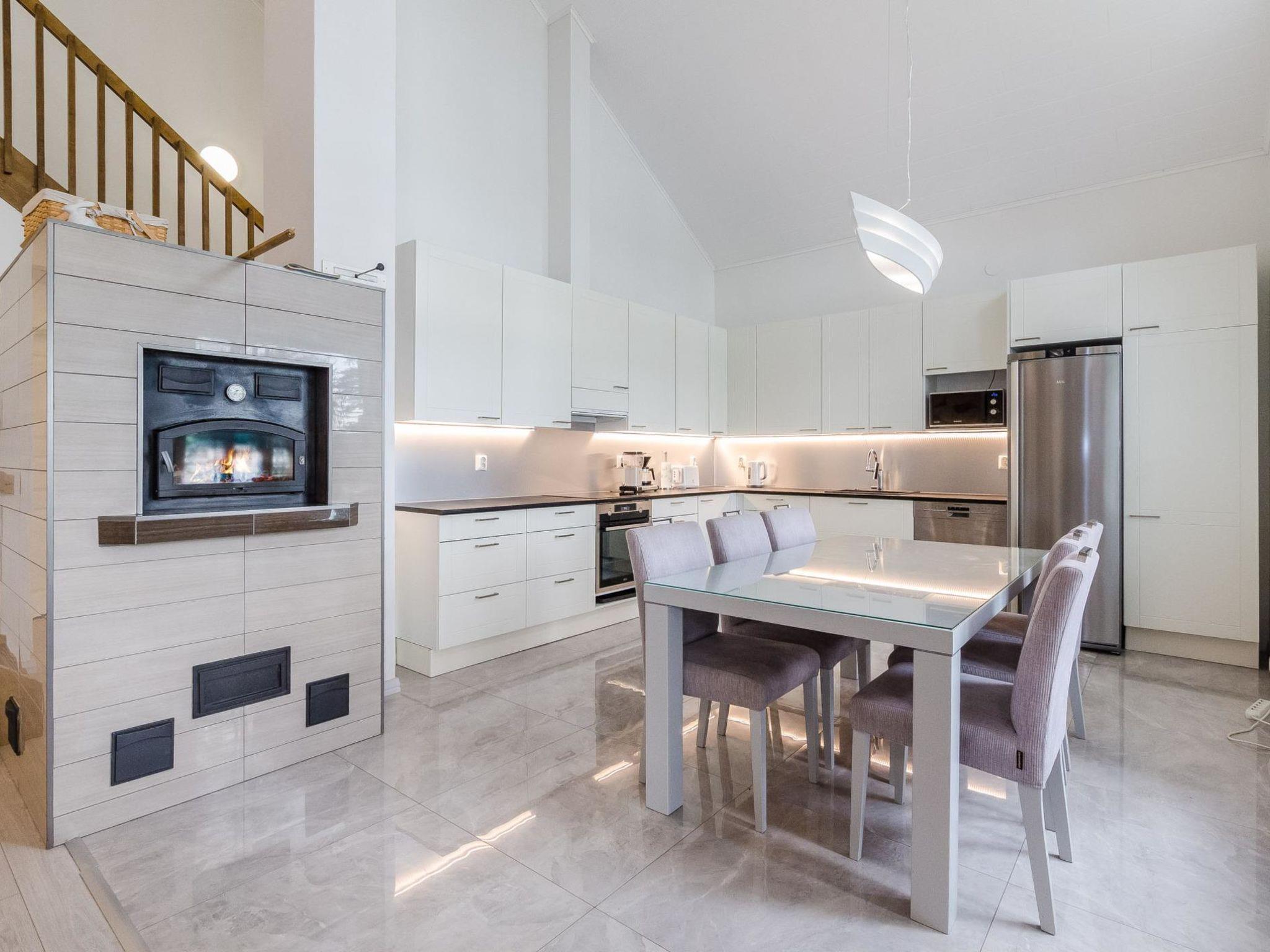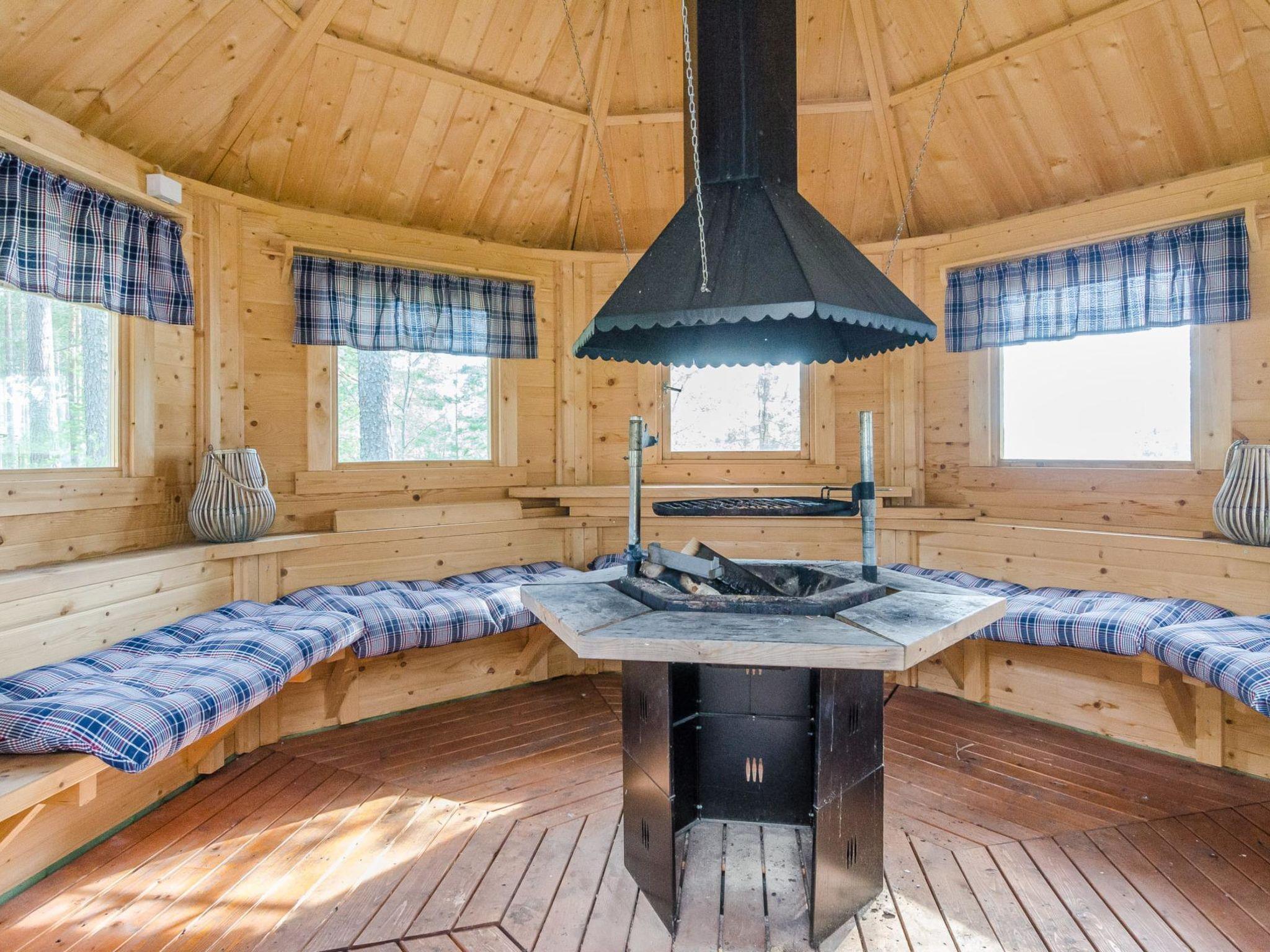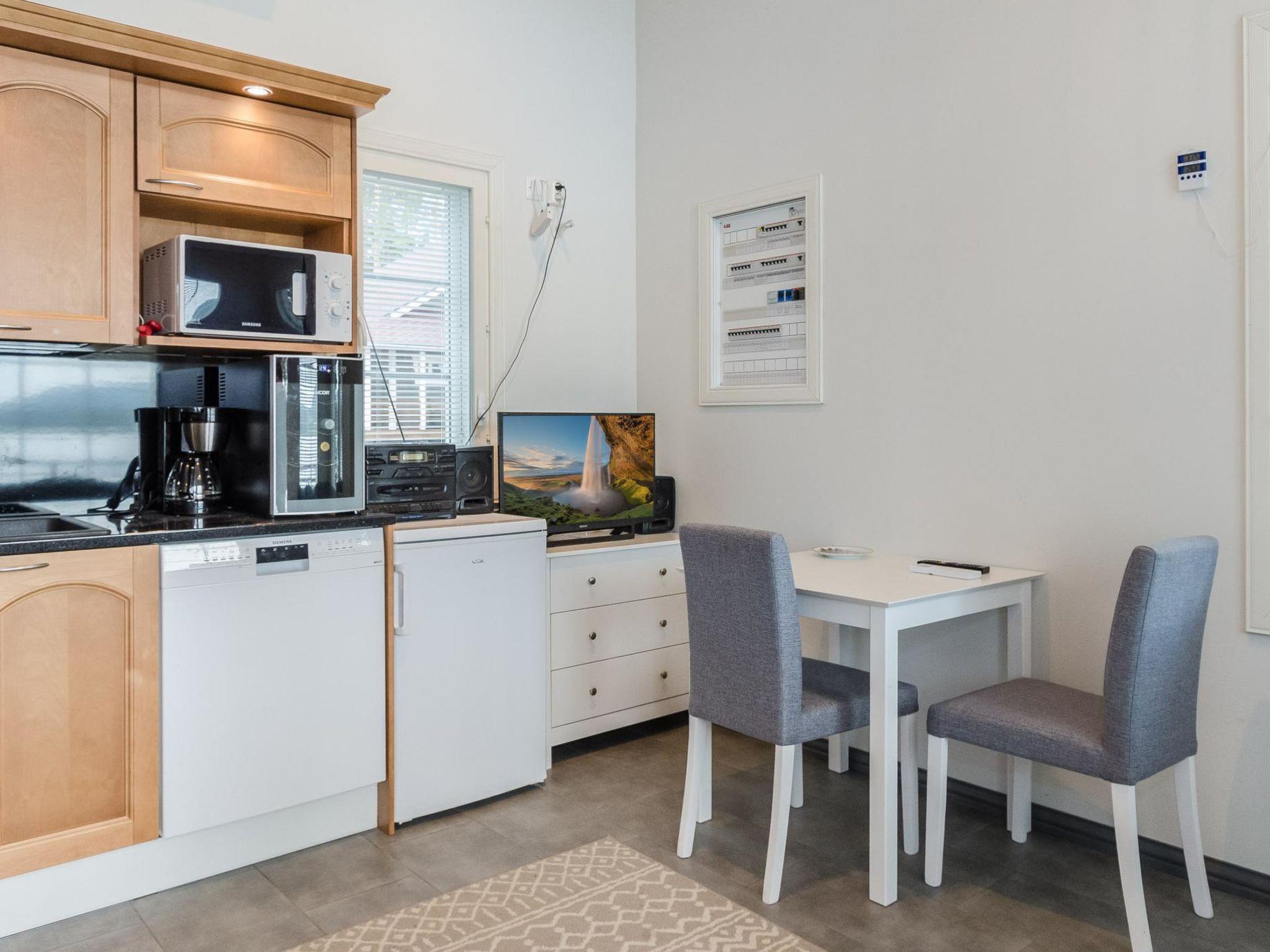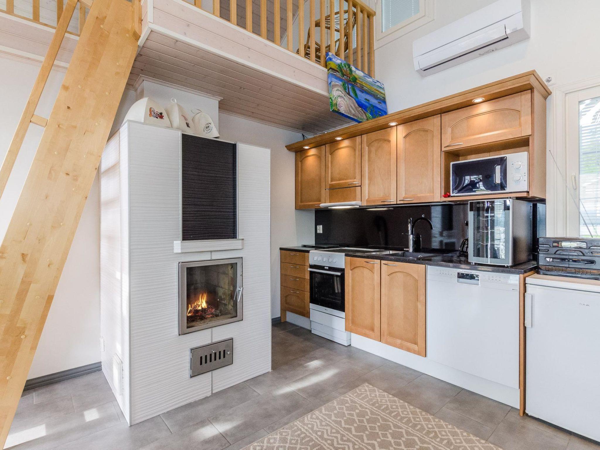 The well-equipped lakeside sauna has a wood-burning sauna stove and a bathroom with a shower and a WC. The sauna's fireplace room has a fully equipped kitchen with an electric stove, dishwasher, microwave, refrigerator, coffee maker, and wine cabinet. Additionally, it has an air-source heat pump, TV, and radio. The loft in the fireplace room has 2 mattresses.
