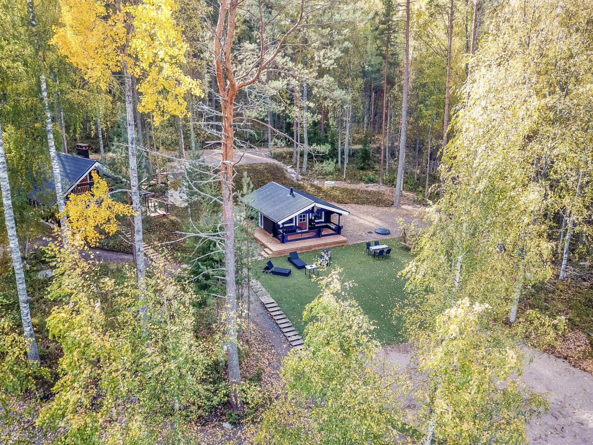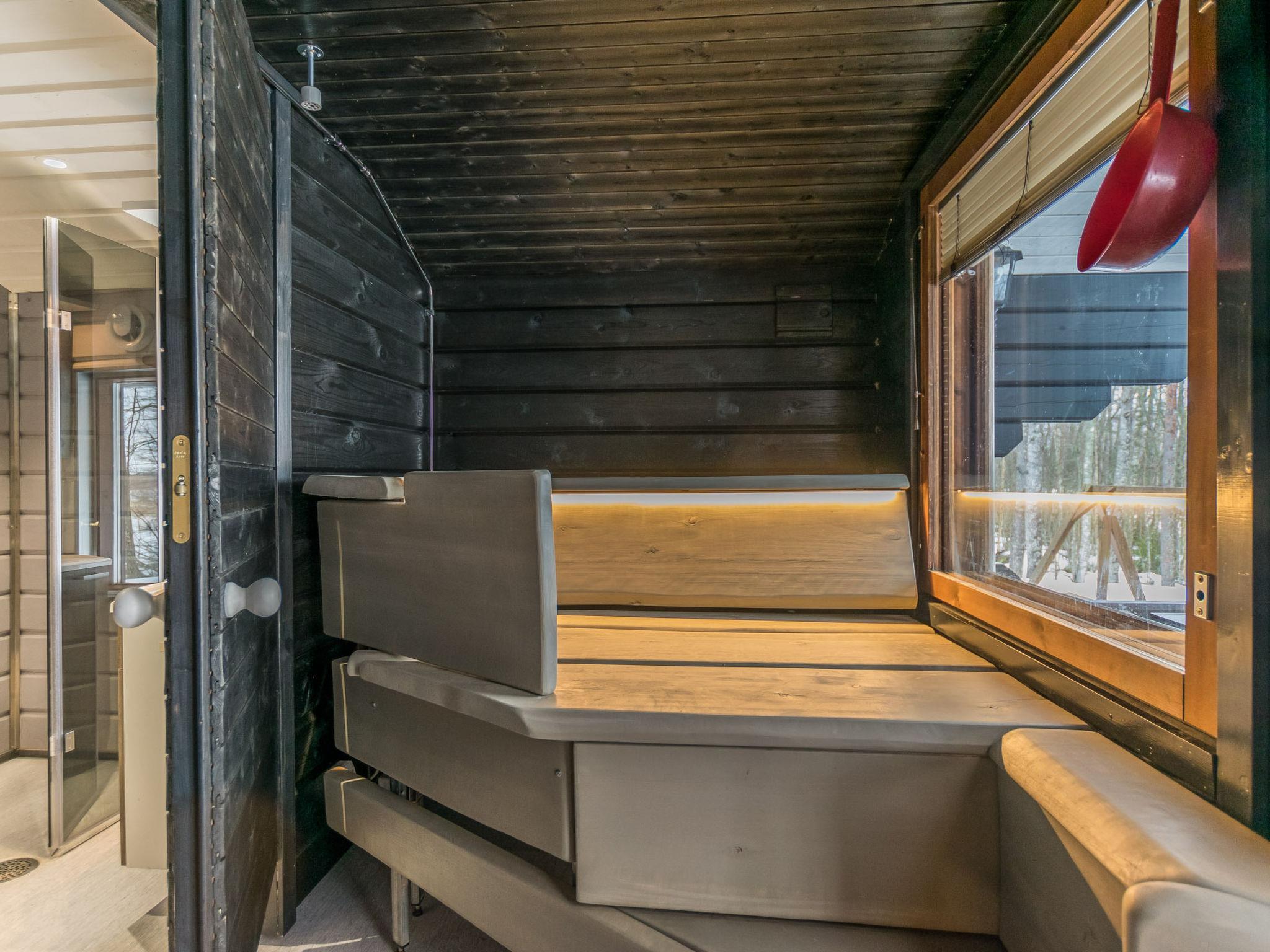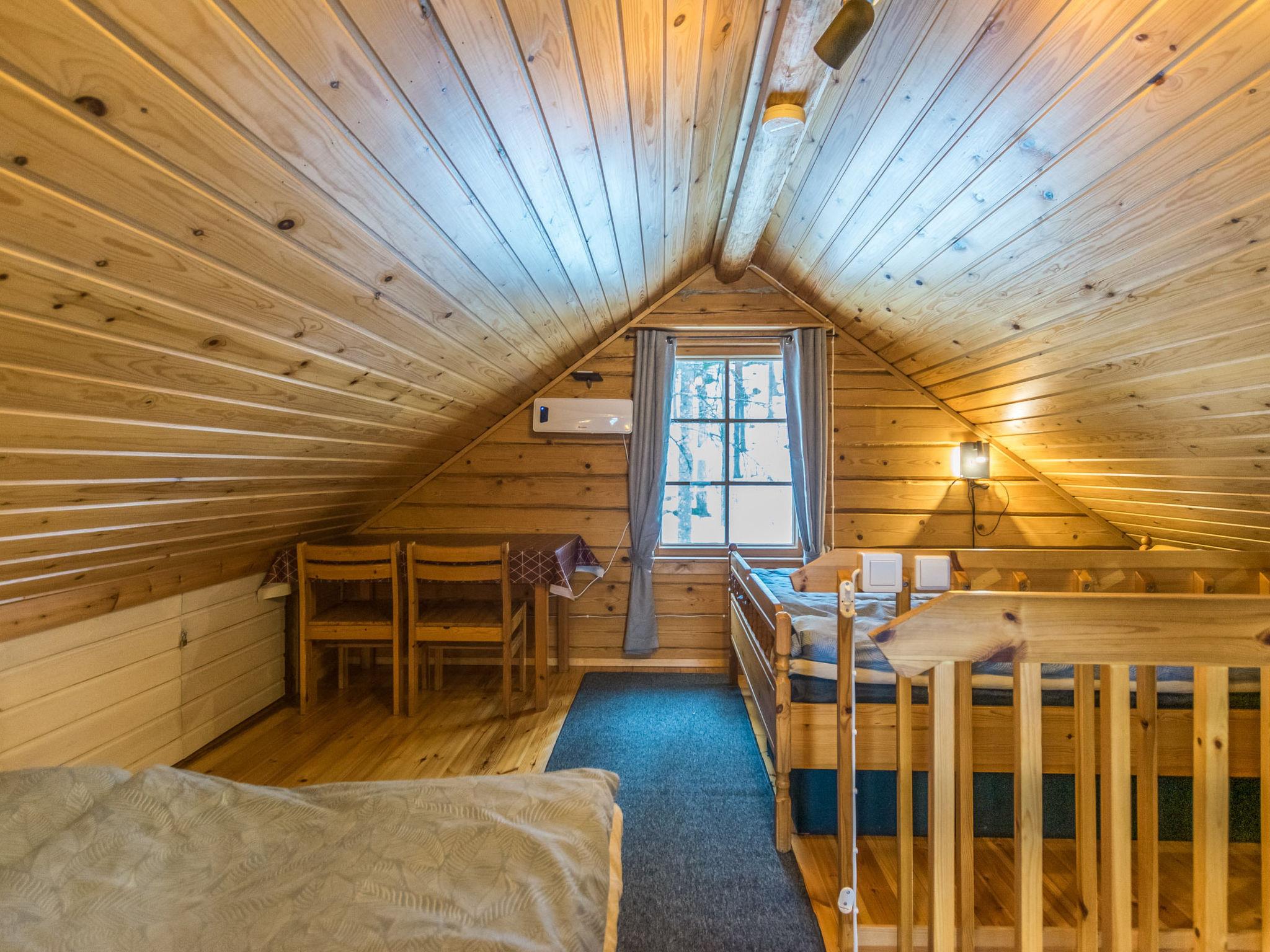 The separate 32 m² wood-heated sauna by the lake includes a dressing room with a fridge/freezer compartment. The washroom has a shower and hand basin. The sauna features a wood-heated stove, with dark walls and light benches creating a peaceful atmosphere. Windows provide a lovely view of the lake and yard. The lakeside sauna includes two sleeping areas – one with a double bed, the other with a 120 x 200 cm bed, and an air source heat pump. Bedside lights here also have USB-A ports.