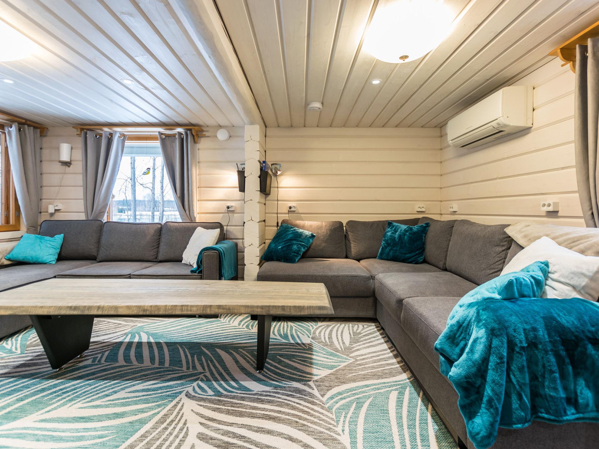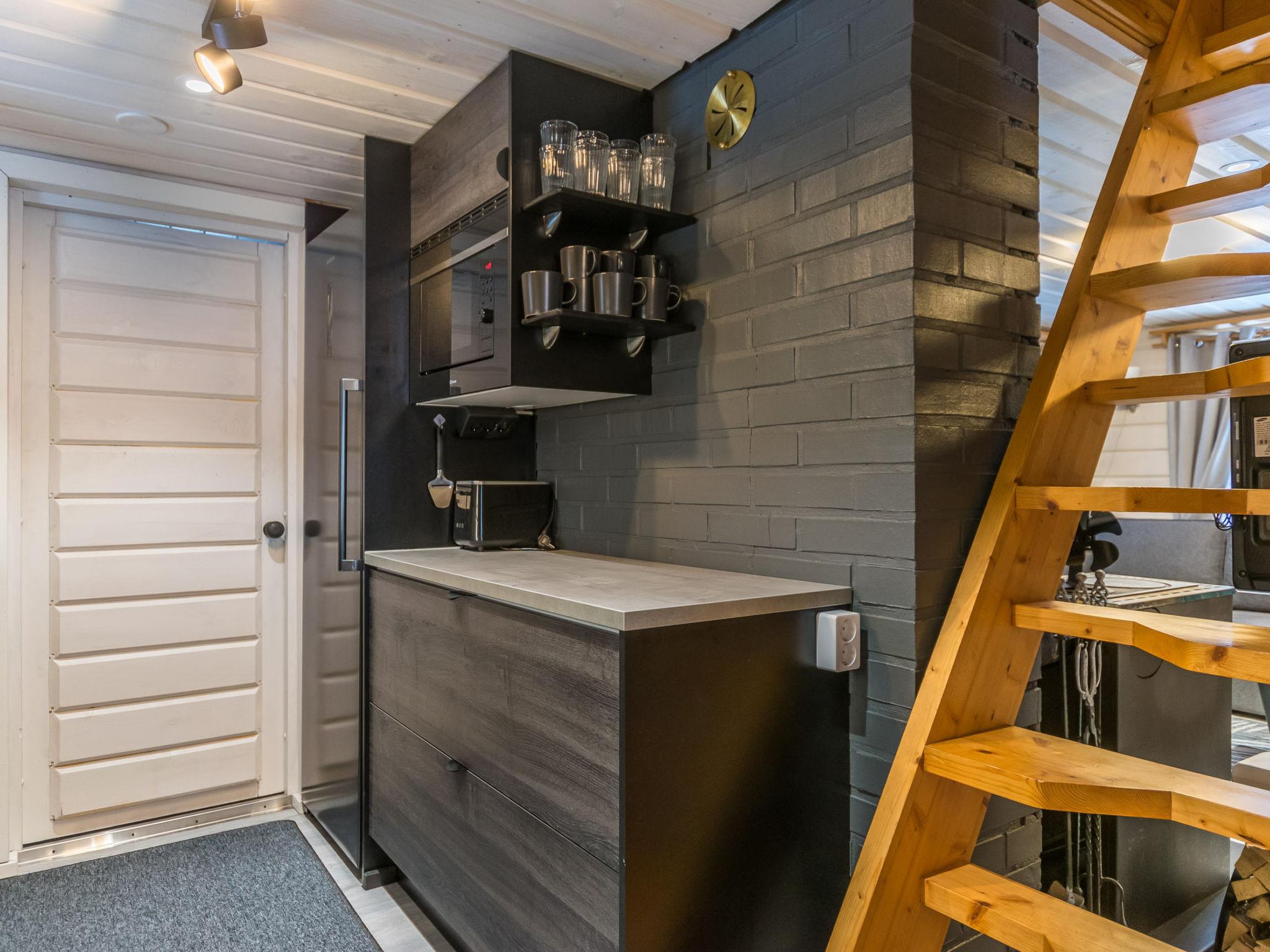 The cabin includes two sofas, a heat-storing fireplace, a wood stove, Google TV, and an air source heat pump. A long dining group seats eight. The stylishly furnished kitchenette is well-equipped for preparing and serving meals. The washroom has a shower cubicle and a WC.