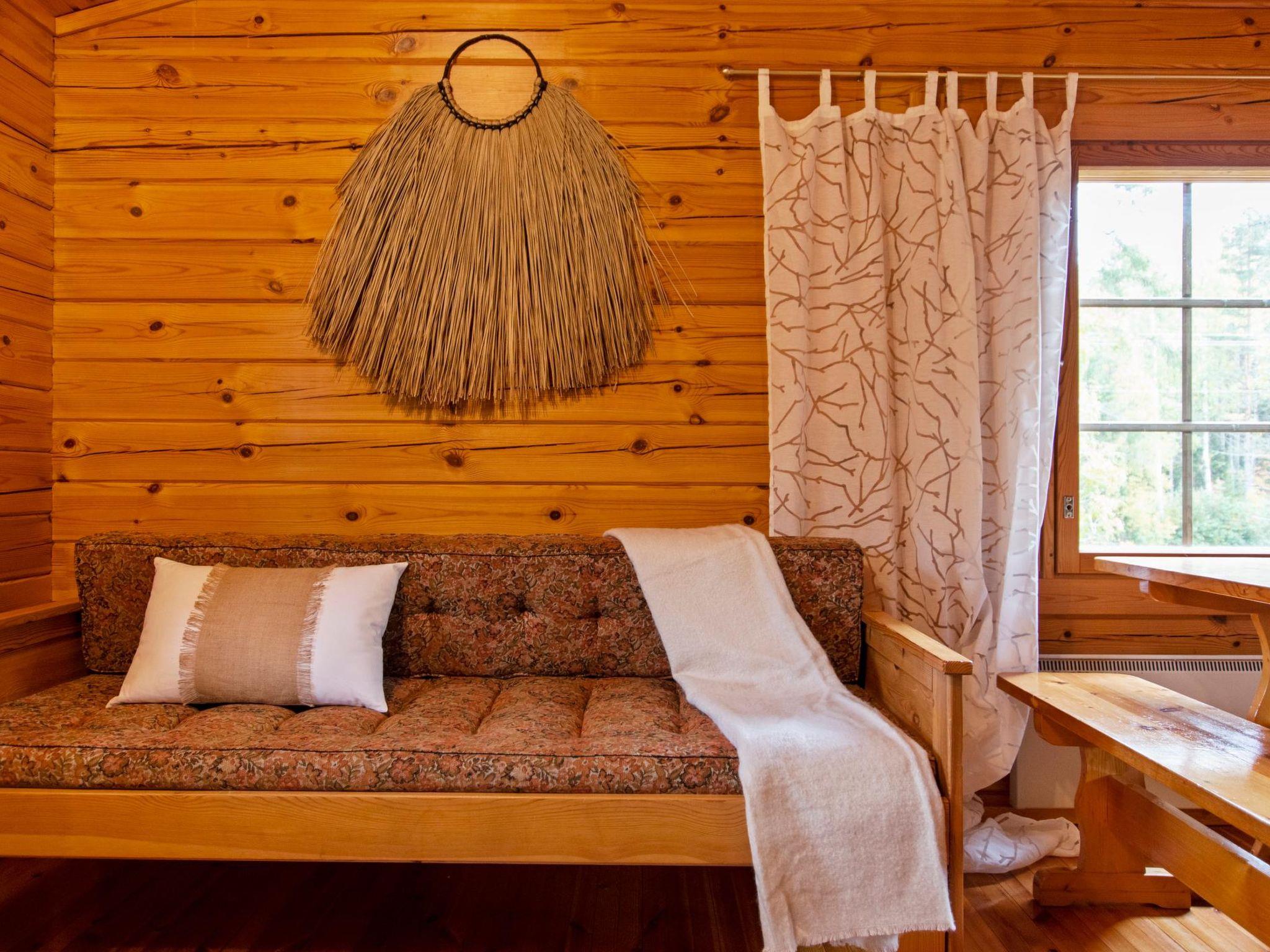 og cabin 1993, living room/kitchen with 2 extra beds, bedroom with 2 beds, dressing room, sauna, open veranda. Access to WC and Sauna through veranda.