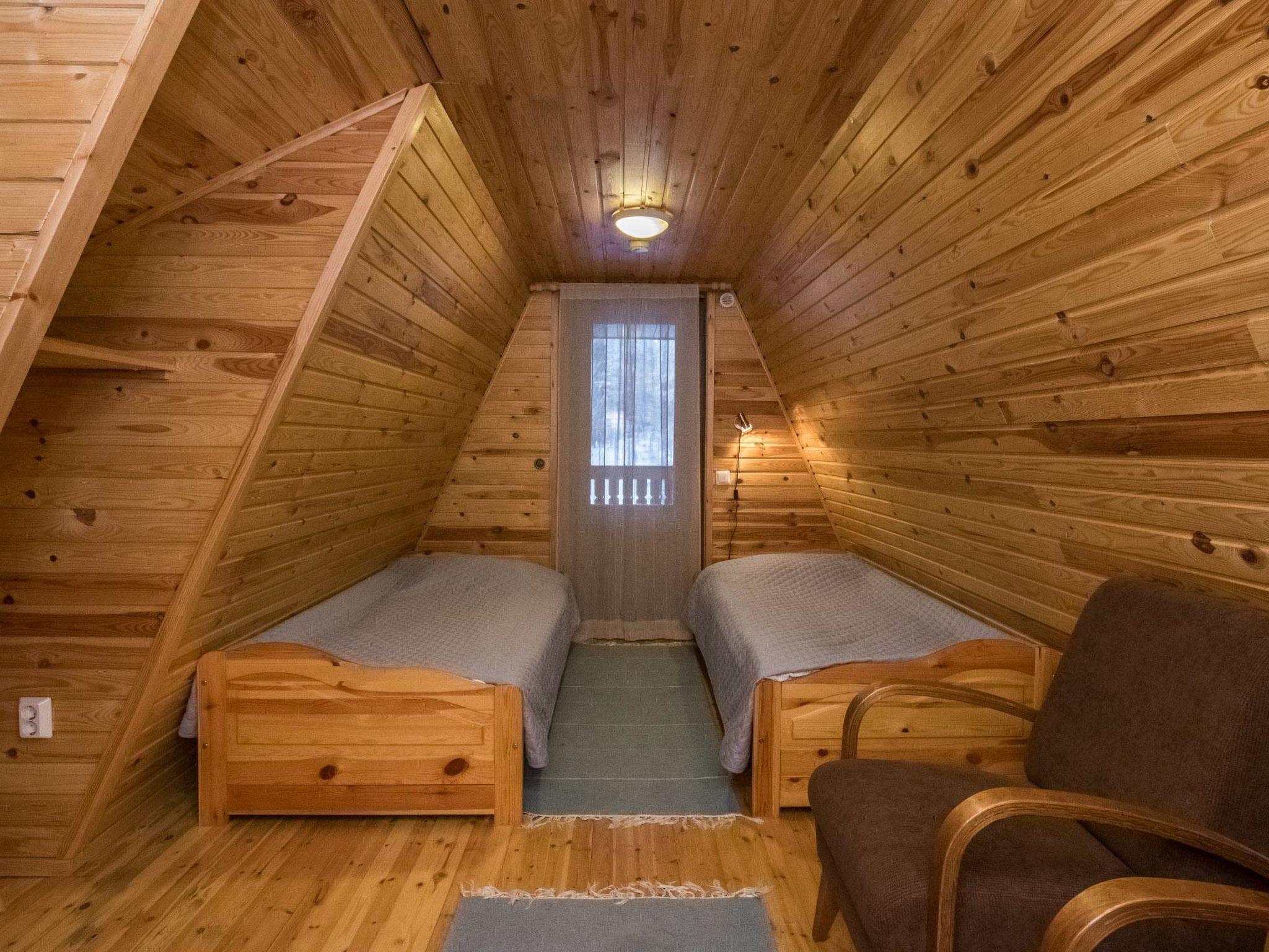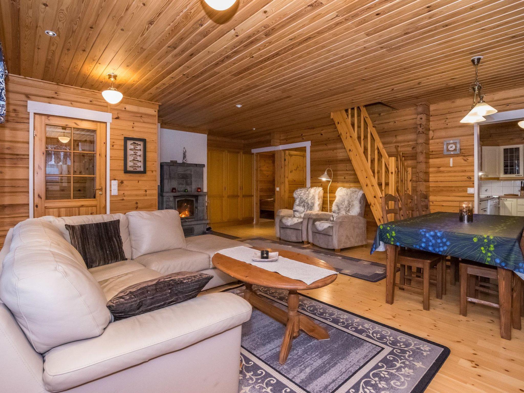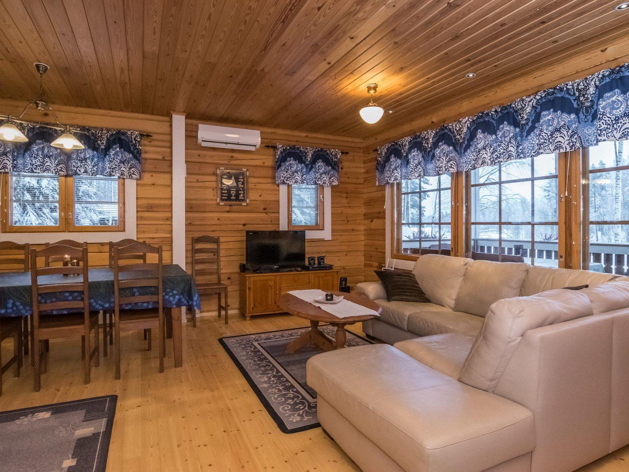 Log cabin 2001, partly renovated in 2017, kitchen, living room, bedroom with double bed and bedroom with 2 single beds, dressing room with toilet, washroom, sauna with electric stove, covered terrace. Air source heat pump, WiFi internet connection. Upstairs: bedroom with one 120 cm wide bed, supstairs lobby with 2 beds, balcony. Steep stairs to the loft, downstairs child safety gate. An additional table and chair are also available by prior arrangement, eg for teleworking.