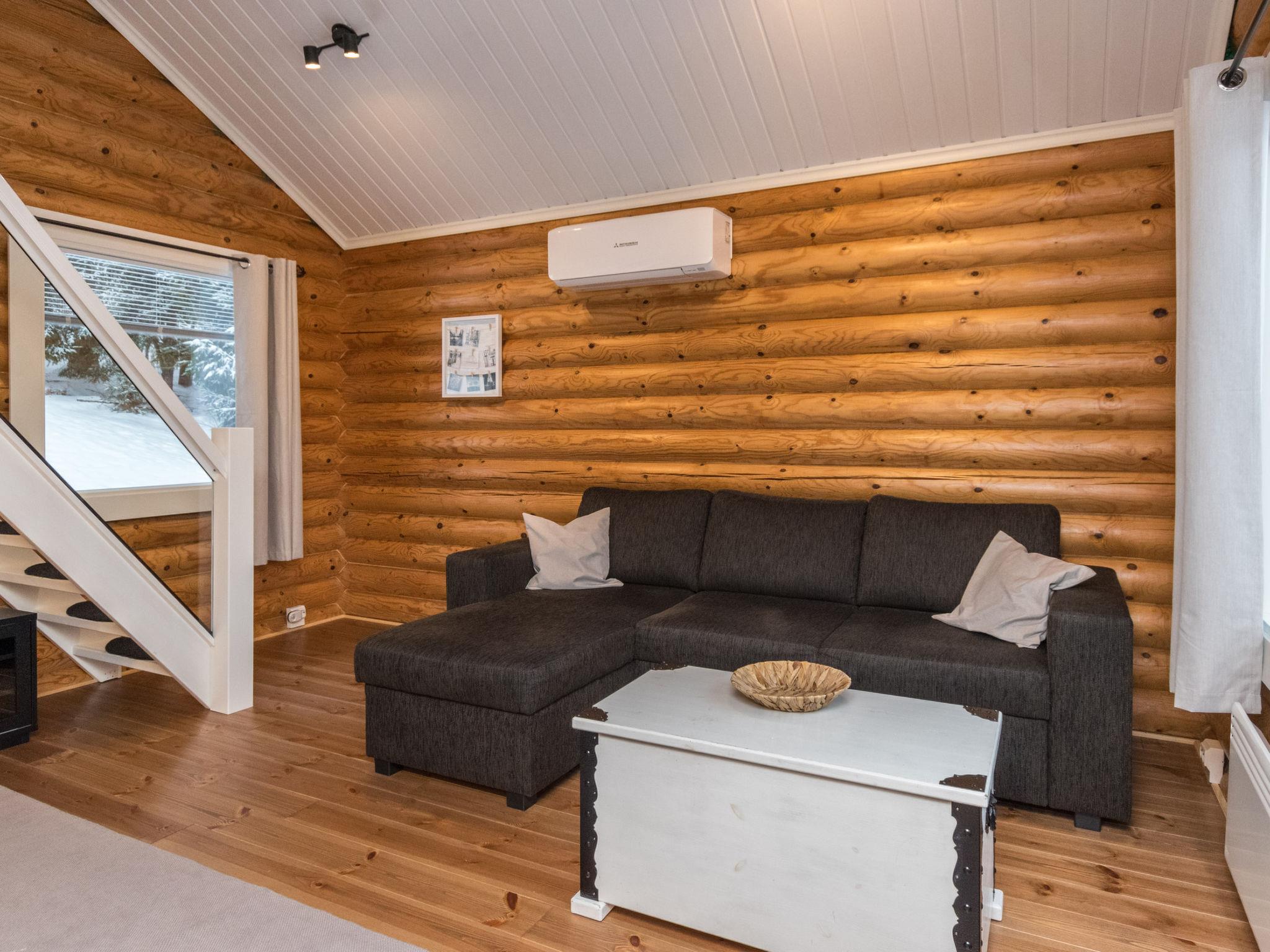 The round-log cabin, built in 2000, features a kitchen, a living room with a sofa bed for two, a Bluetooth speaker, and a PlayStation 3. The sleeping loft has a double bed and a child safety gate at the top of the stairs. The bathroom has a WC and shower, and the cabin has a hallway and a large open terrace.