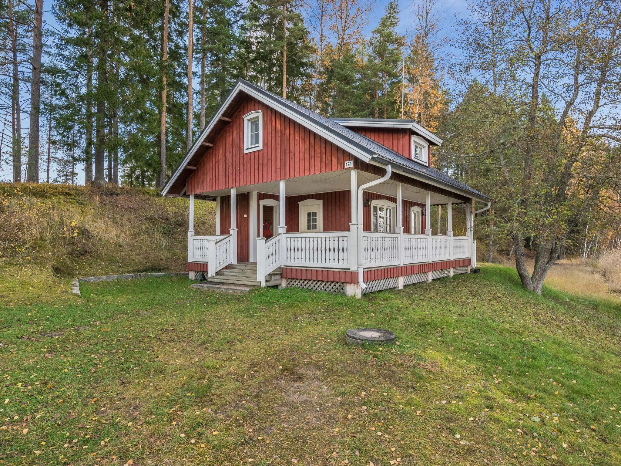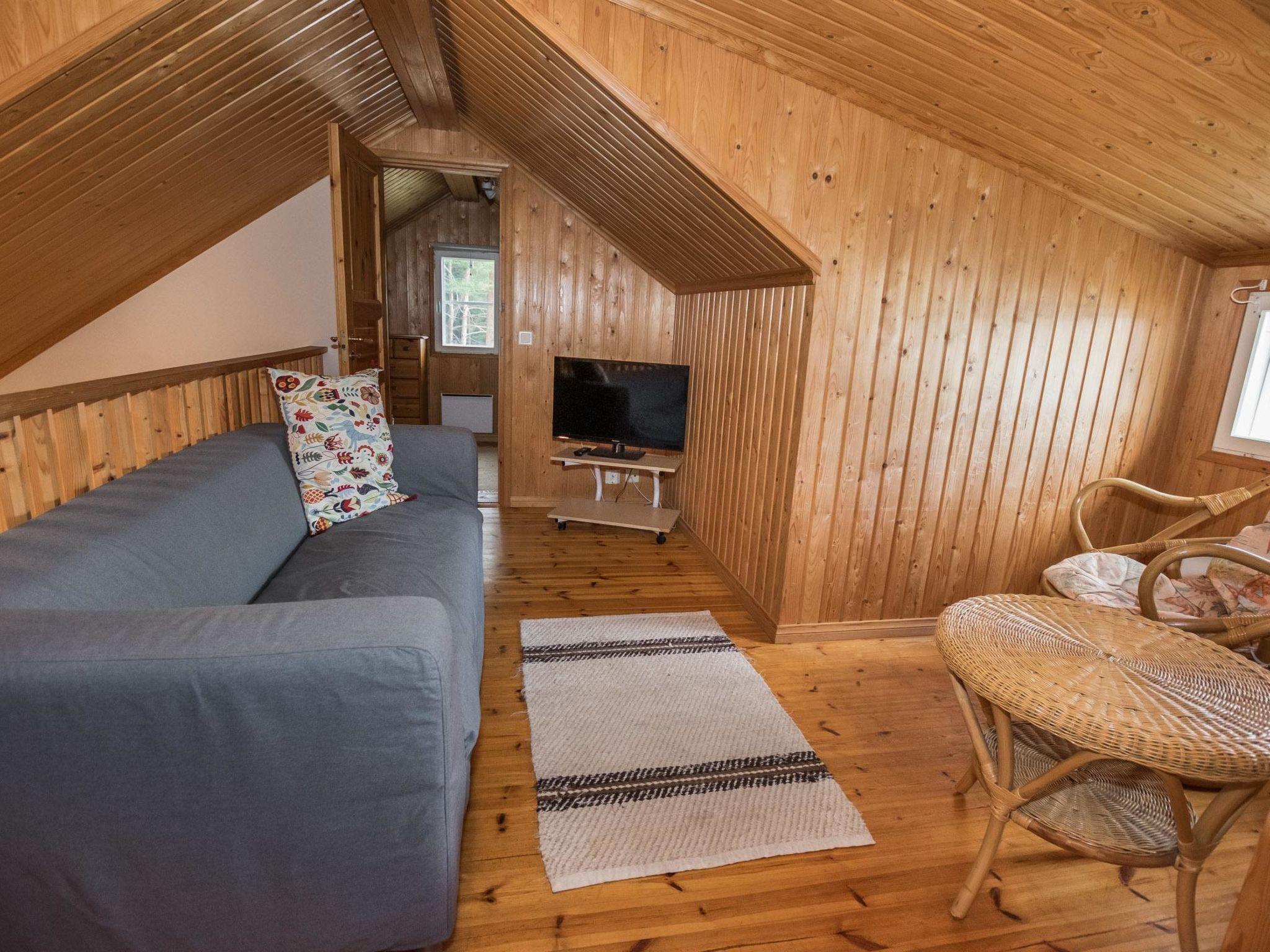 Wooden cabin 1999 in downstairs: living room/kitchen and terrace. In cottage upper floor: small bedroom (120 x 200 cm), sleeping alcove one double bed + cot, washroom, sauna (electric stove).