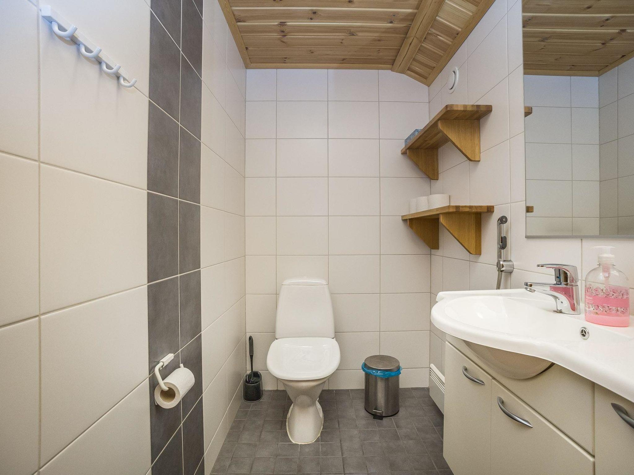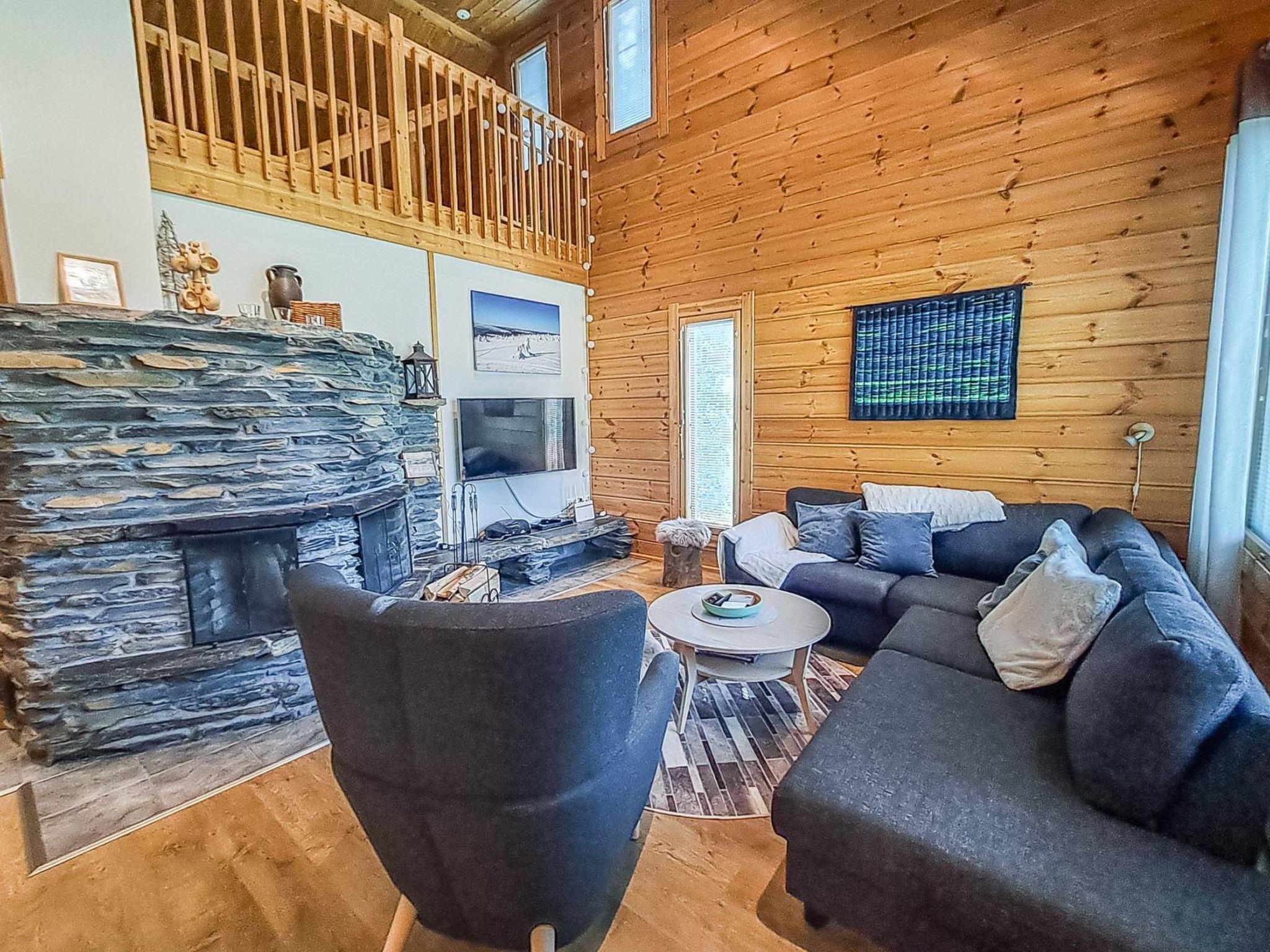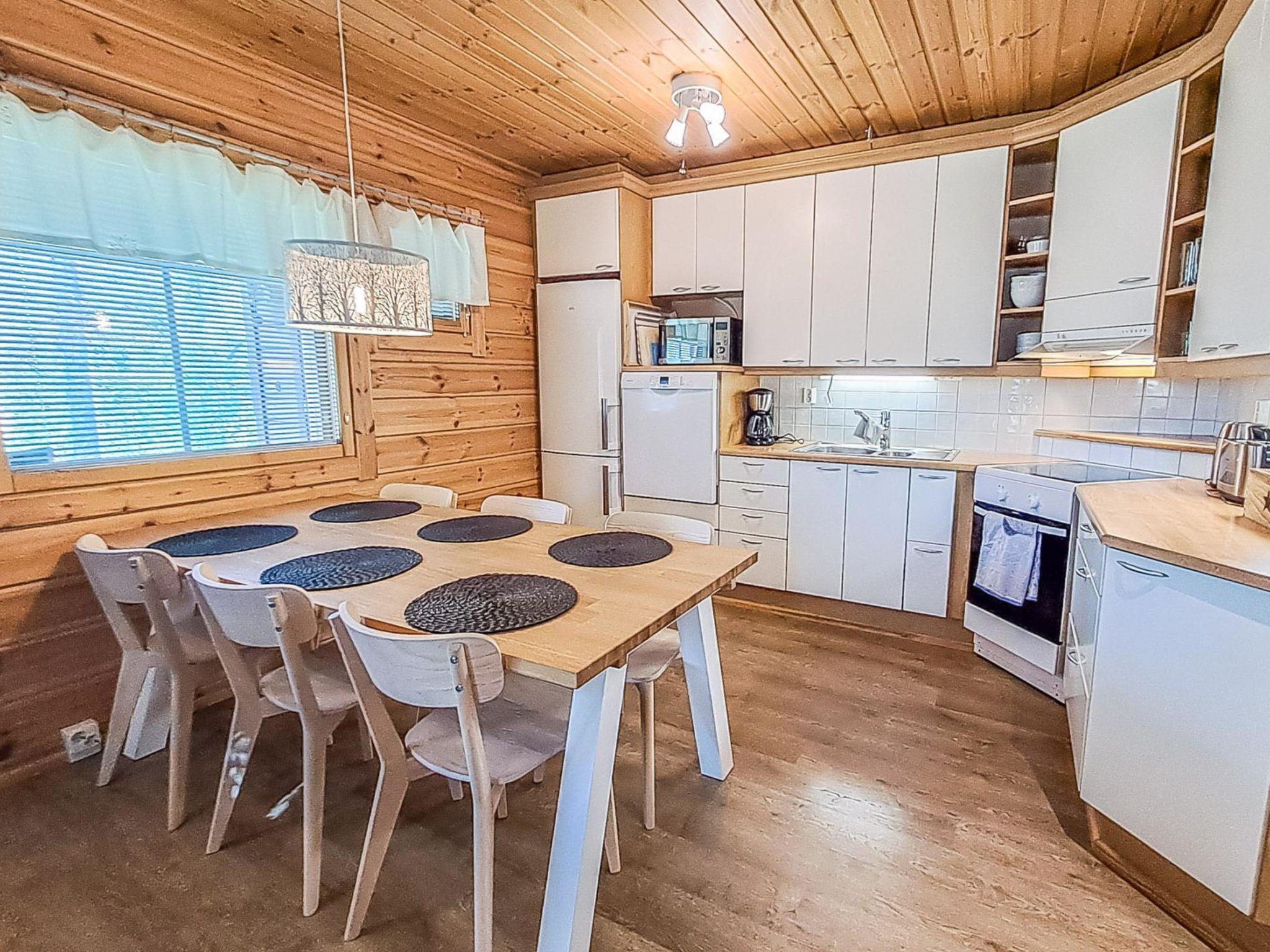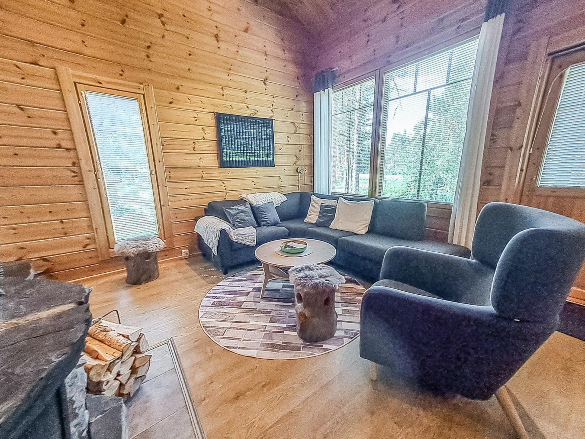 The well-equipped kitchen, cozy living area, and bathroom with an electric sauna provide a great setting for a relaxing vacation.