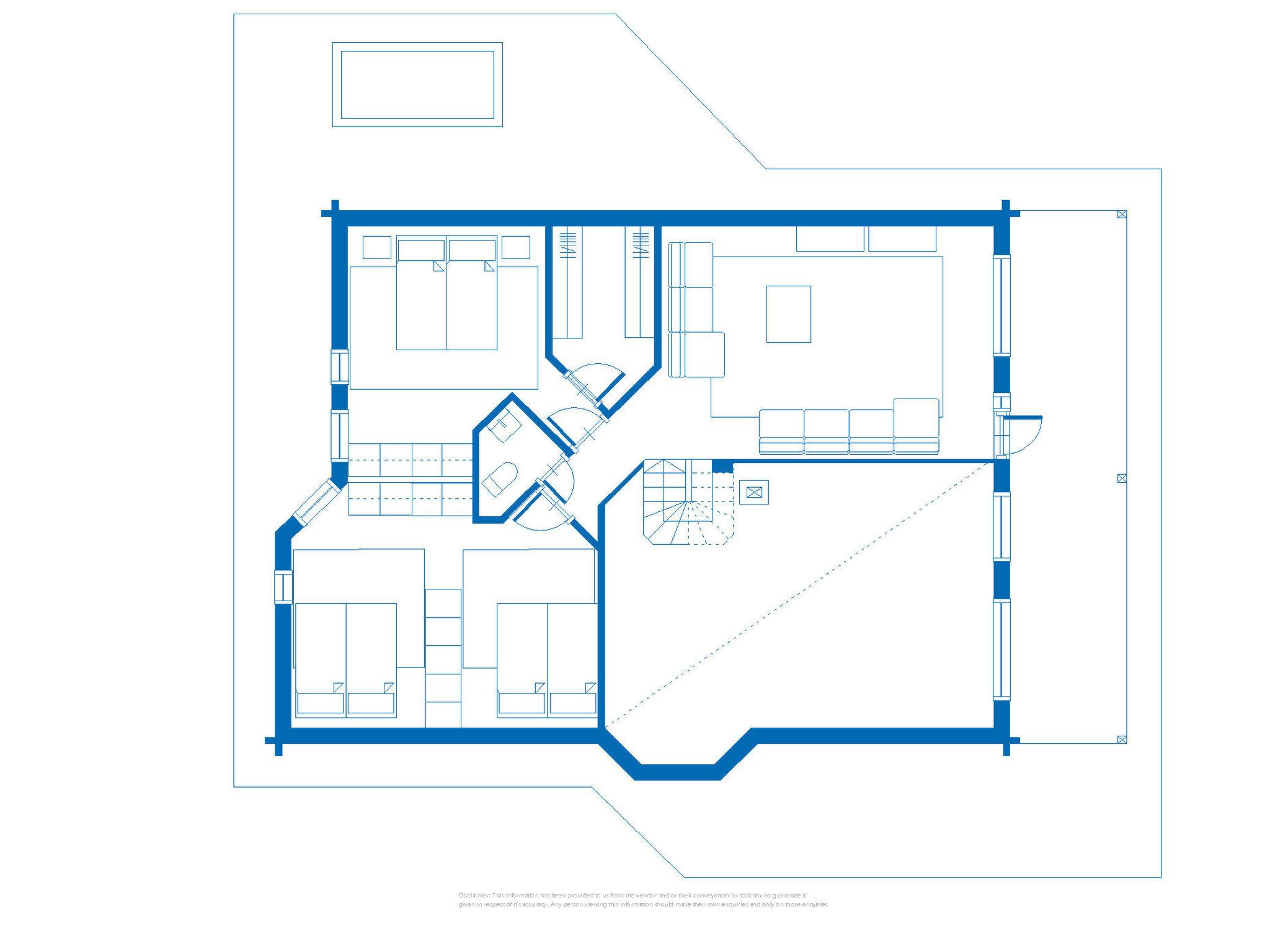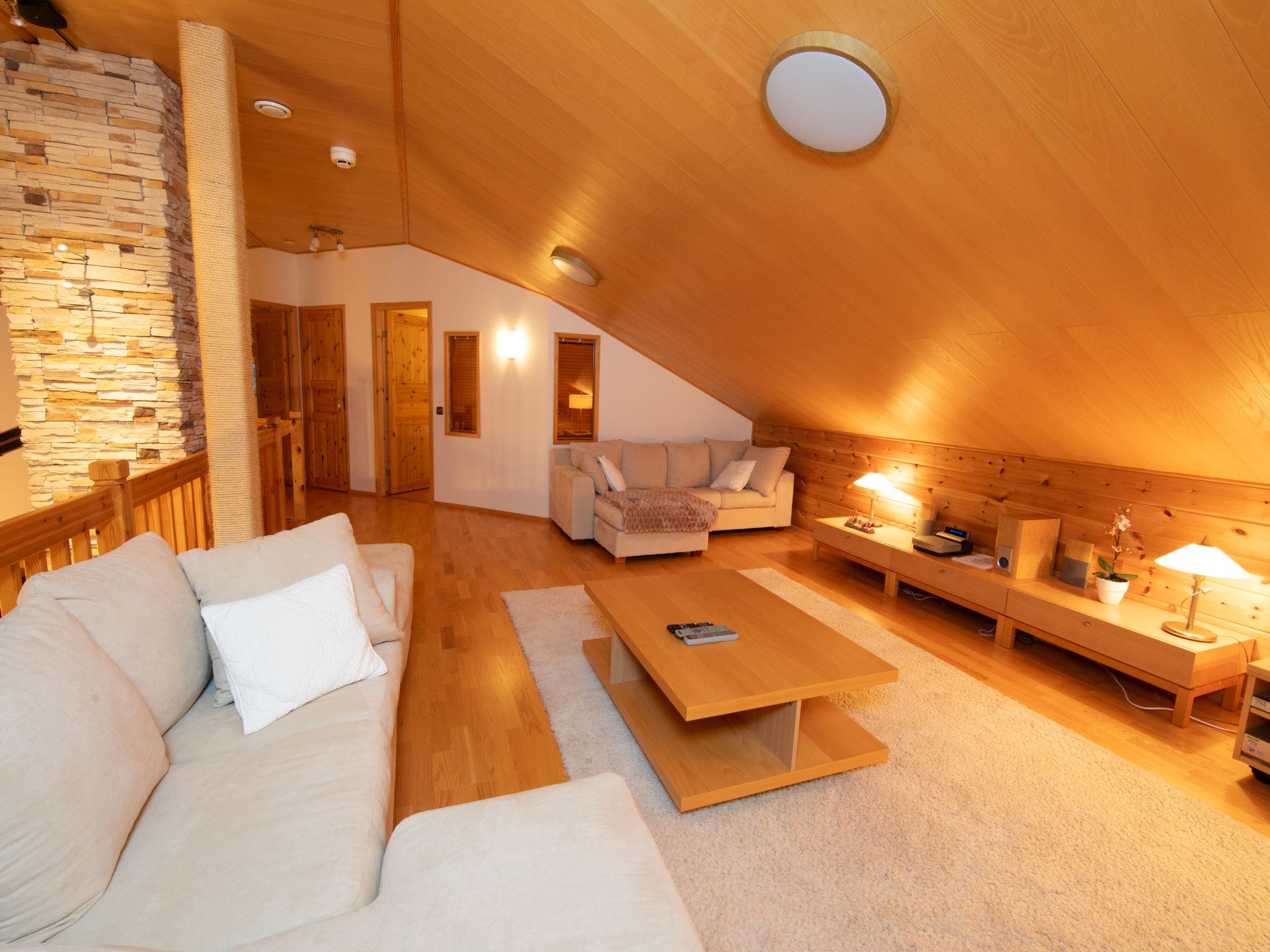 There are two bedrooms upstairs. The first bedroom has two 80 cm wide beds. The second bedroom is divided into two parts, and there are four beds in total (4 x 80 cm). There is also a separate toilet upstairs and a spacious and comfortable living area in the loft.