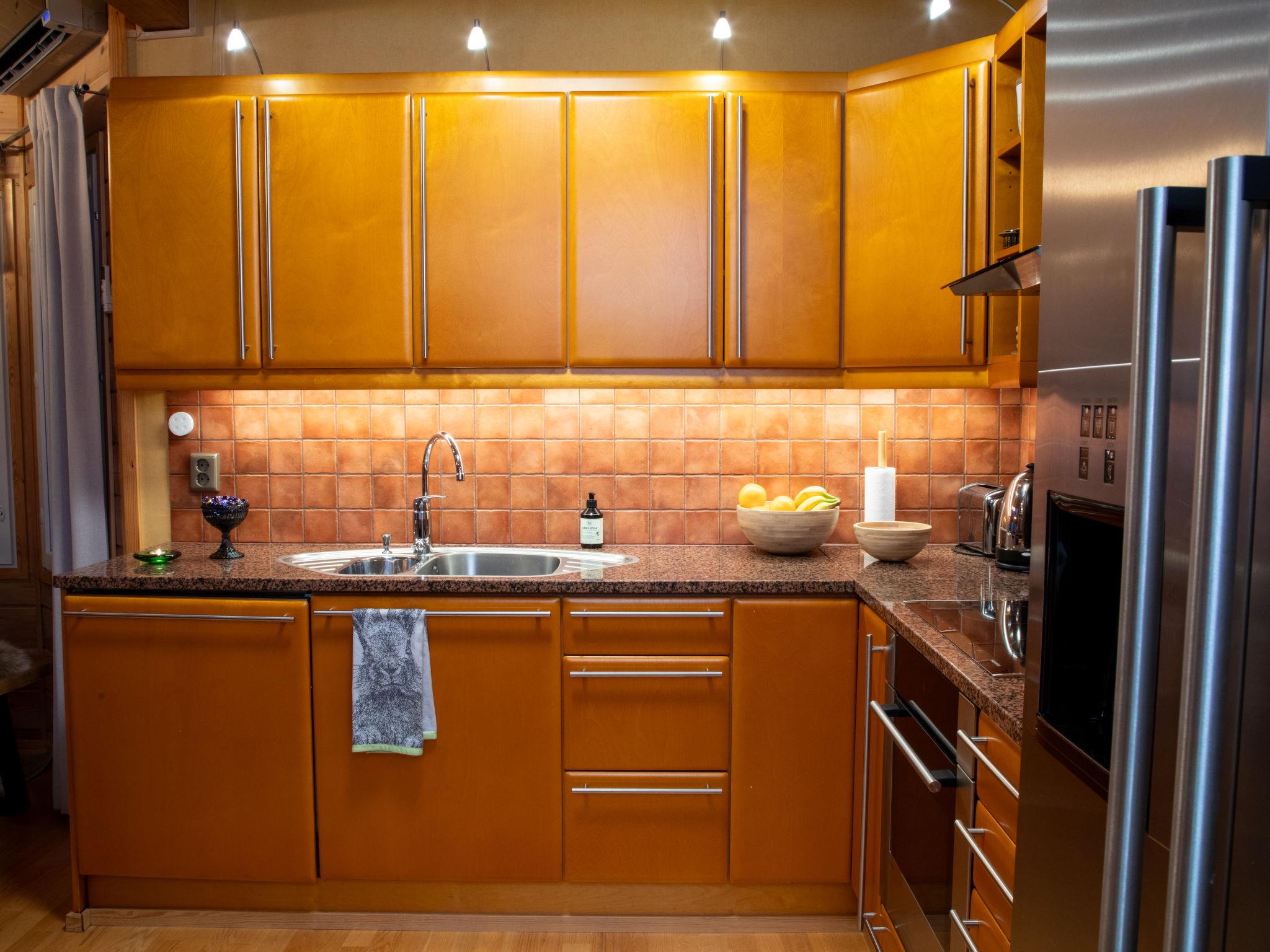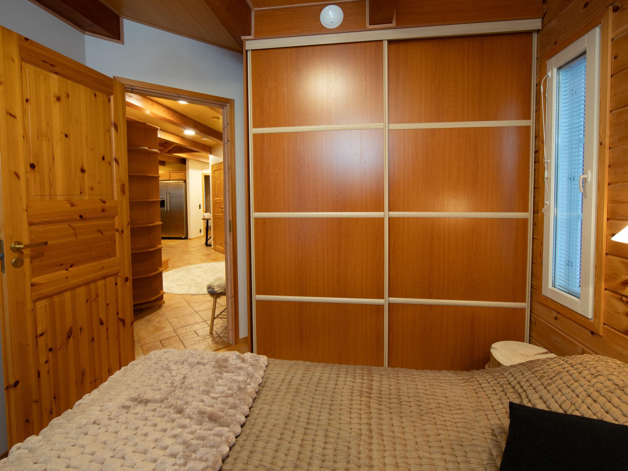 The log cabin, built in 2003, offers functional and comfortable spaces on two floors. The downstairs has an atmospheric living room with a large and comfortable sofa and a fireplace that creates warmth and coziness. The open kitchen and dining area make getting together effortless and comfortable. There are also two bedrooms downstairs, both with double beds. There is plenty of storage space for outdoor clothing in the hallway.