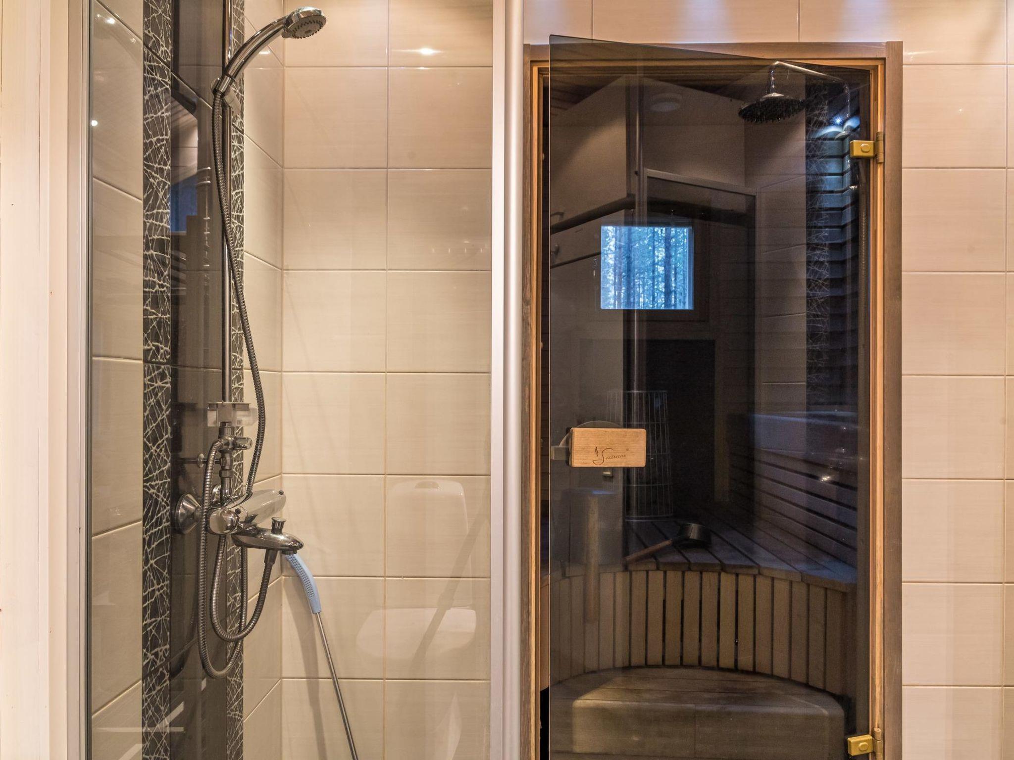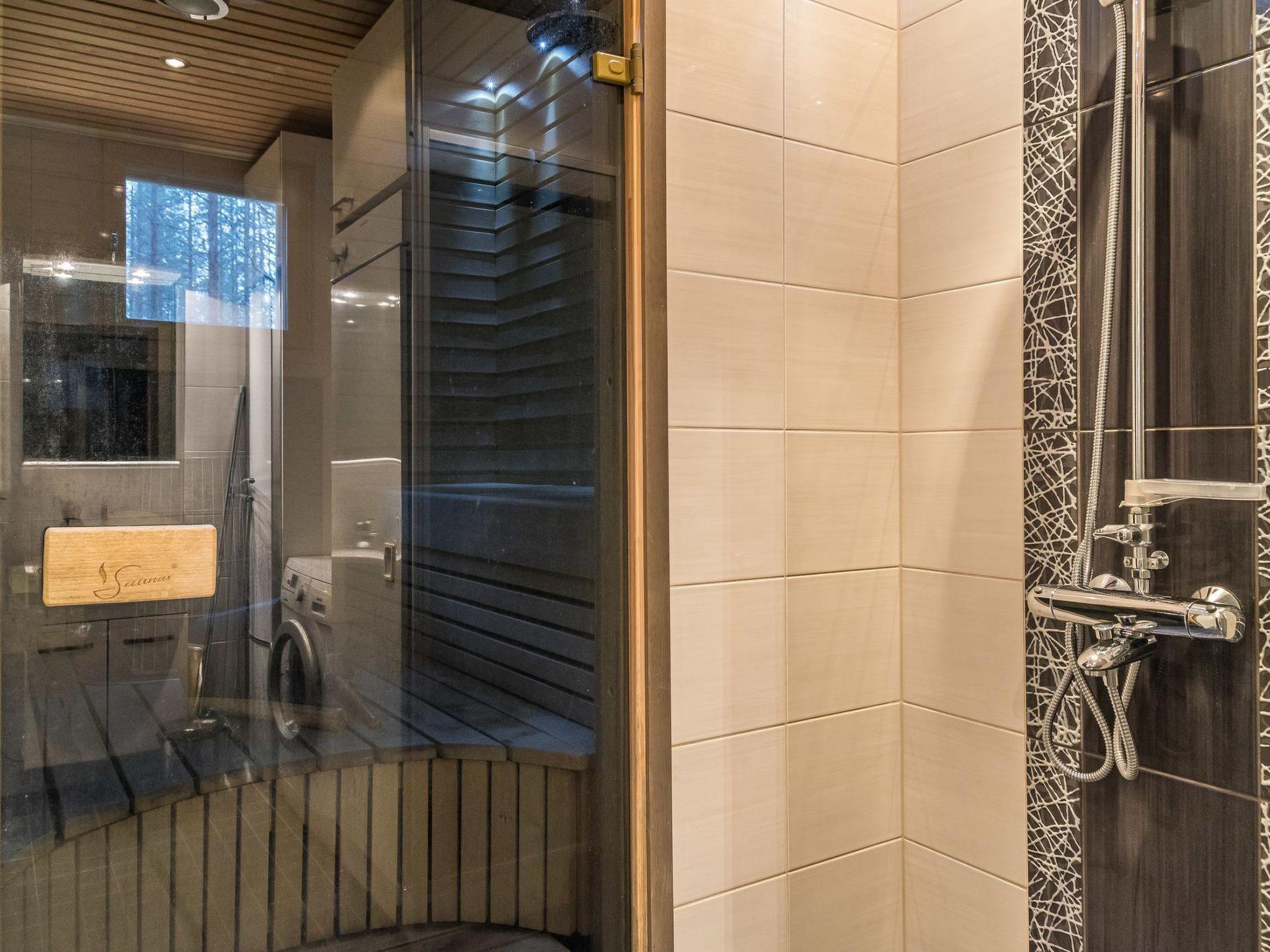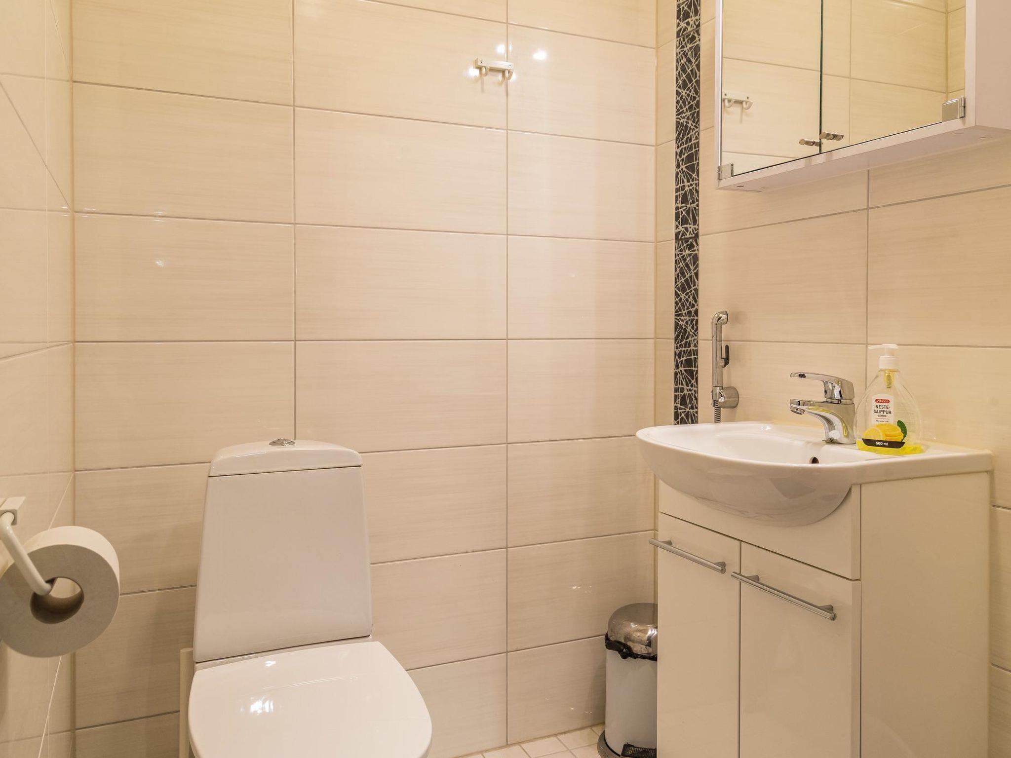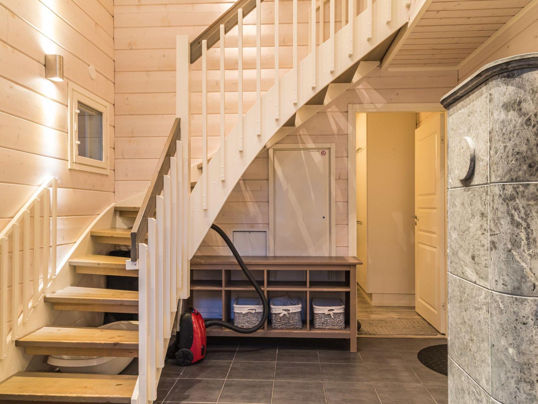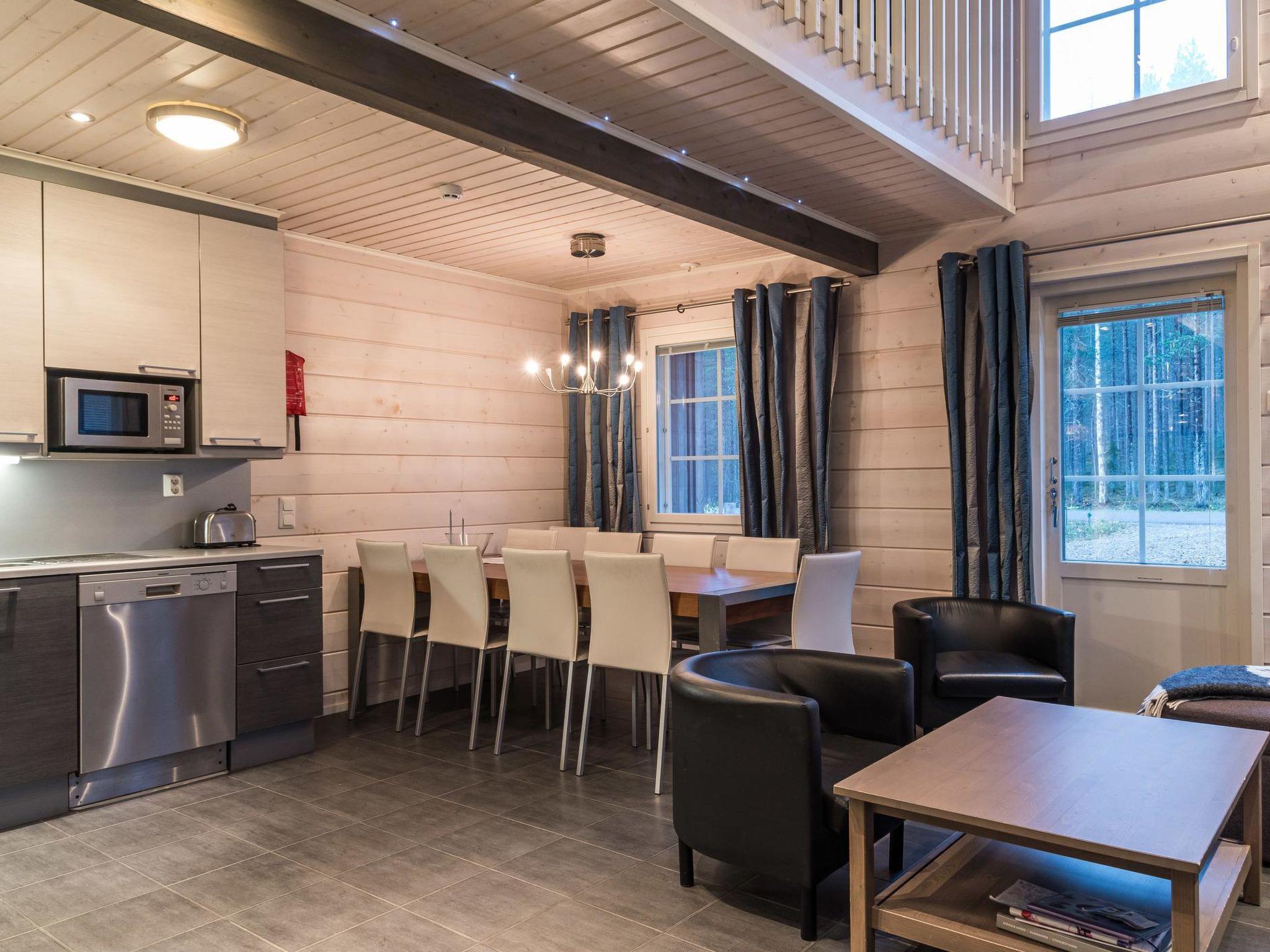 One half (apartment) of semi-detached log panel house unit 2011. Downstairs: living room/kitchen convertible sofa/bed, bedroom 2 beds, sauna (electric stove), washroom (2 showers), WC. Upstairs: 2 bedrooms with 2 beds in each, loft lounge convertible sofa/bed, balcony, a WC also upstairs. Child’s travel bed. Child gate on the stairs both on the upper floor and on the ground floor.