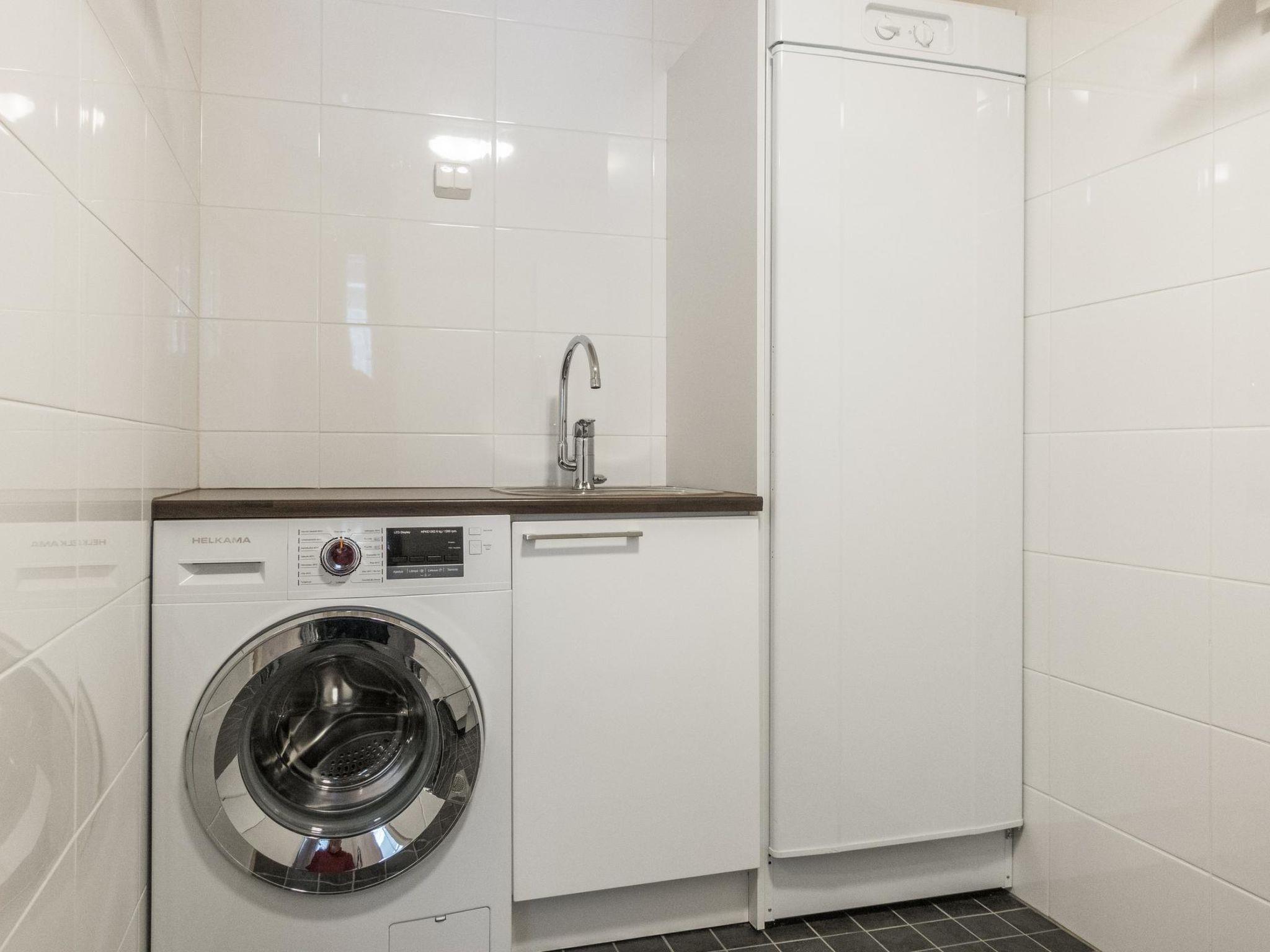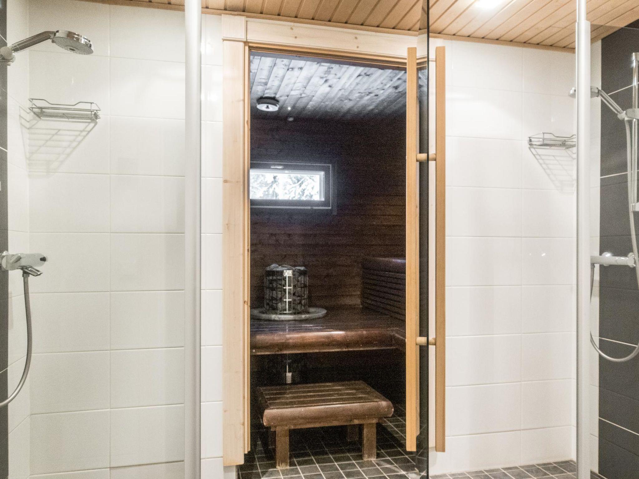 Downstairs: living room/kitchen, bedroom 2 beds, sauna (electric stove), washroom (2 showers), utility room, WC and open porch.