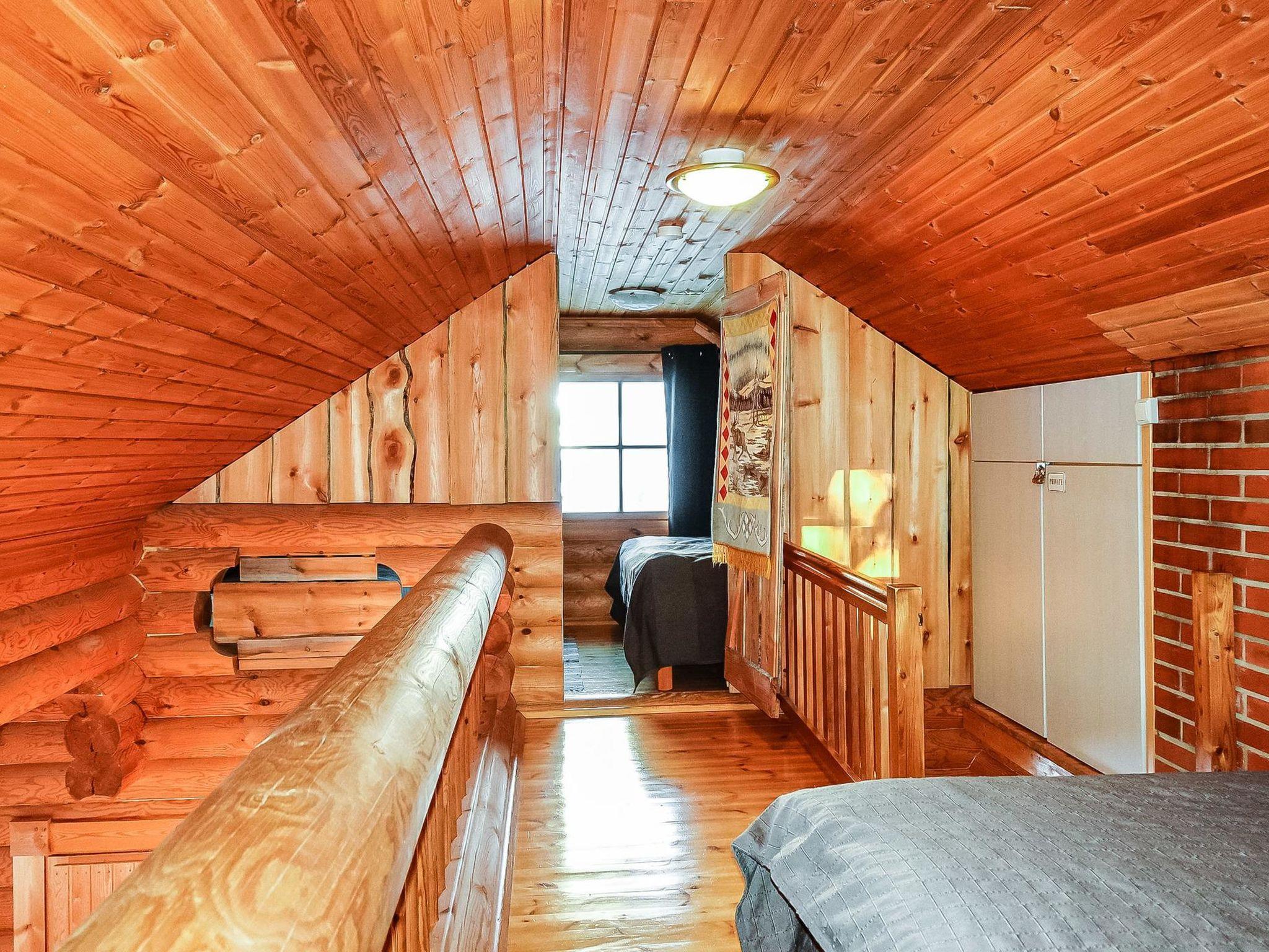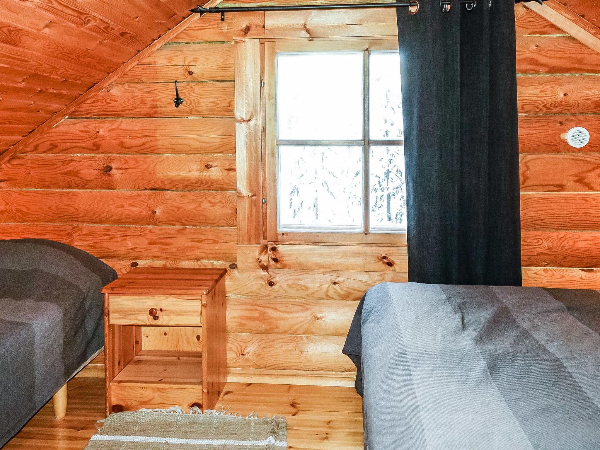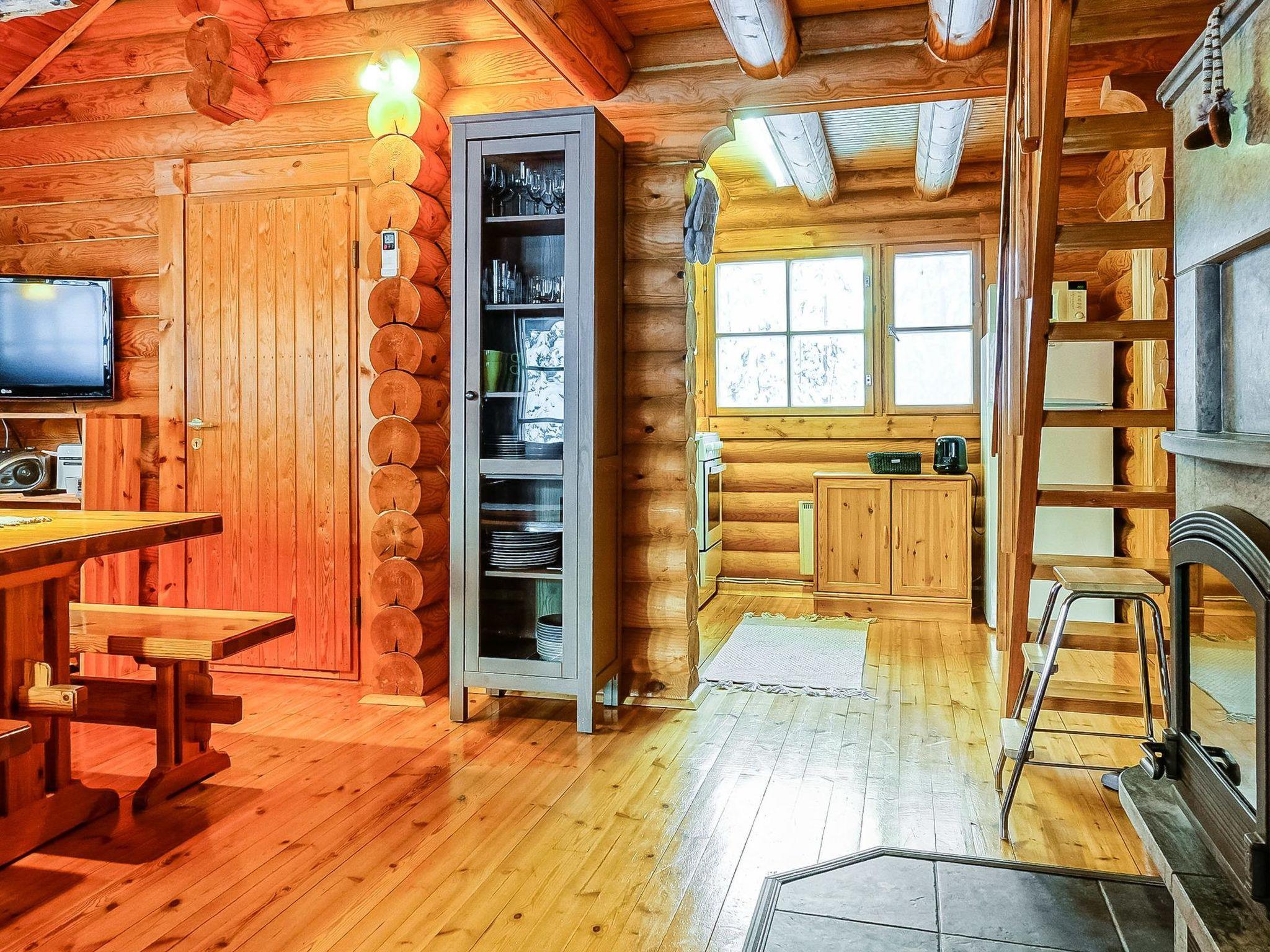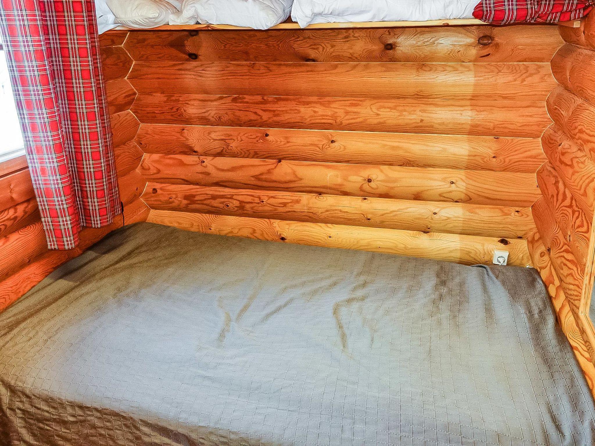 Log cabin, built in 1991, renovated later. Kitchen-living room, 2 bedrooms, both with 1 single bed (width 120 cm), bedroom upstairs (sloping roof) with 3 single beds, loft area has two single beds. Sauna (wood-burning stove), shower room / toilet, covered porch. Barbecue hut; electric light and power socket. Lockable (cold) storage for firewood, suitable also for preservation and maintenance of skis.