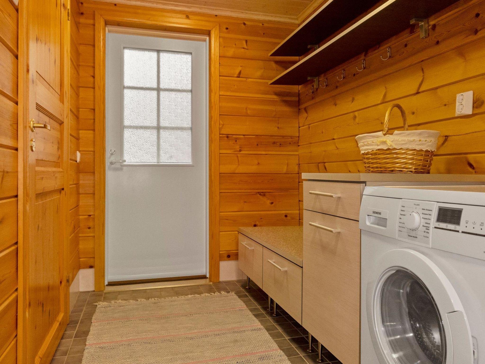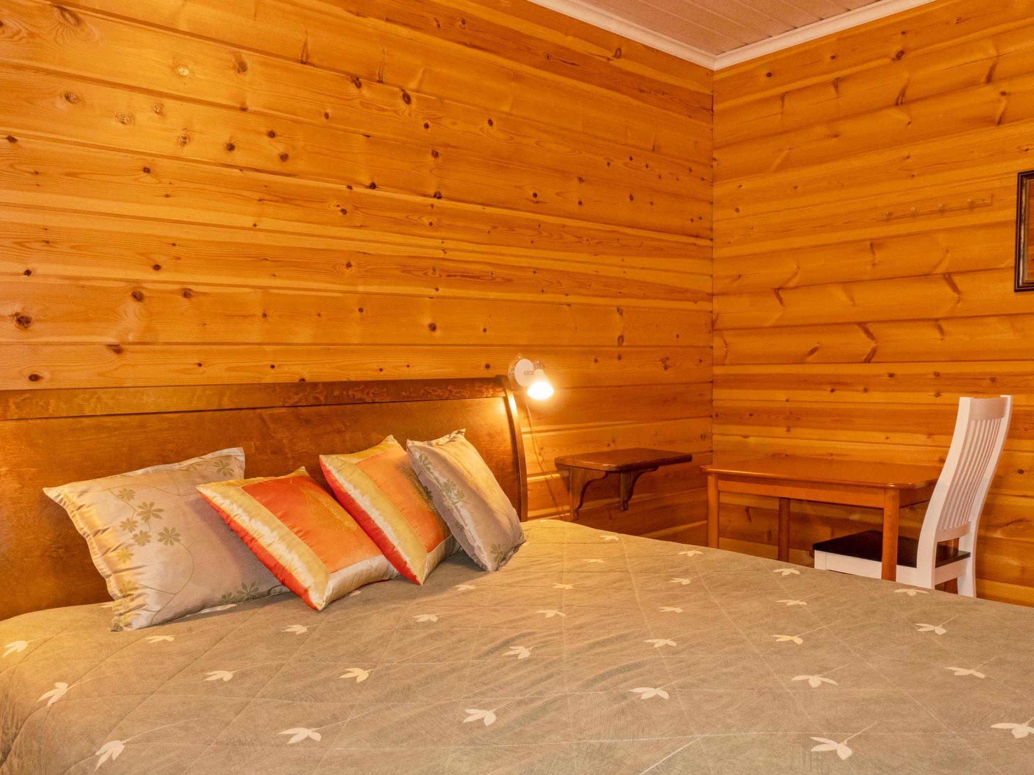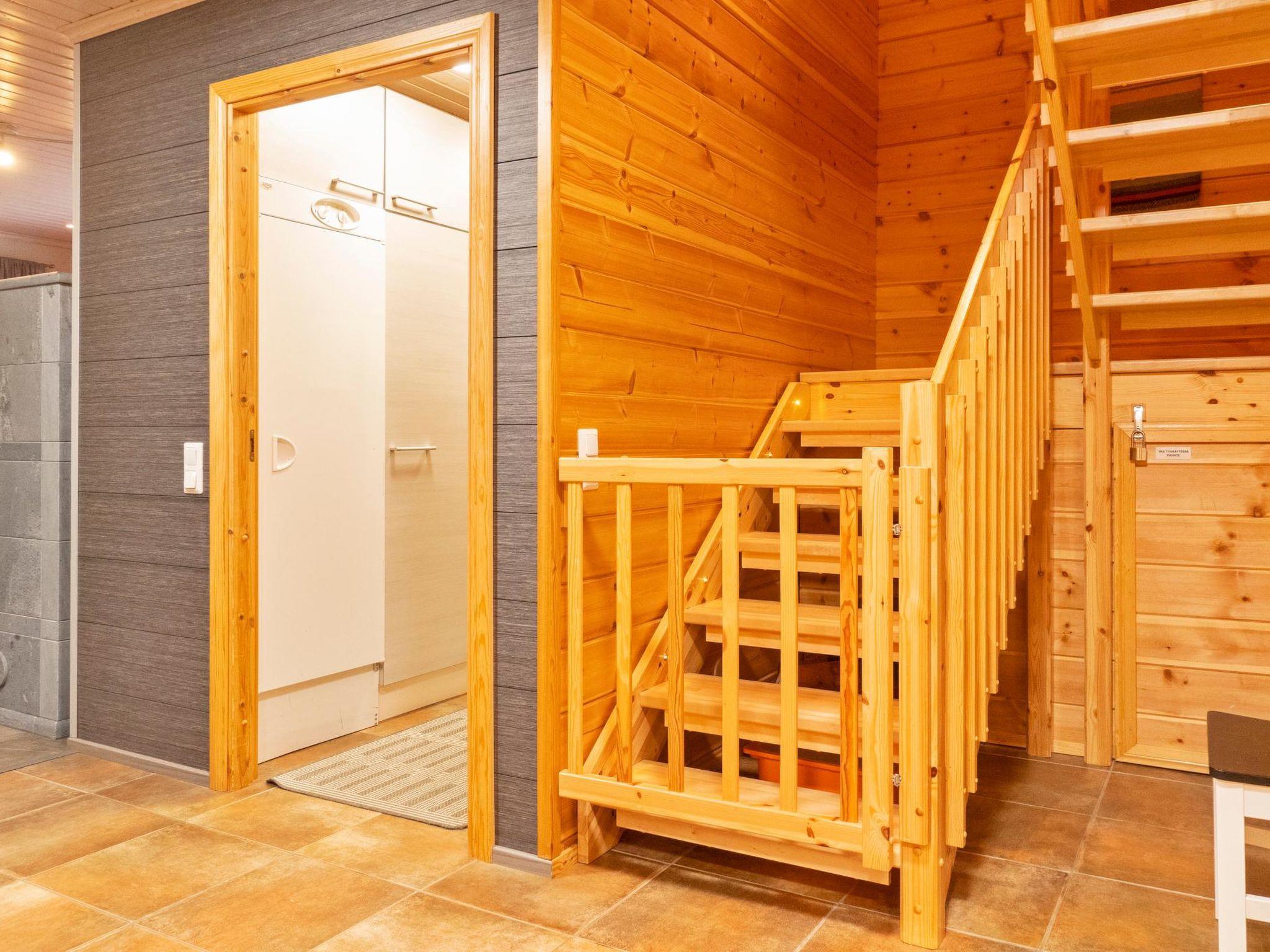Log cabin on two floors, built in 2007. Ground floor: living room/kitchen, bedroom with double bed, second bedroom with two single beds (width of one of them 120 cm ), electric sauna, washroom 2 showers, dressing room / utility room, downstairs 2 separate toilets, third toilet upstairs, open porch. Upstairs: 2 bedrooms, each with 2 single beds, convertible sofa in the lounge area, toilet. In addition, two drop-down matresses.