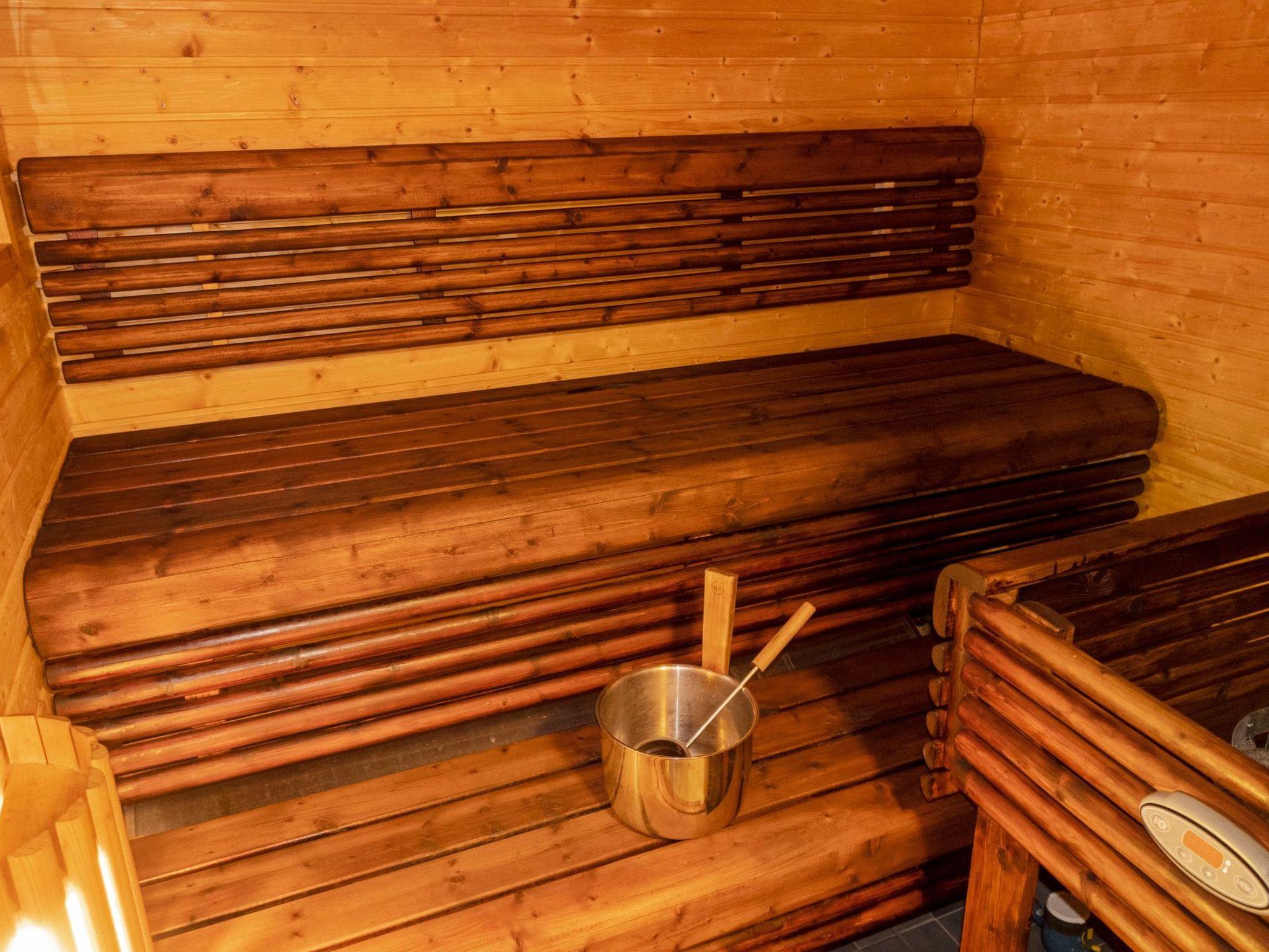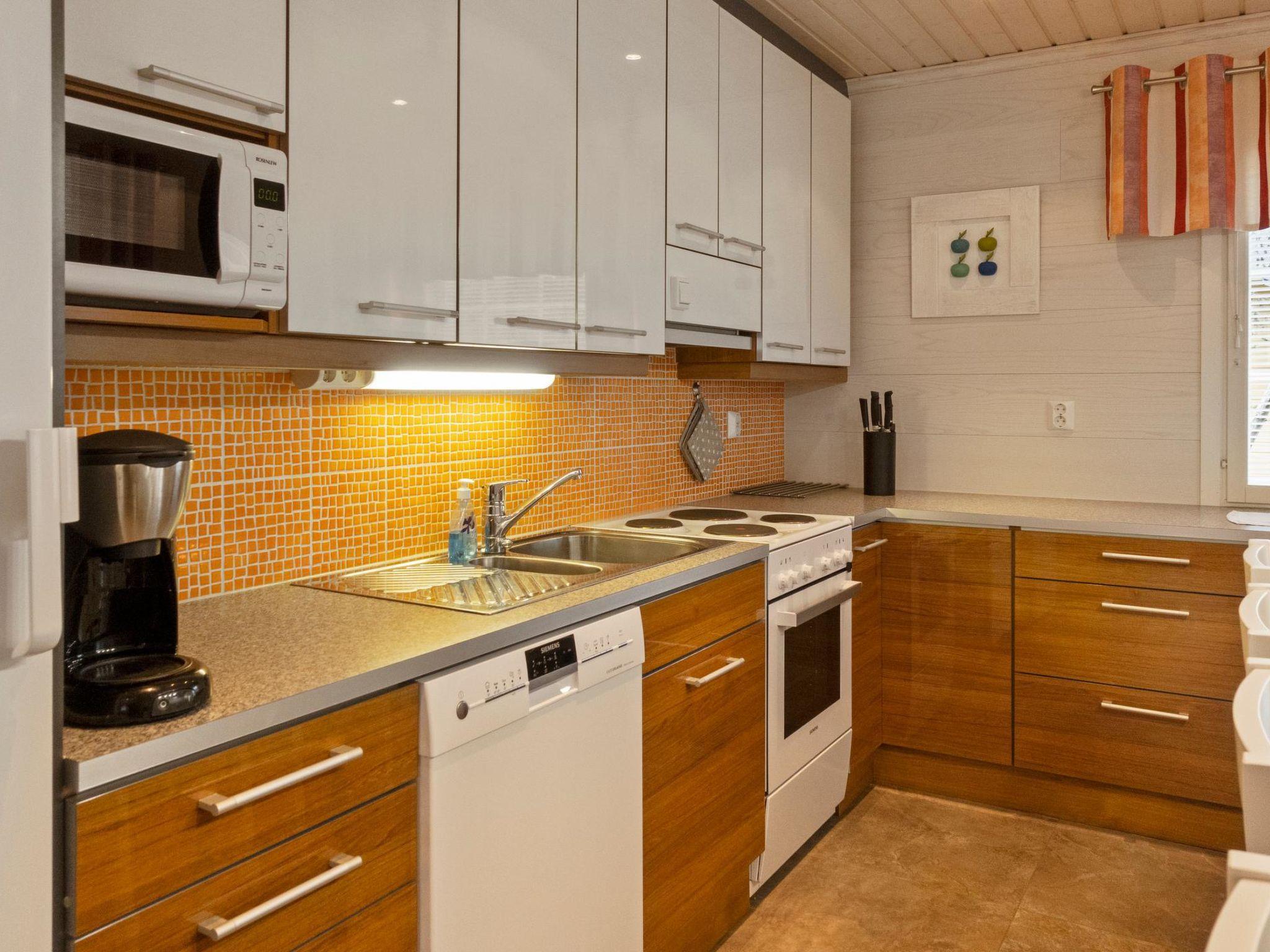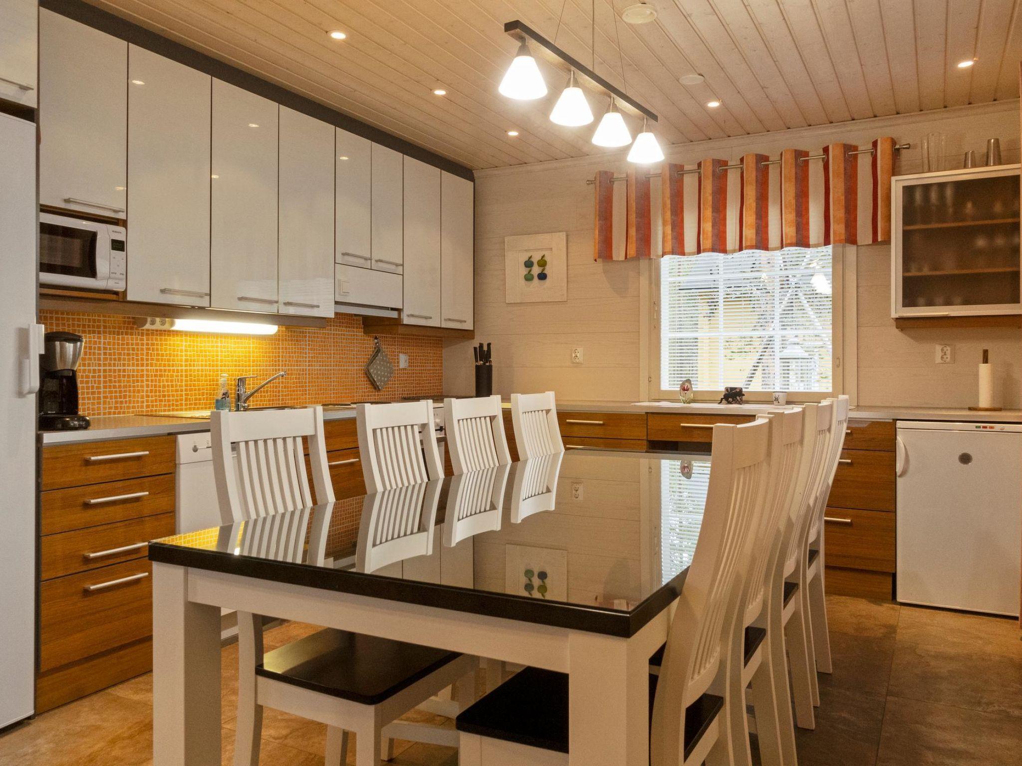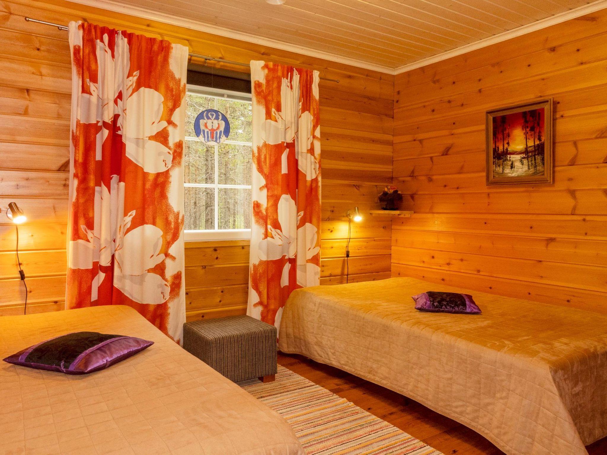 Log cabin on two floors, built in 2007. Ground floor: living room/kitchen, bedroom with double bed, second bedroom with two single beds (width of one of them 120 cm ), electric sauna, washroom 2 showers, dressing room / utility room, downstairs 2 separate toilets, third toilet upstairs, open porch. Upstairs: 2 bedrooms, each with 2 single beds, convertible sofa in the lounge area, toilet. In addition, two drop-down matresses.