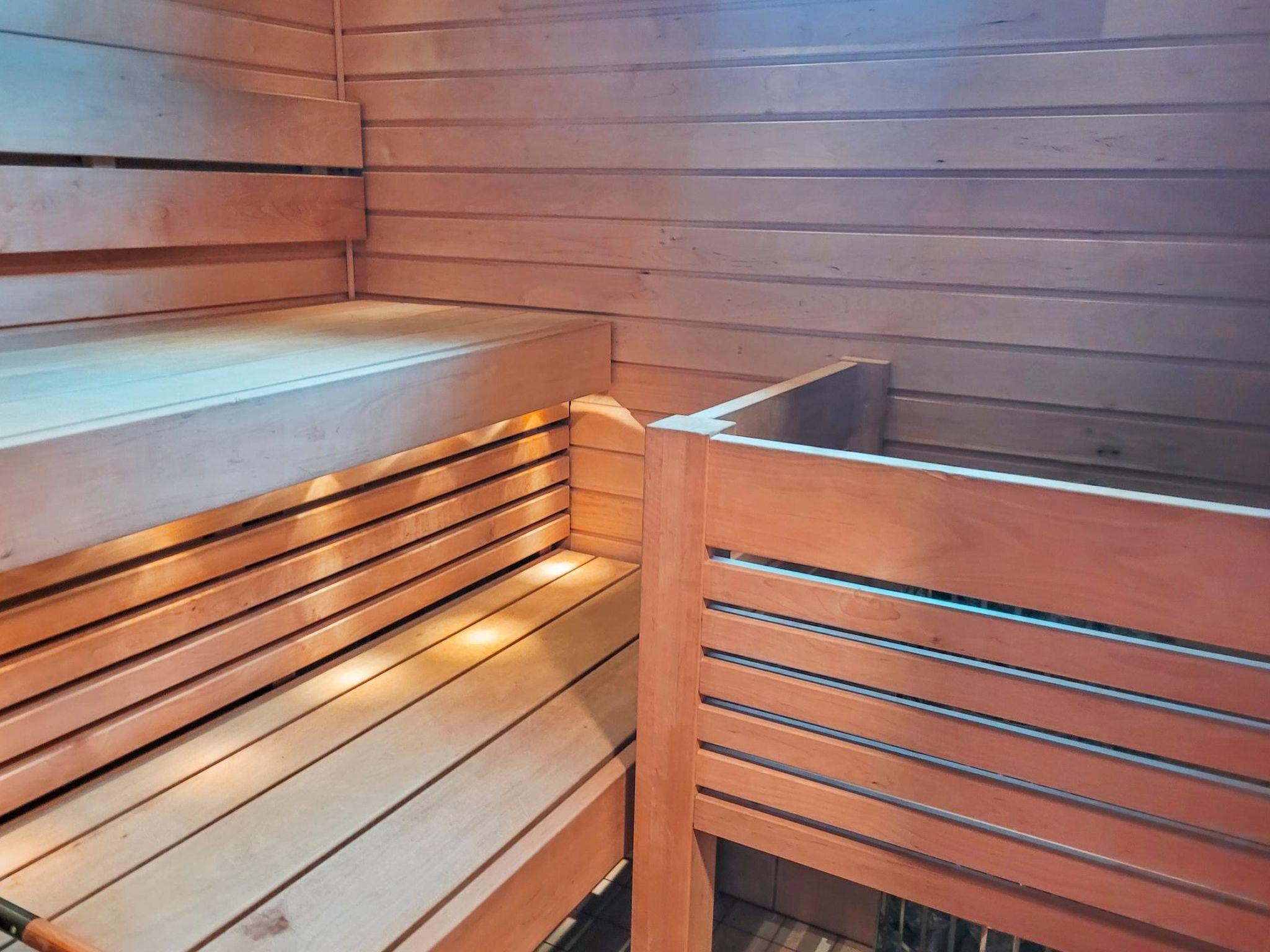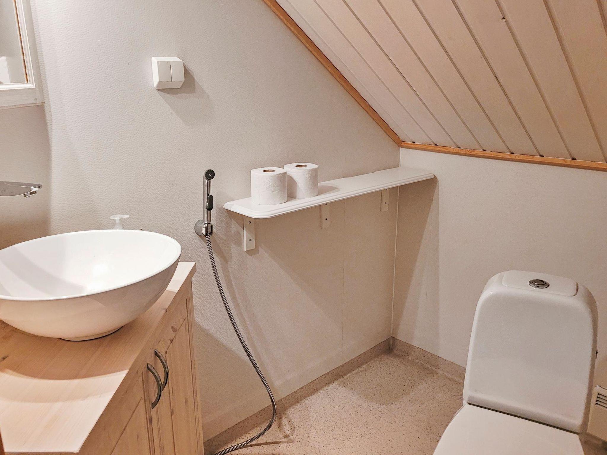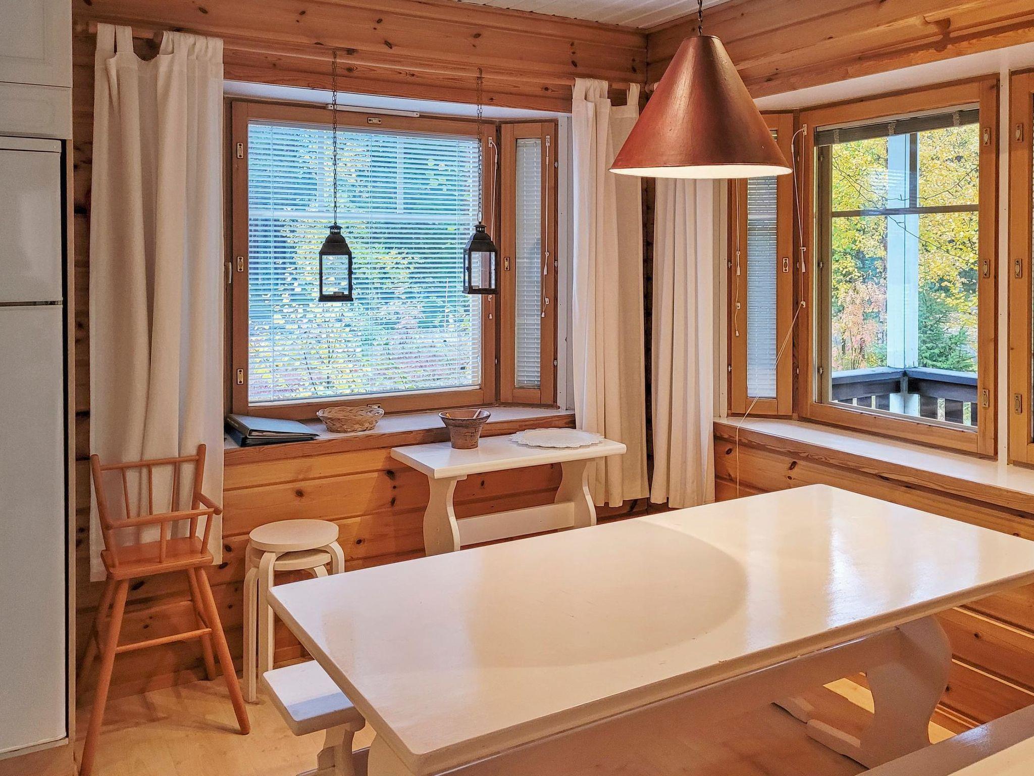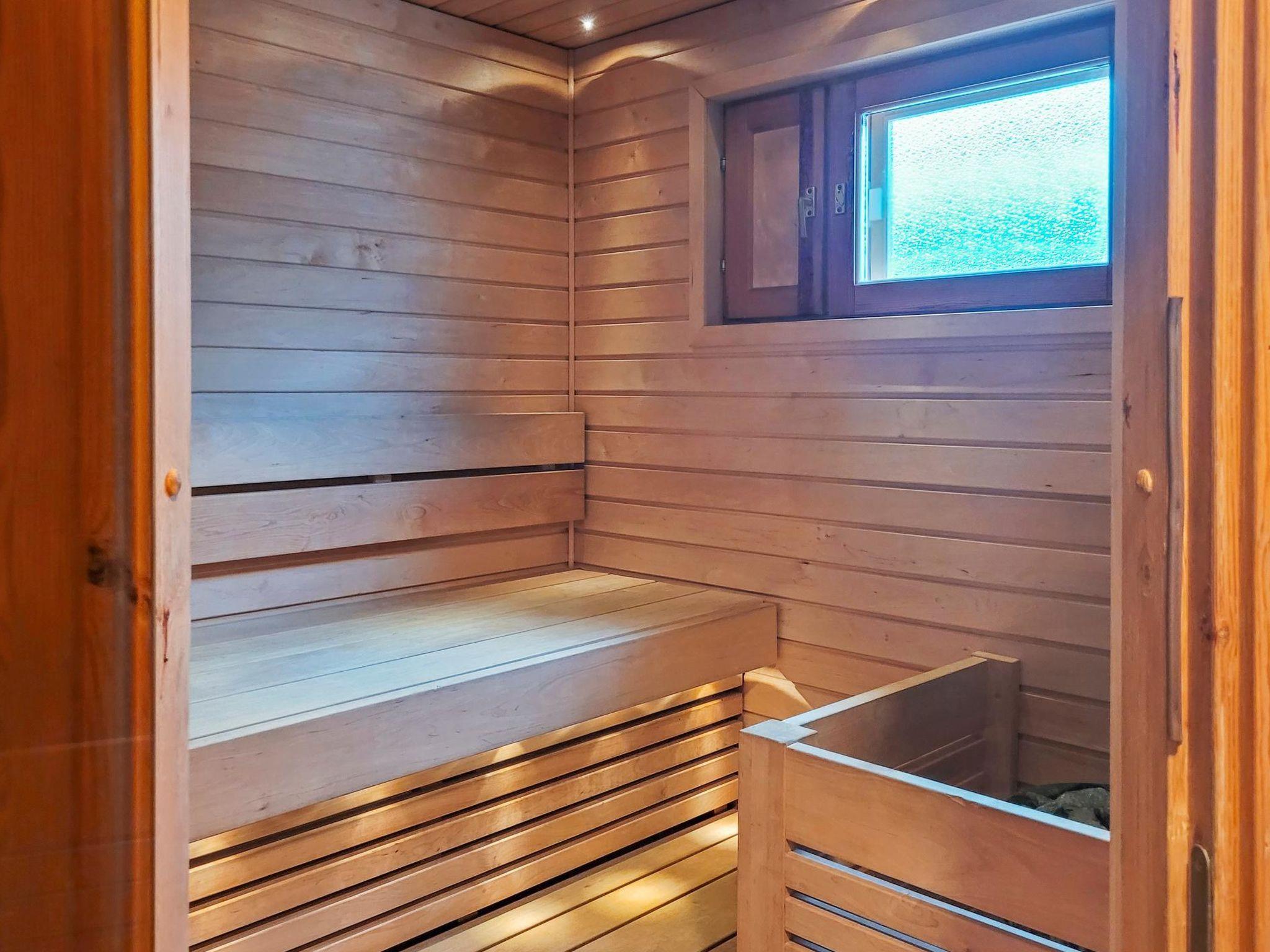 On the ground floor living room, kitchen, bedroom 2 beds, sauna (electric stove), washroom (2 showers), separate toilet and covered terrace. Upstairs, 4 bedrooms, all with 2 single beds, toilet and balcony. Child gate upstairs.