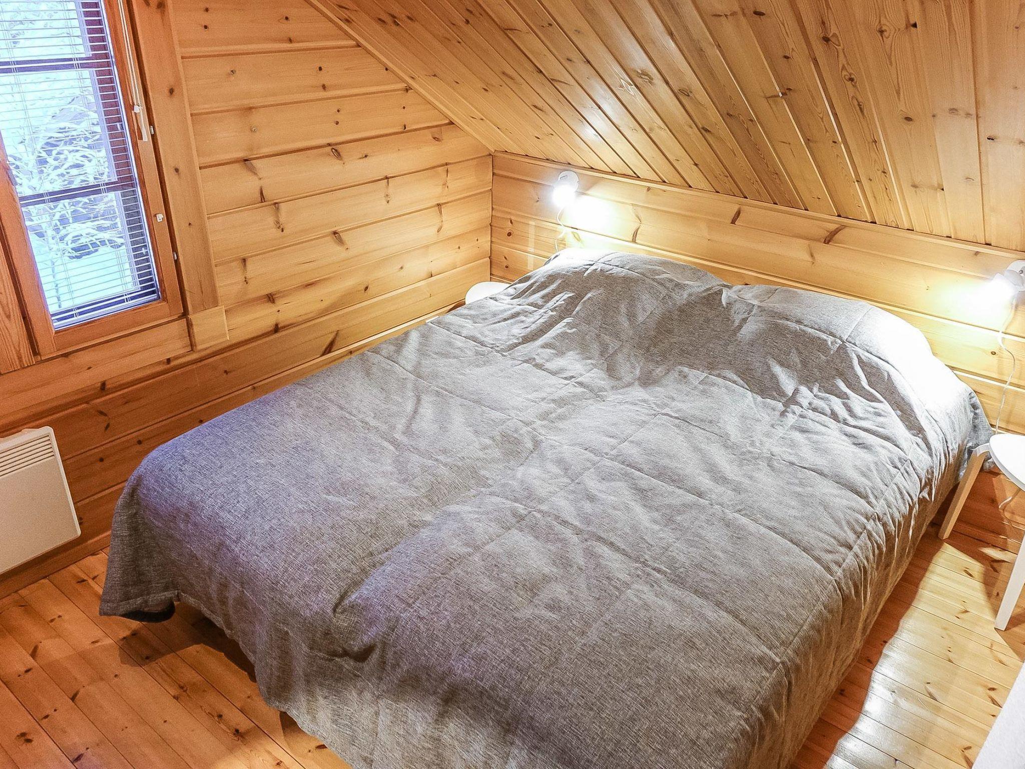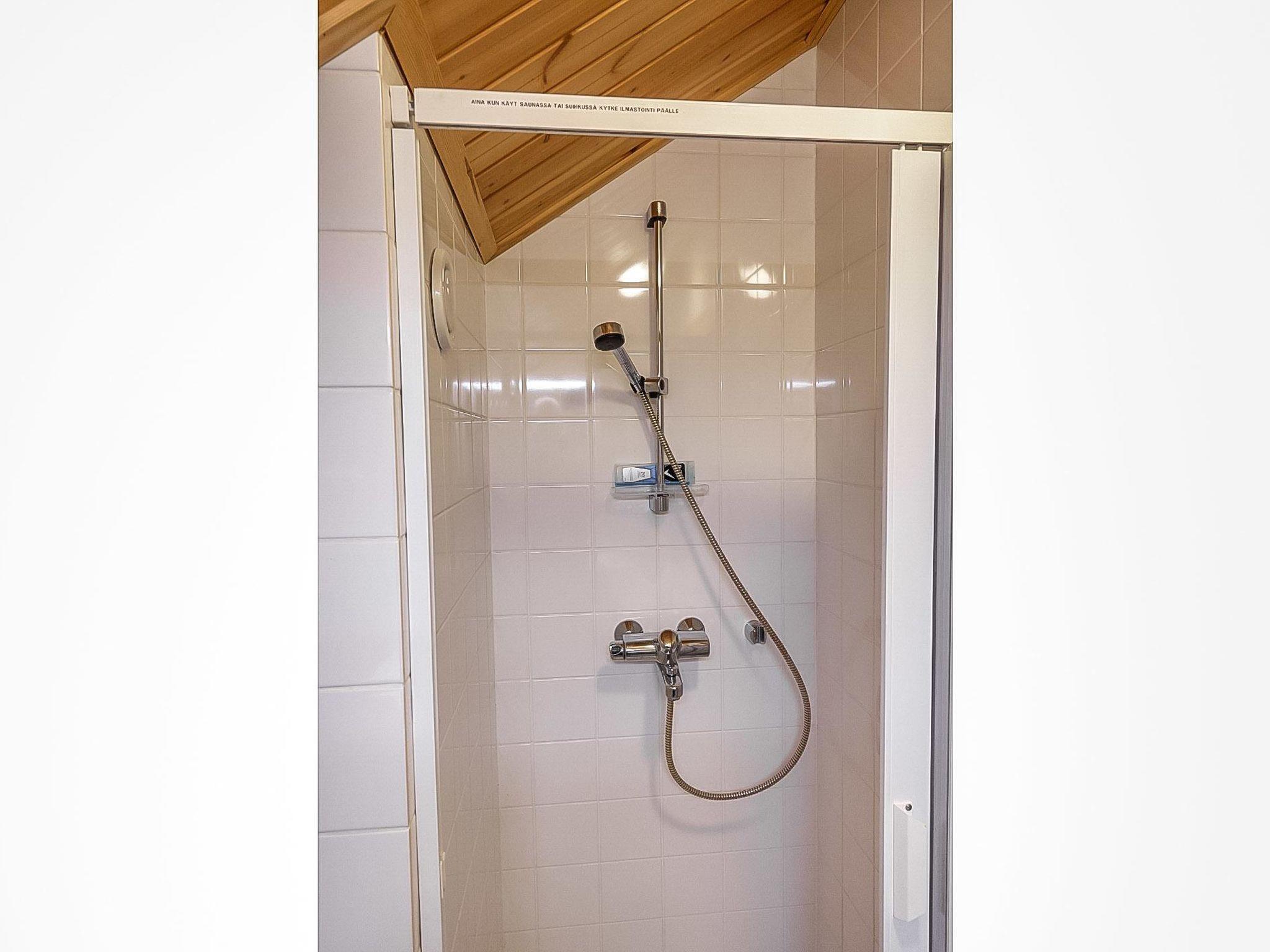 On the upper floor, bedroom with two beds, another bedroom with one bed (width 120 cm). There are sloping ceilings in the upper floor bedrooms. There are also WC and shower on the upper floor.