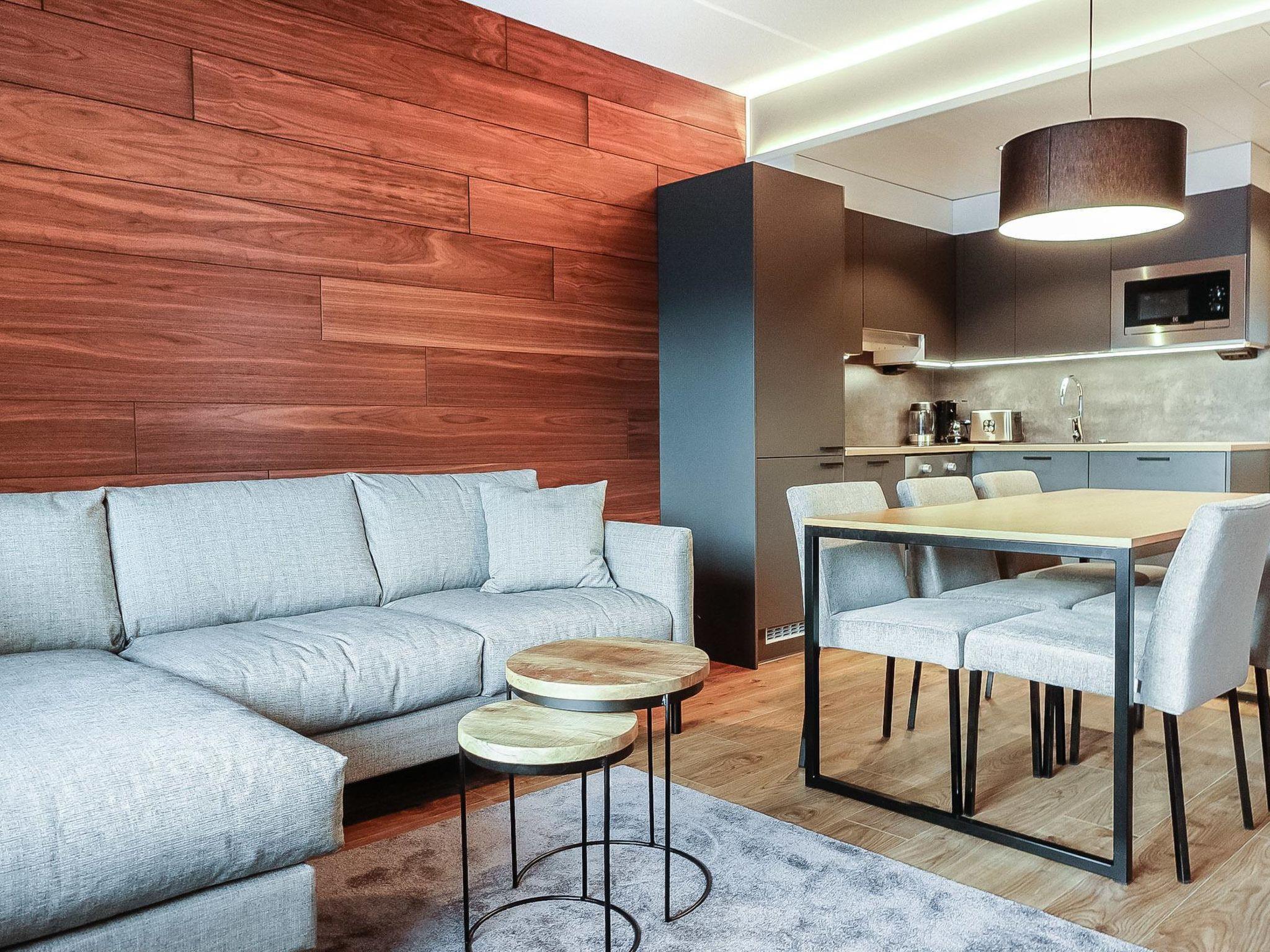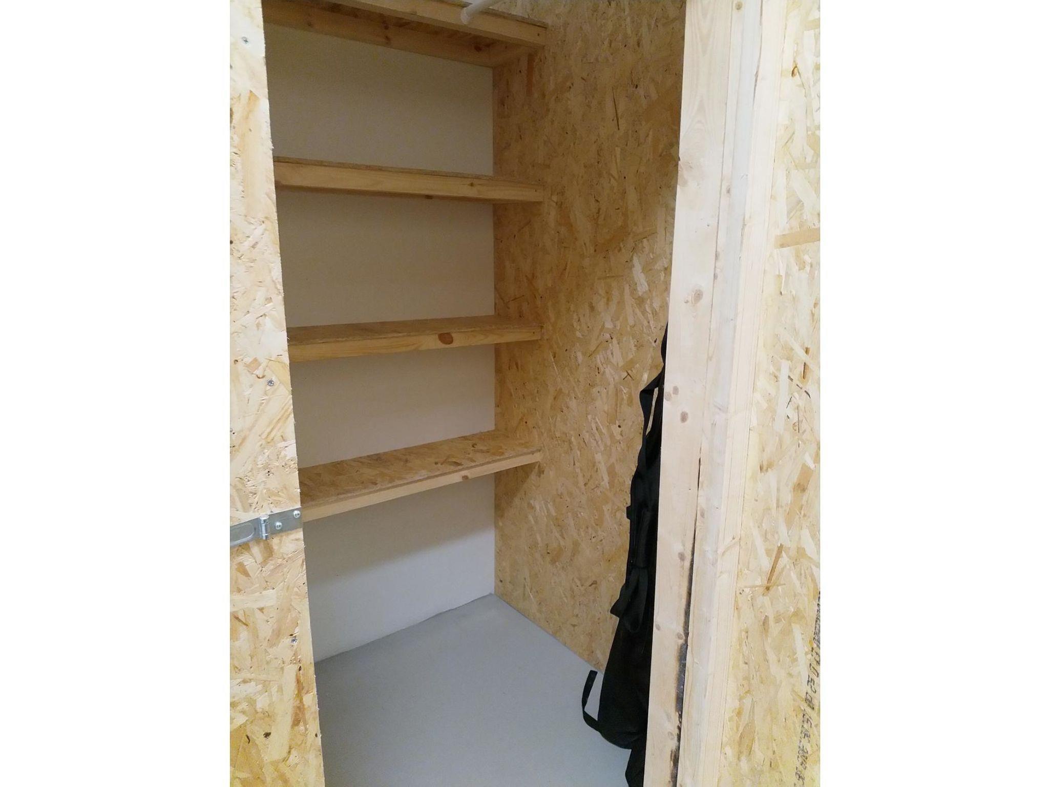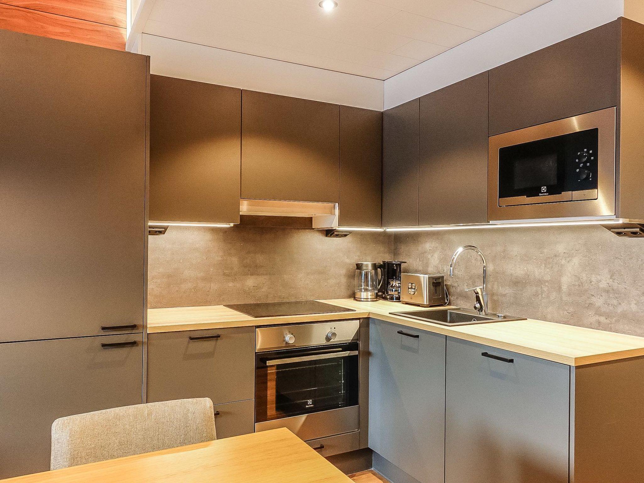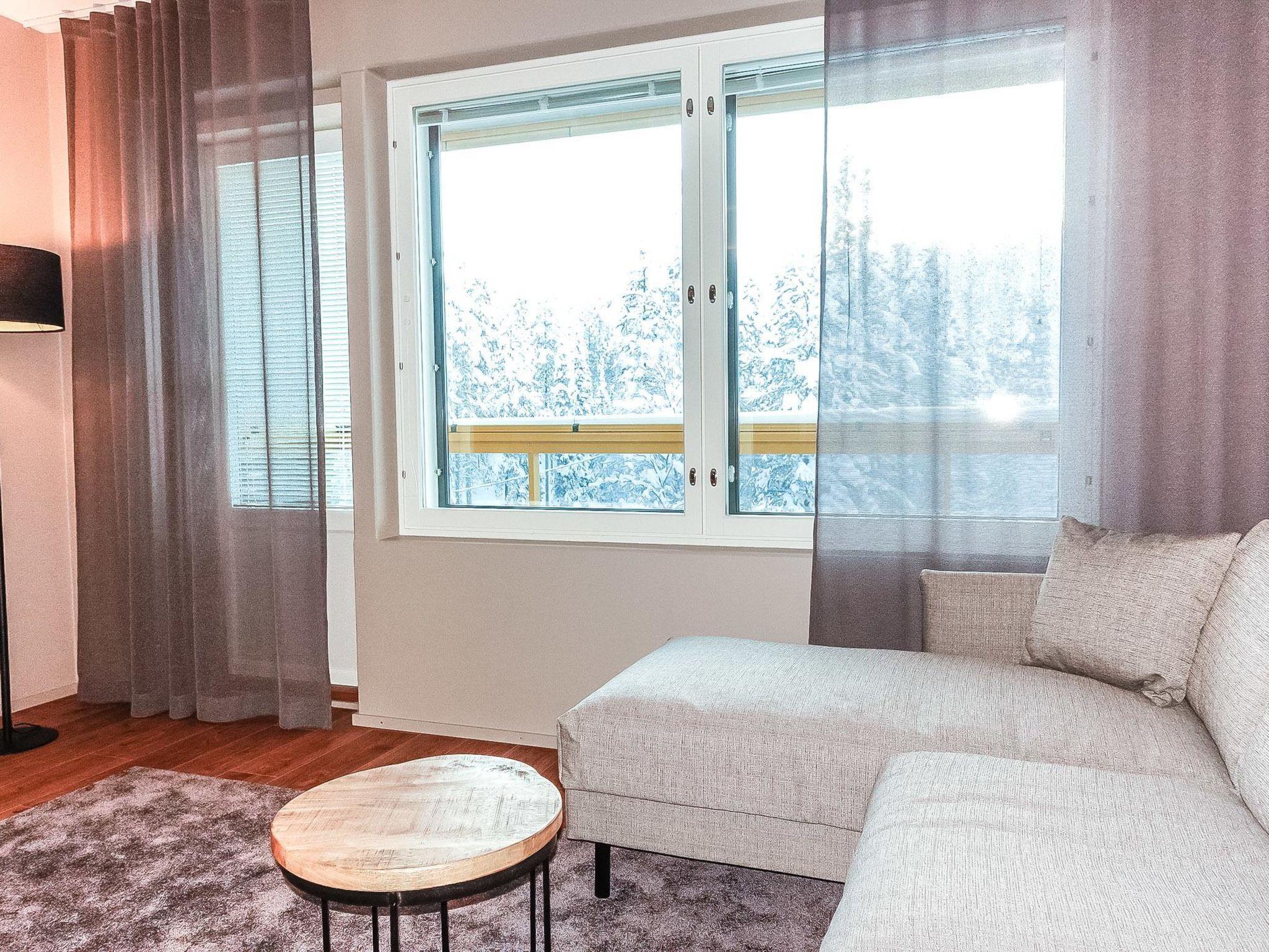 Living room/kitchen, bedroom with double bed (width 200 cm), another bedroom with two separate beds, sauna, washroom/WC and glazed balcony. Separate WC. The sofa in living room can be used as an extra bed. Electric fireplace. Storage space in the basement (shared use).