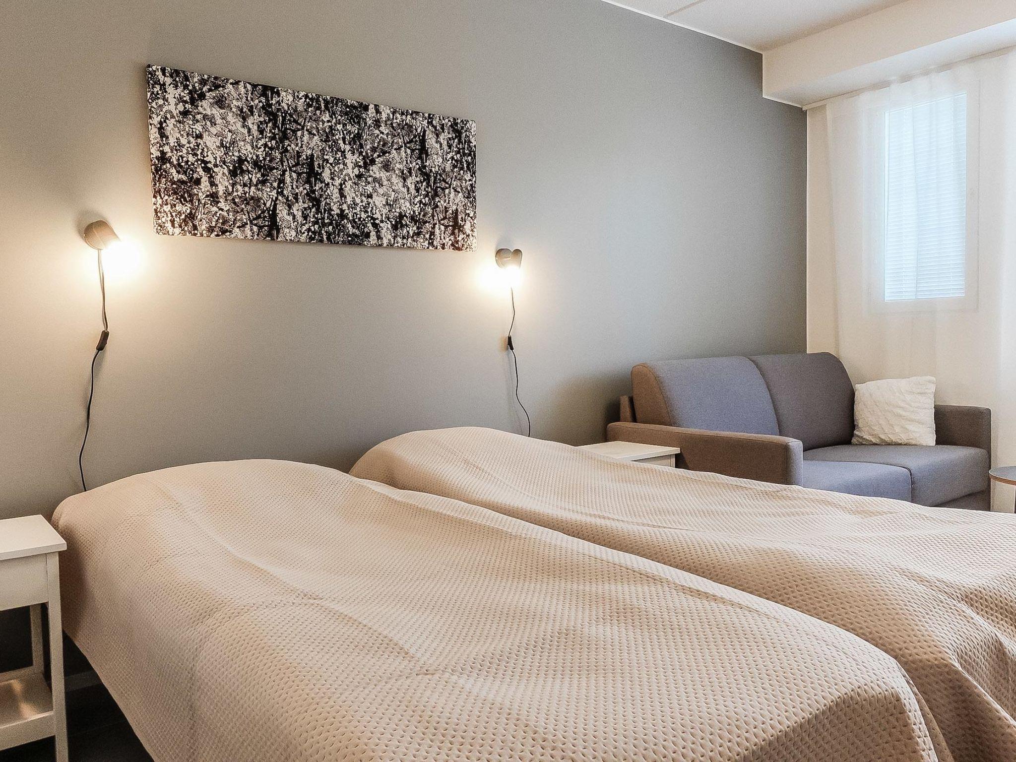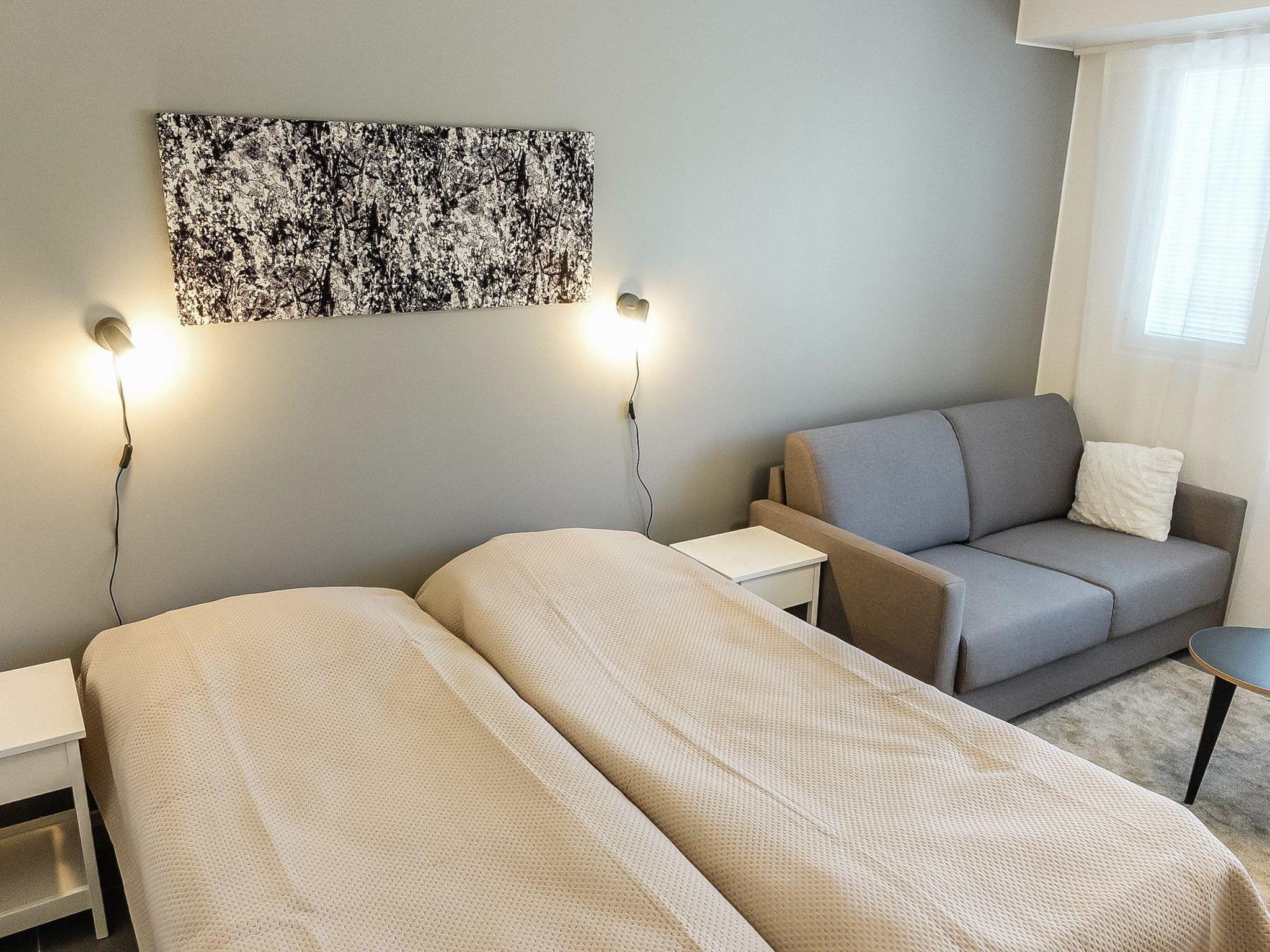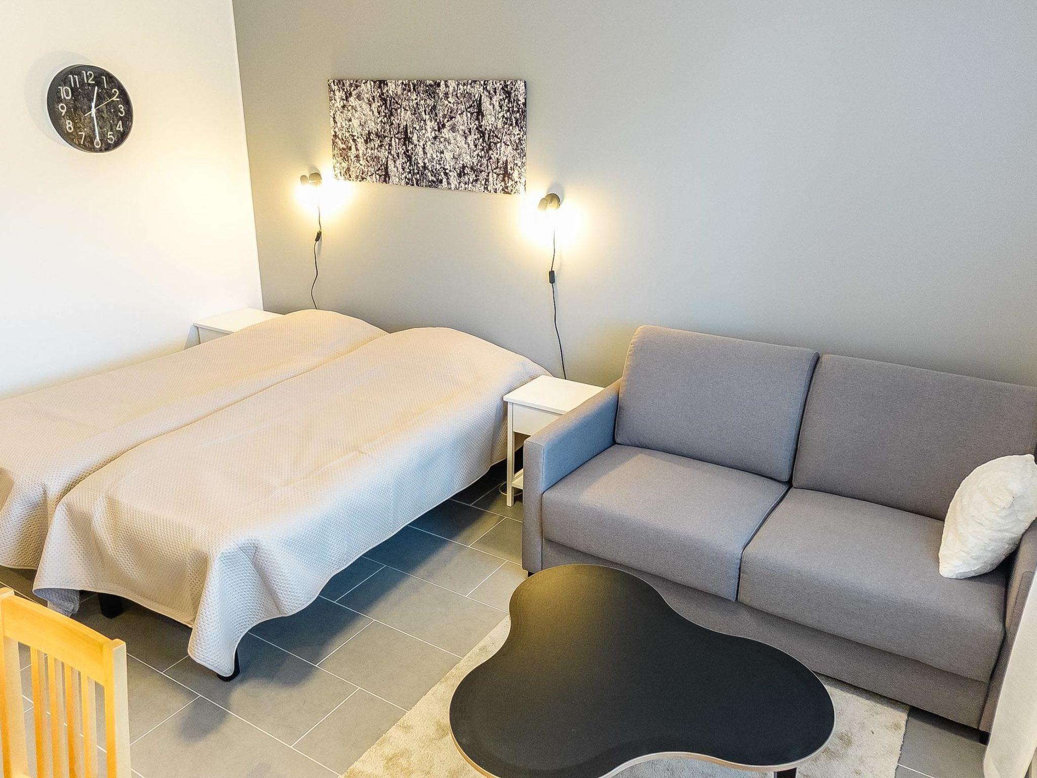 Living room/kitchen with 2 beds and sofa bed, sauna and washroom/WC. Storage available for the guests.