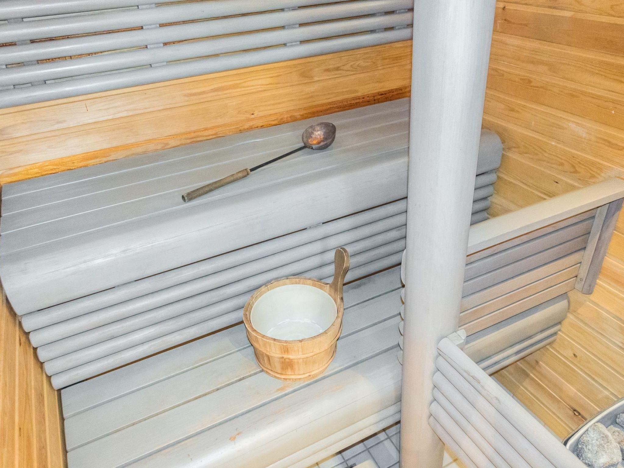 On the ground floor, living room/kitchen, bedroom with double bed, sauna, washroom, separate WC and covered terrace.