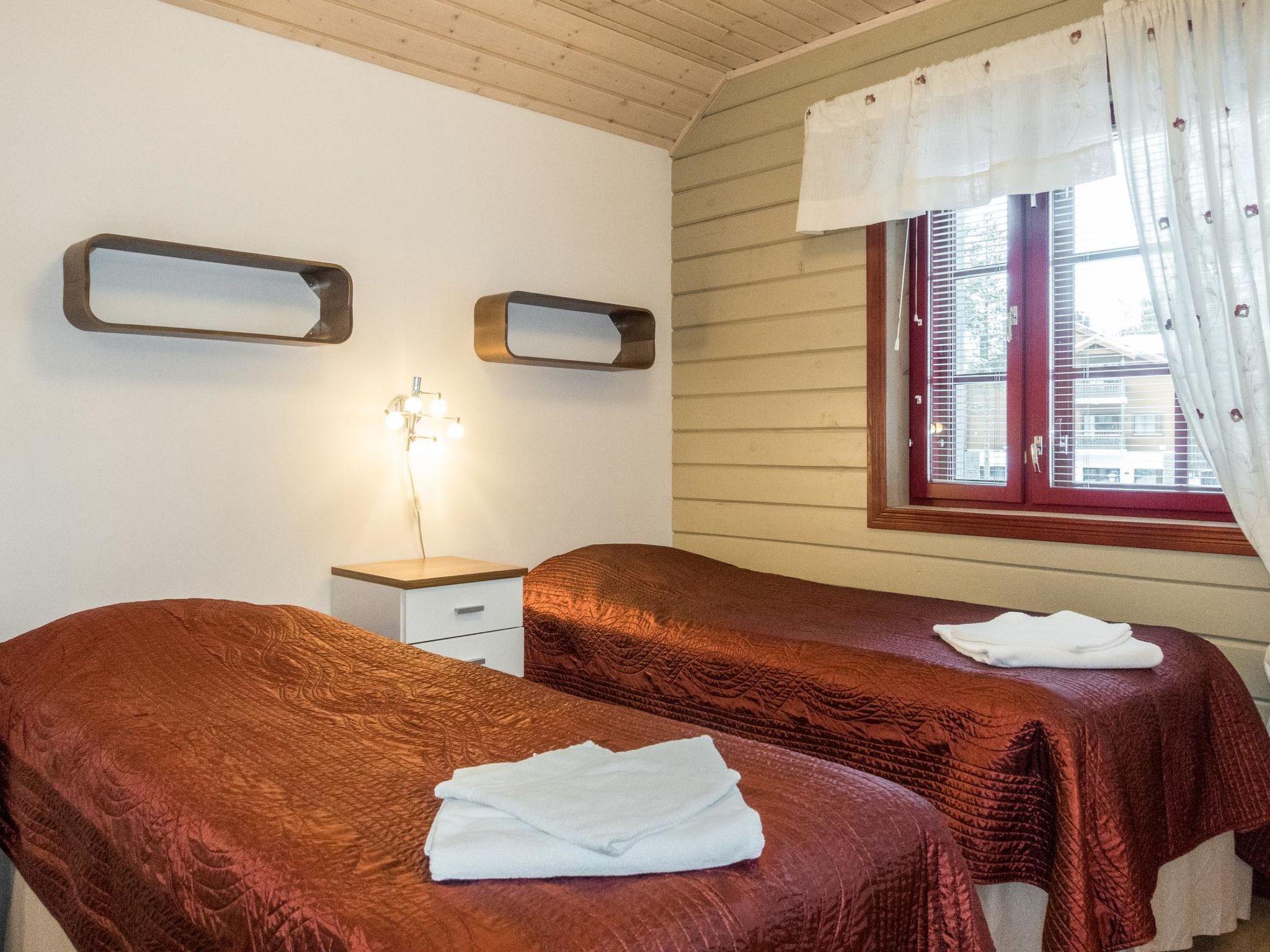 On the ground floor, living room/kitchen, bedroom with two beds, sauna, washroom, separate WC and balcony.