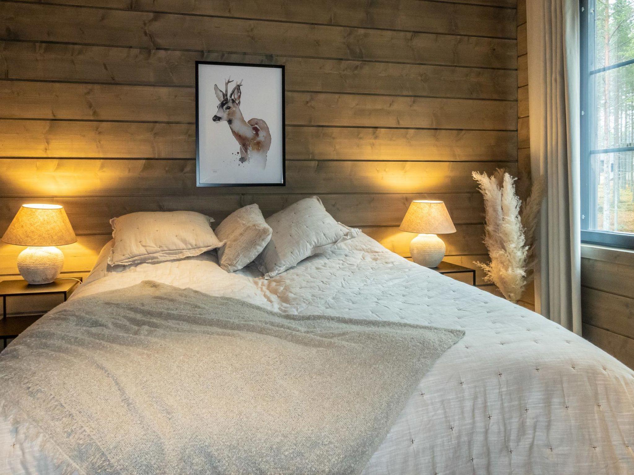 On the ground floor, there is one of Willa's four bedrooms. The bedroom has high-quality 180 cm wide bed and very high-quality pillows and blankets. The room is wonderfully bright thanks to the floor-to-ceiling window, but at night the bedroom can be darkened with a blackout curtain.