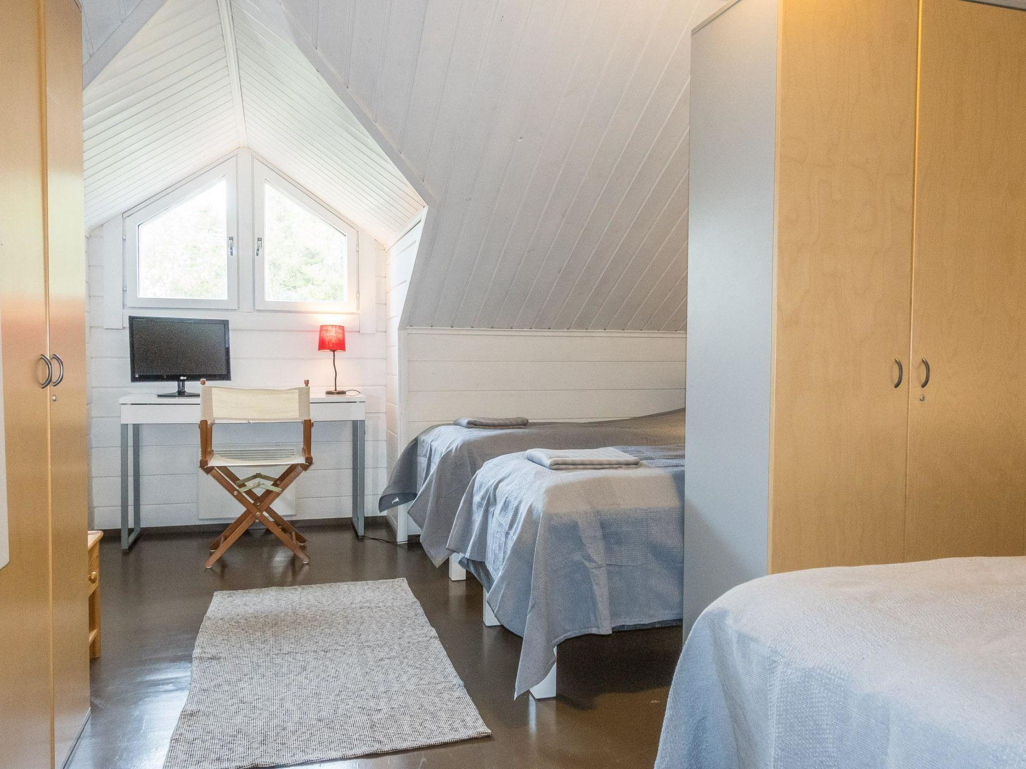 On the upper floor, there is a large bedroom with a double bed and two separate beds. The room is divided into two compartments by wardrobes. It also has a work desk and computer monitor. The upstairs lobby has one single bed, an armchair and sofa, and a coffee table. A child safety gate is at the top of the stairs.