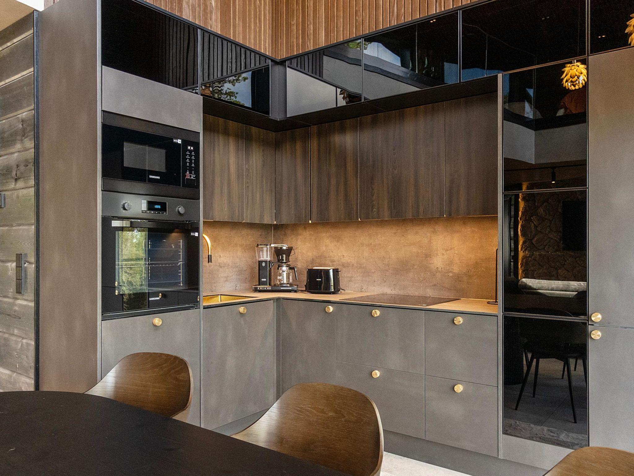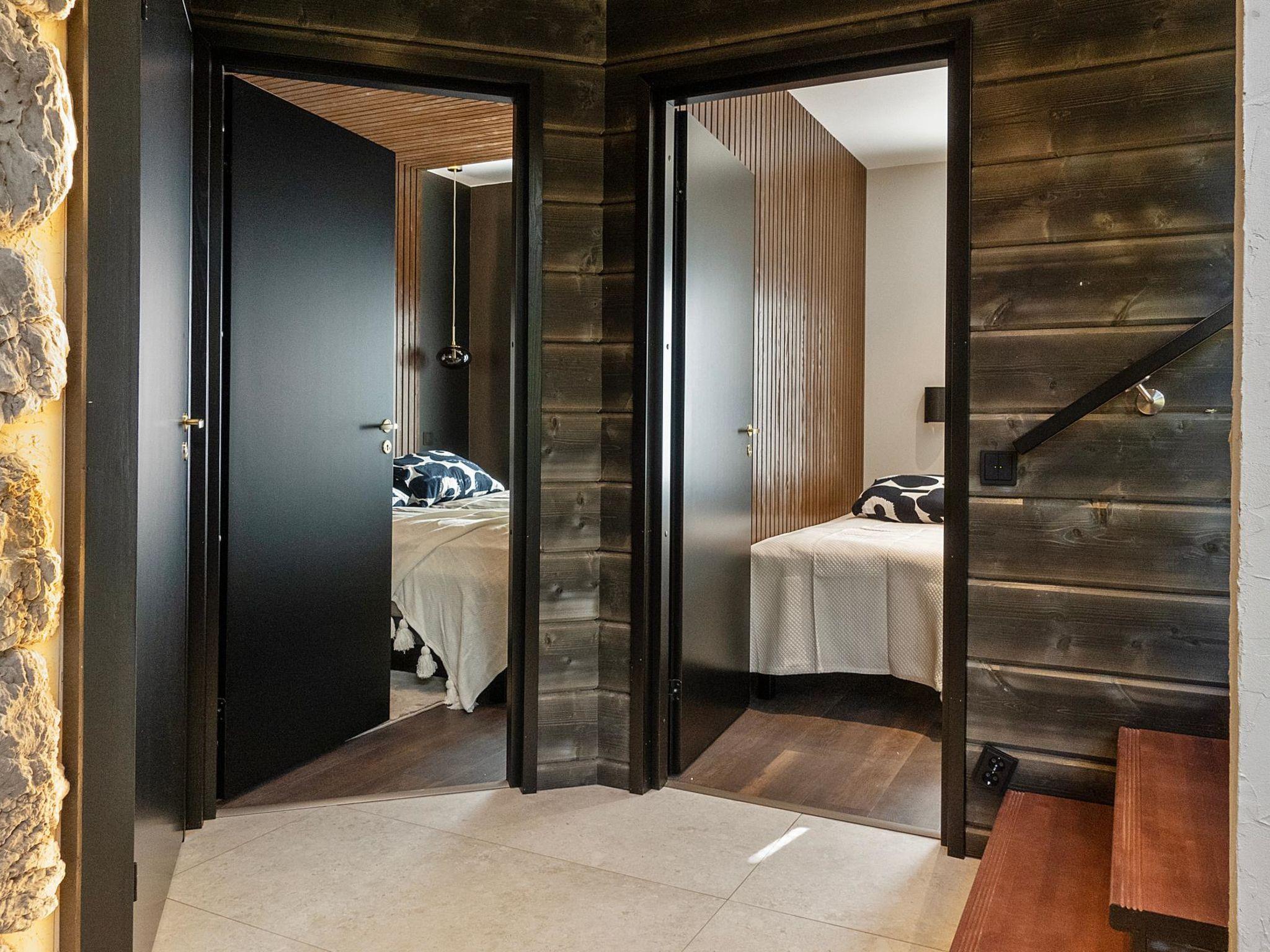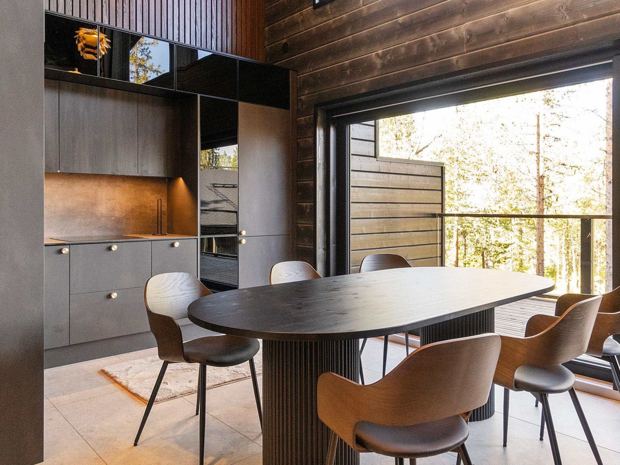 The apartment's dark color palette creates a cozy and atmospheric environment where you can relax and enjoy the enchanting atmosphere of Lapland.