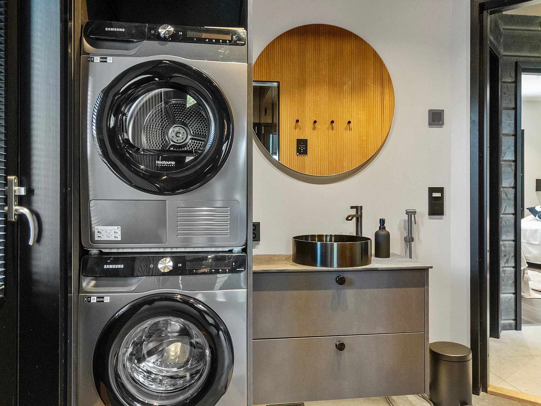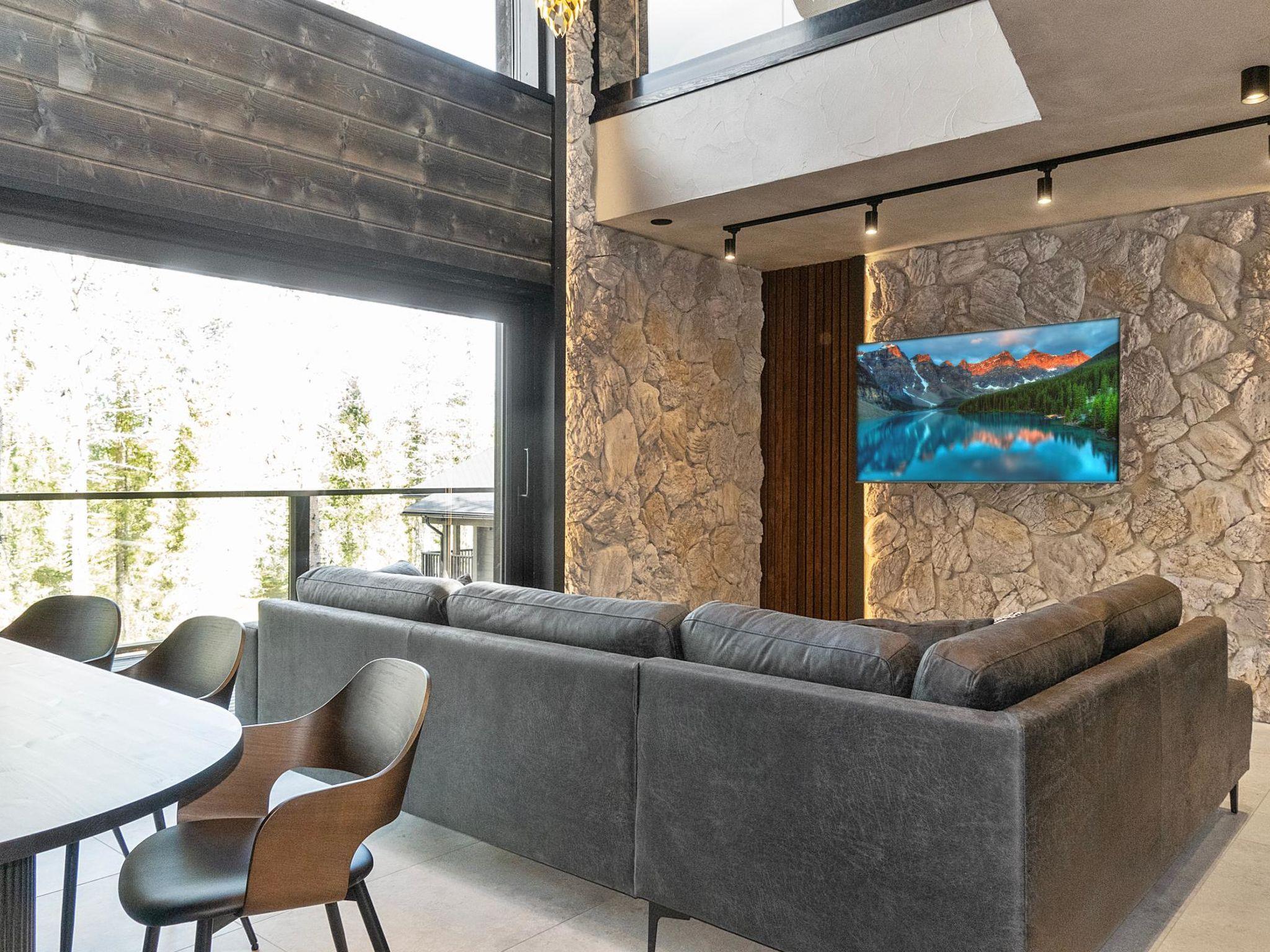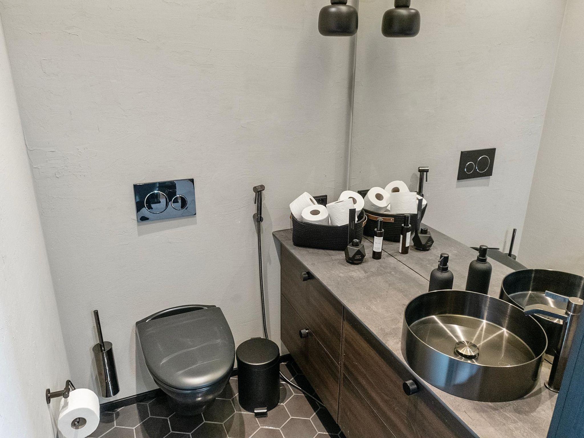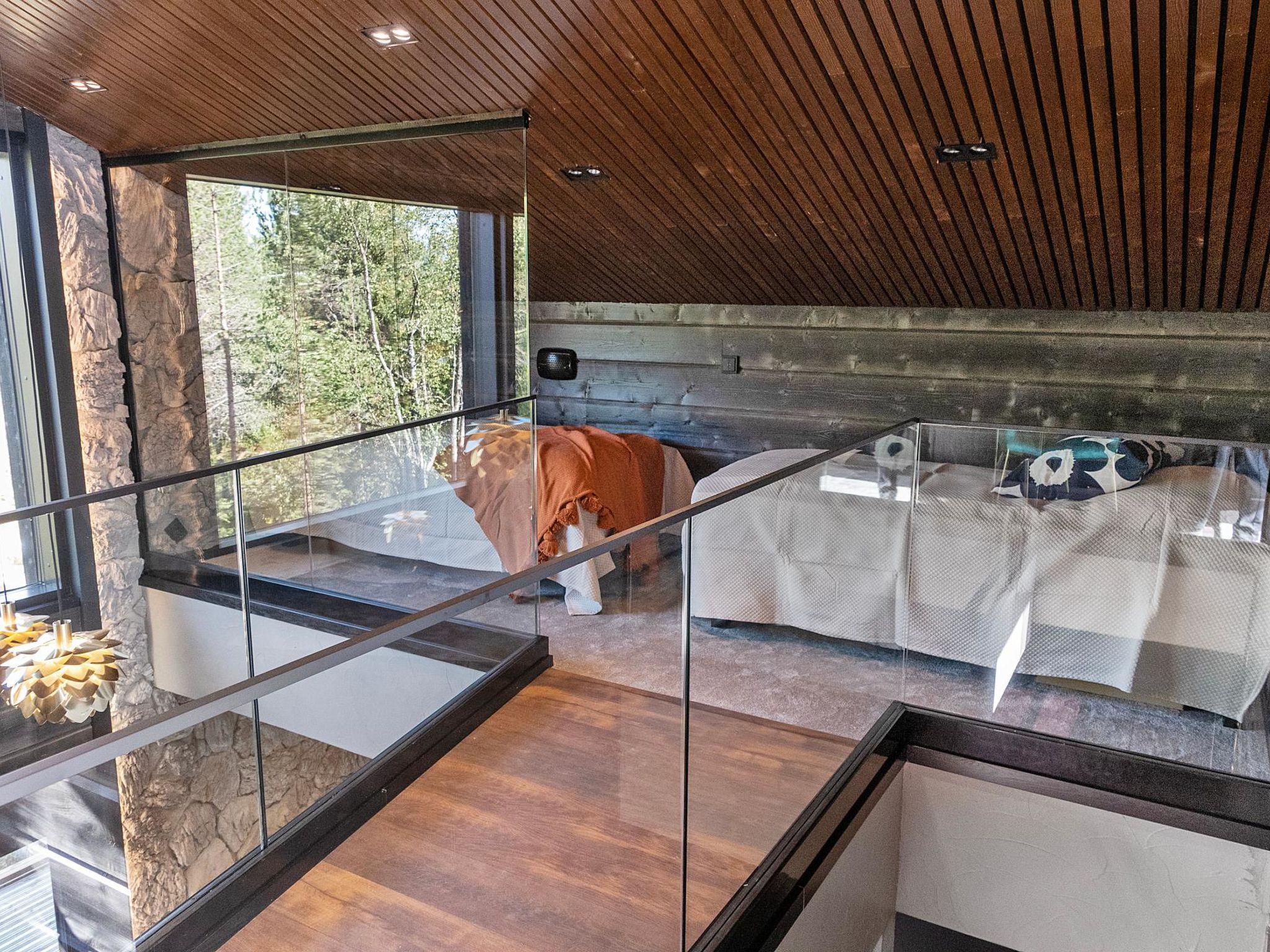 The apartment's dark color palette creates a cozy and atmospheric environment where you can relax and enjoy the enchanting atmosphere of Lapland.