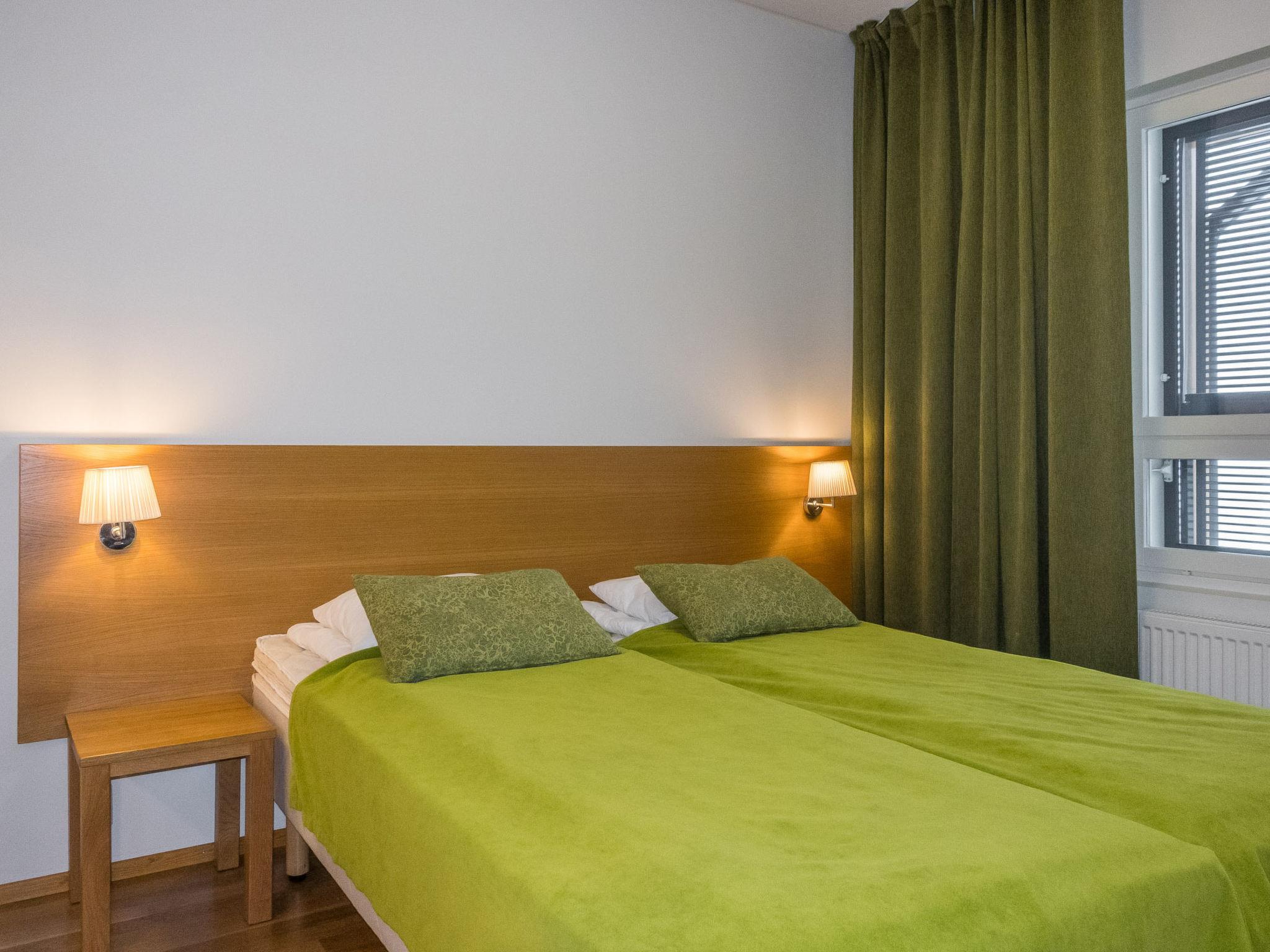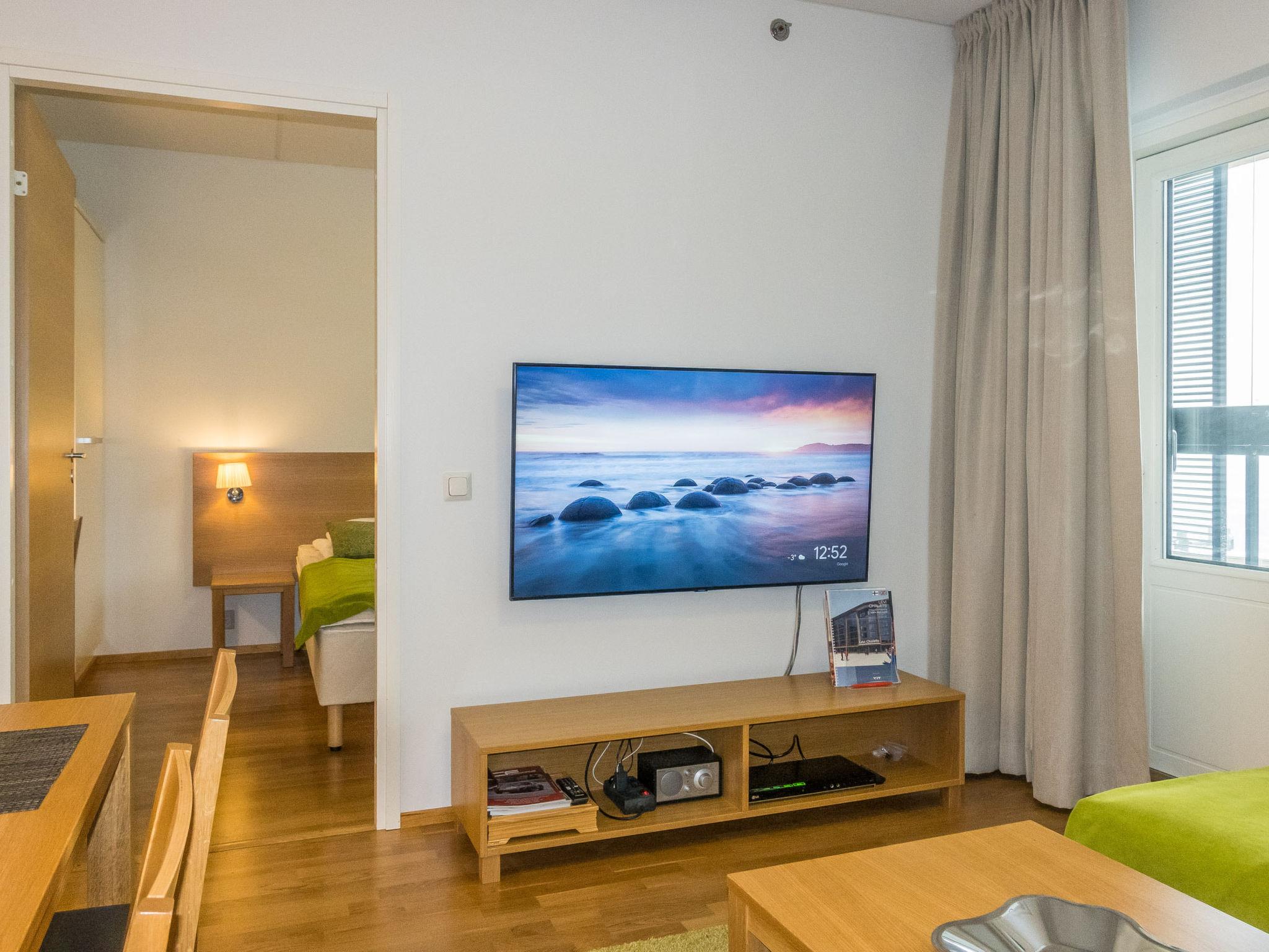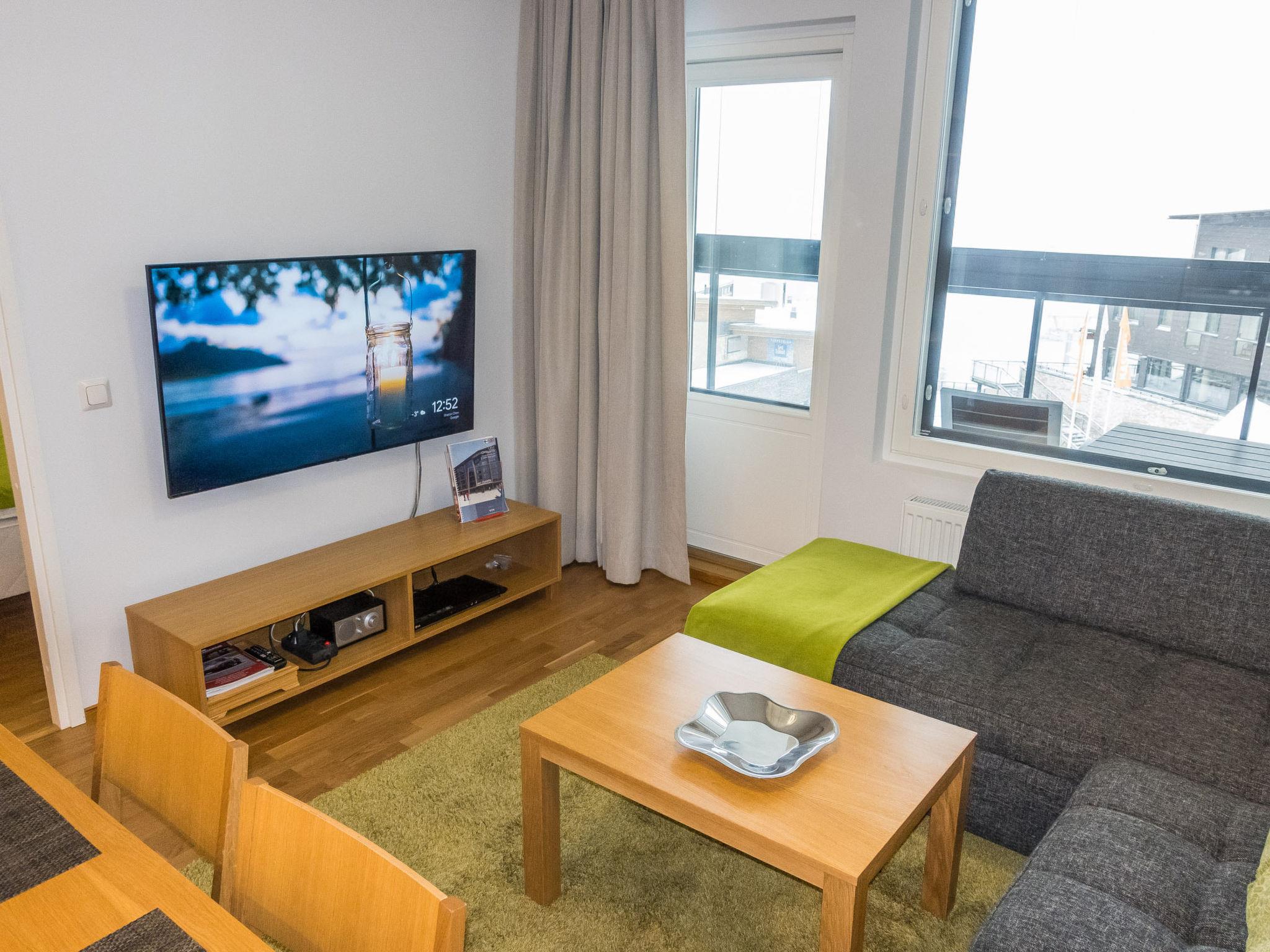 The apartment features an open kitchen, a bedroom with two beds, and a bunk bed in the alcove, with the lower bed being 120 cm wide. Sauna, a shower room, a separate WC, and a glazed balcony. Moreover, the bedroom is equipped with a workspace.