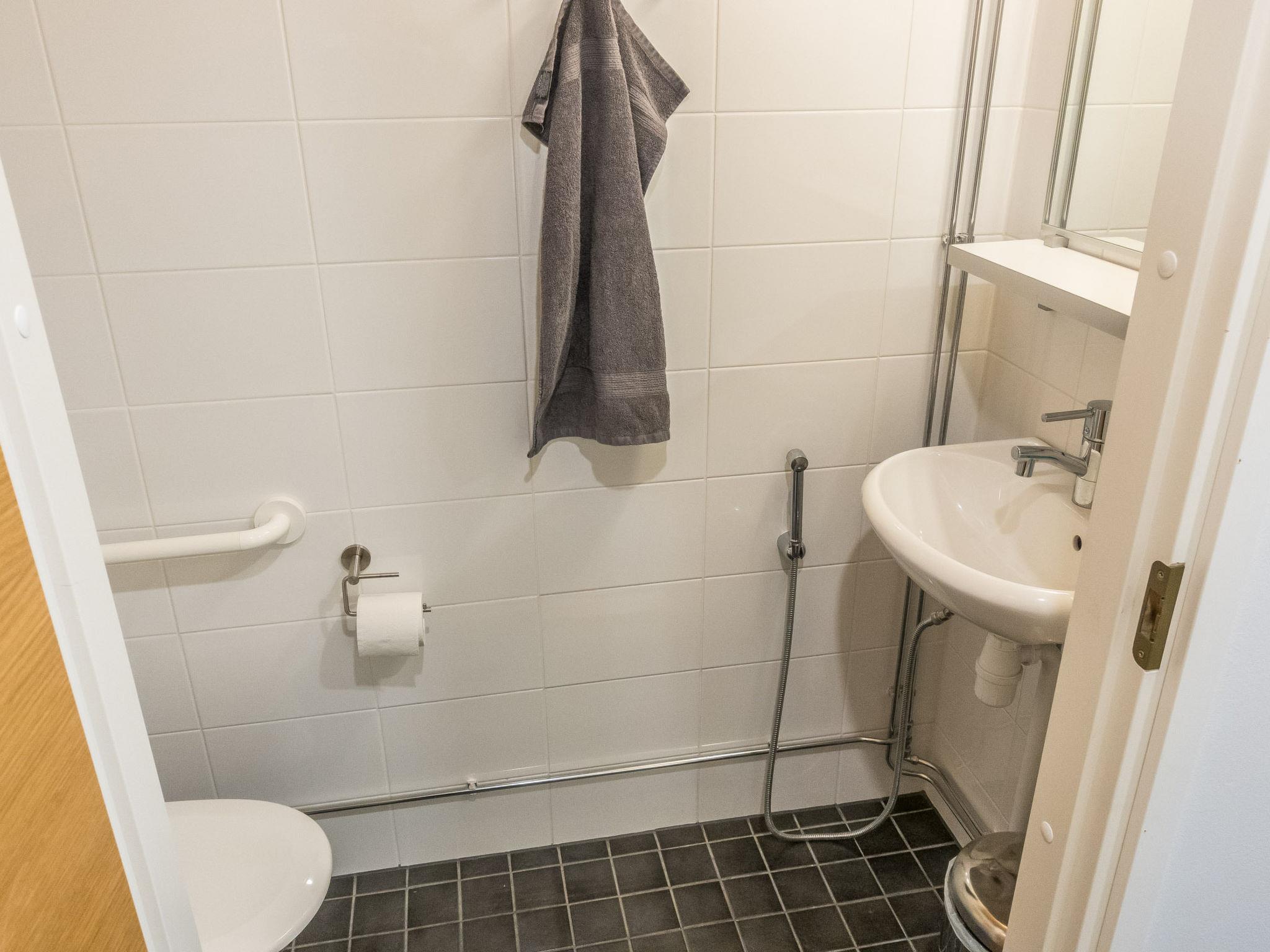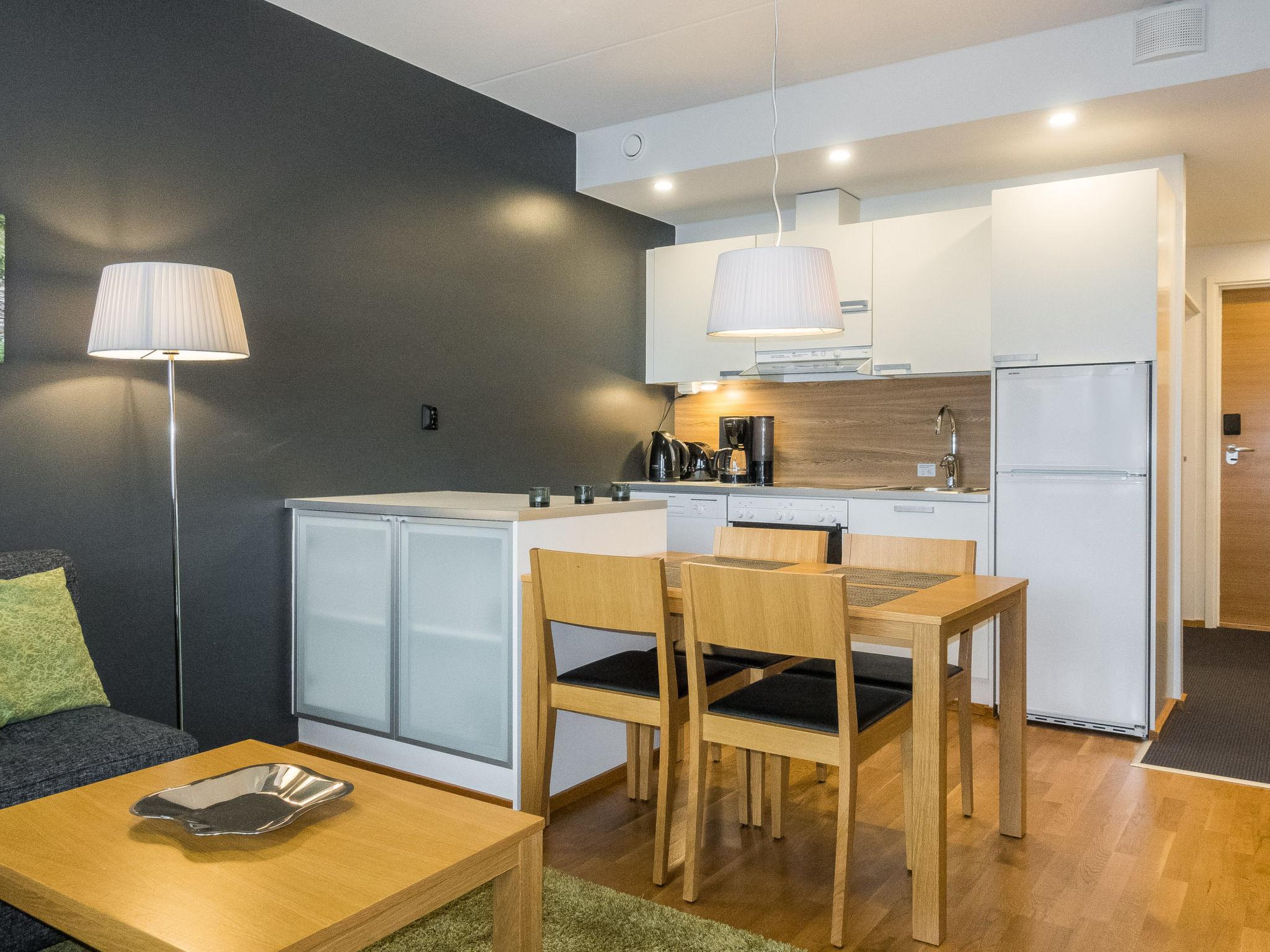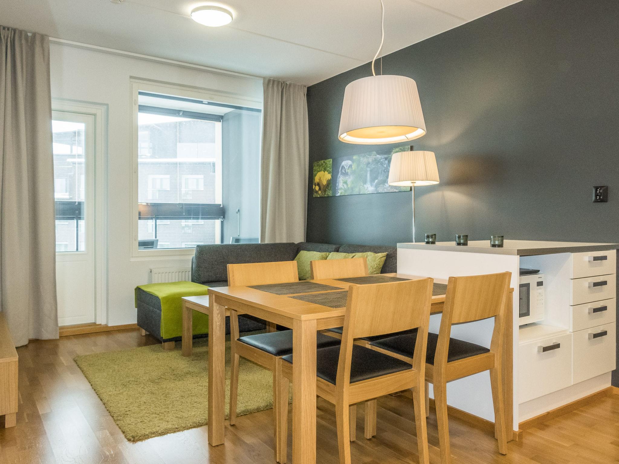 The apartment features an open kitchen, a bedroom with two beds, and a bunk bed in the alcove, with the lower bed being 120 cm wide. Sauna, a shower room, a separate WC, and a glazed balcony. Moreover, the bedroom is equipped with a workspace.
