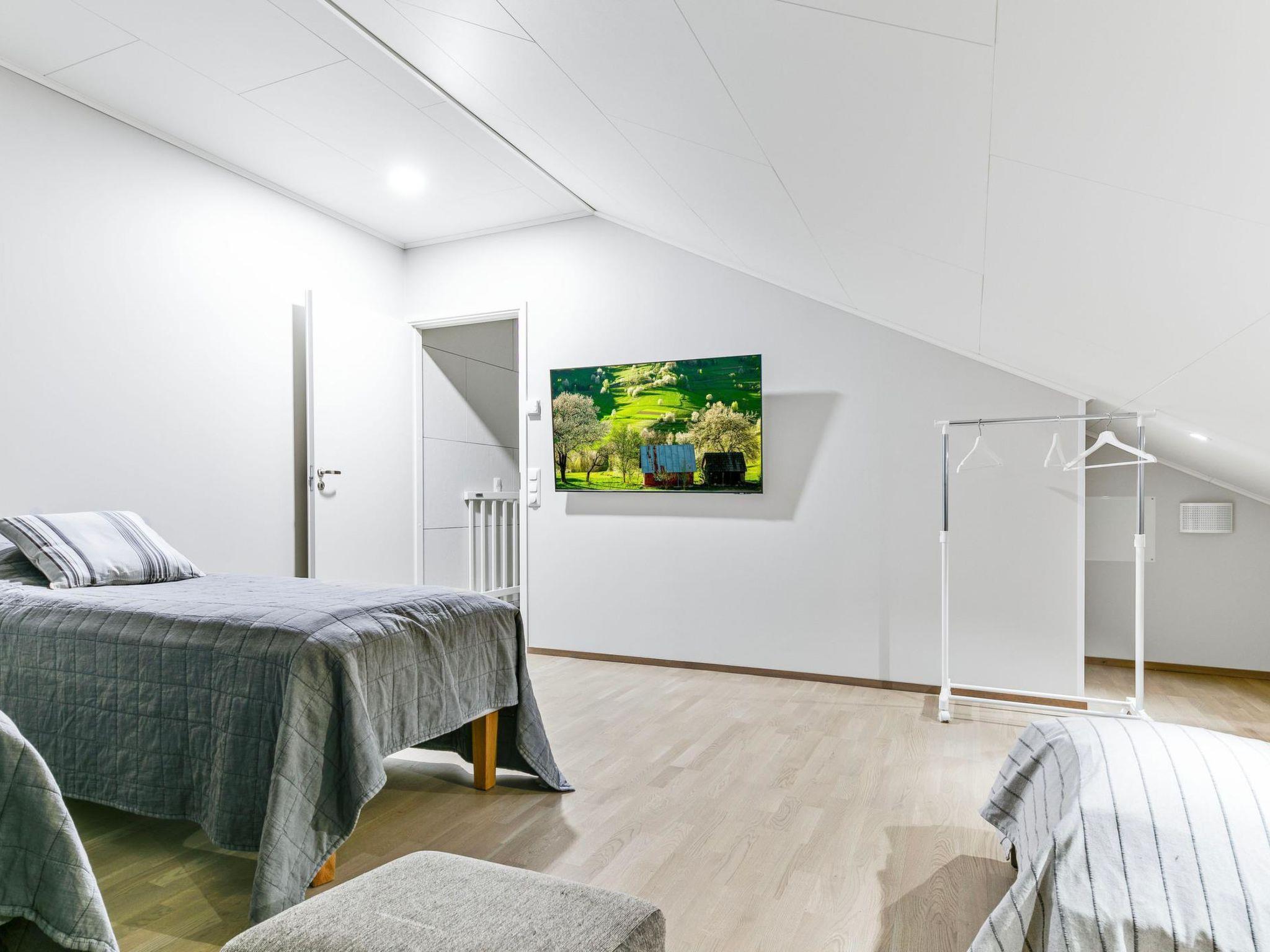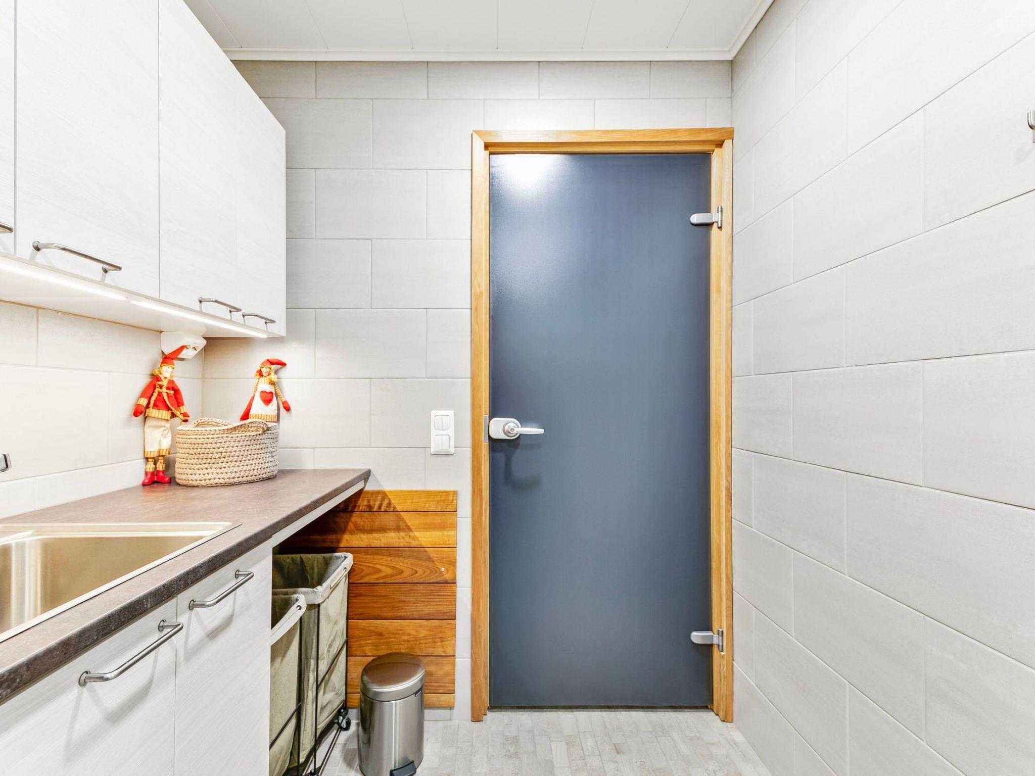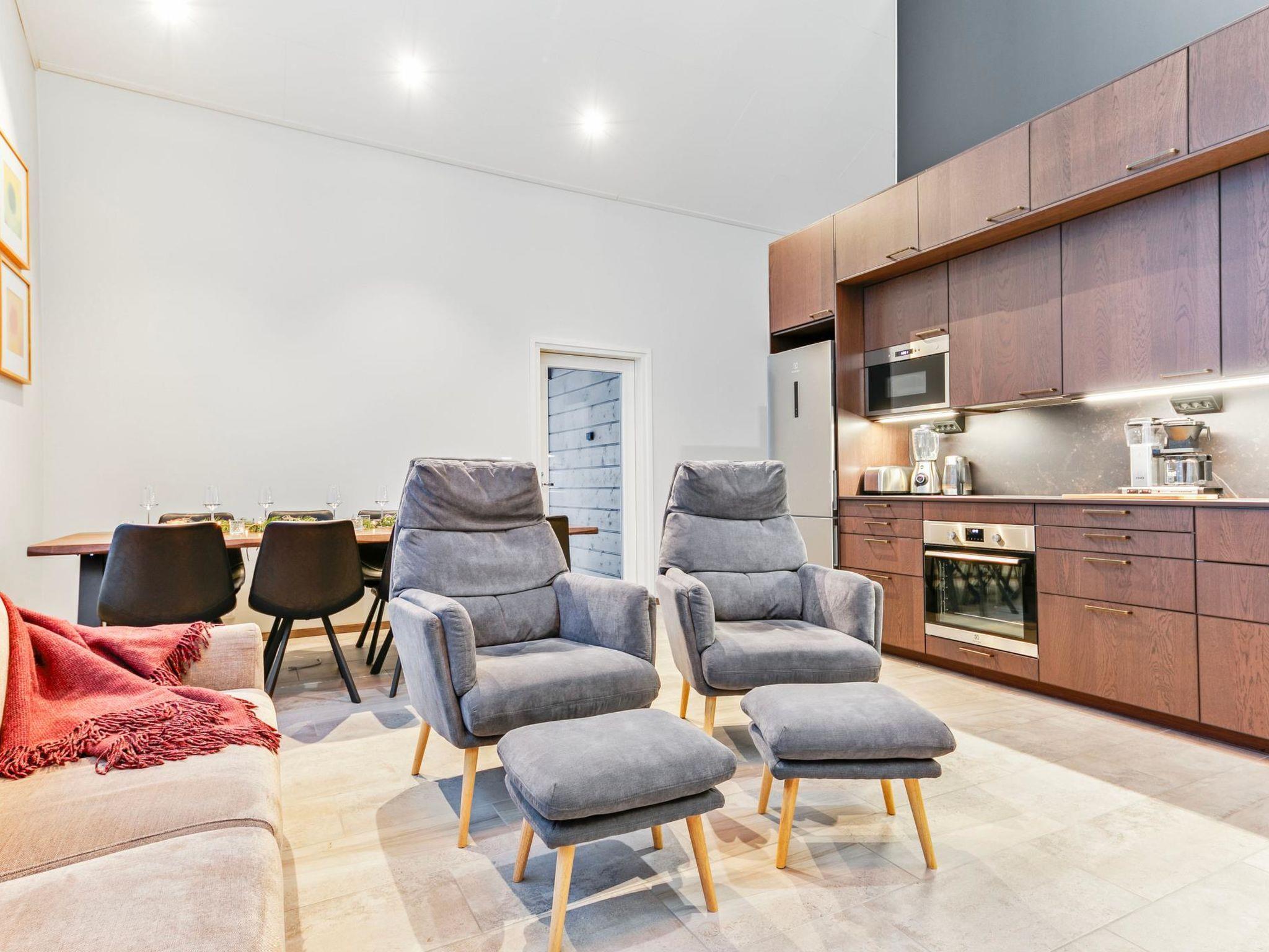 The modernly decorated open-plan kitchen and spacious living areas provide plenty of room for togetherness. The utility room includes a washing machine, dryer, and sink, adding extra convenience to your stay. You can enjoy relaxing sauna moments in the sauna and cozy bathroom.