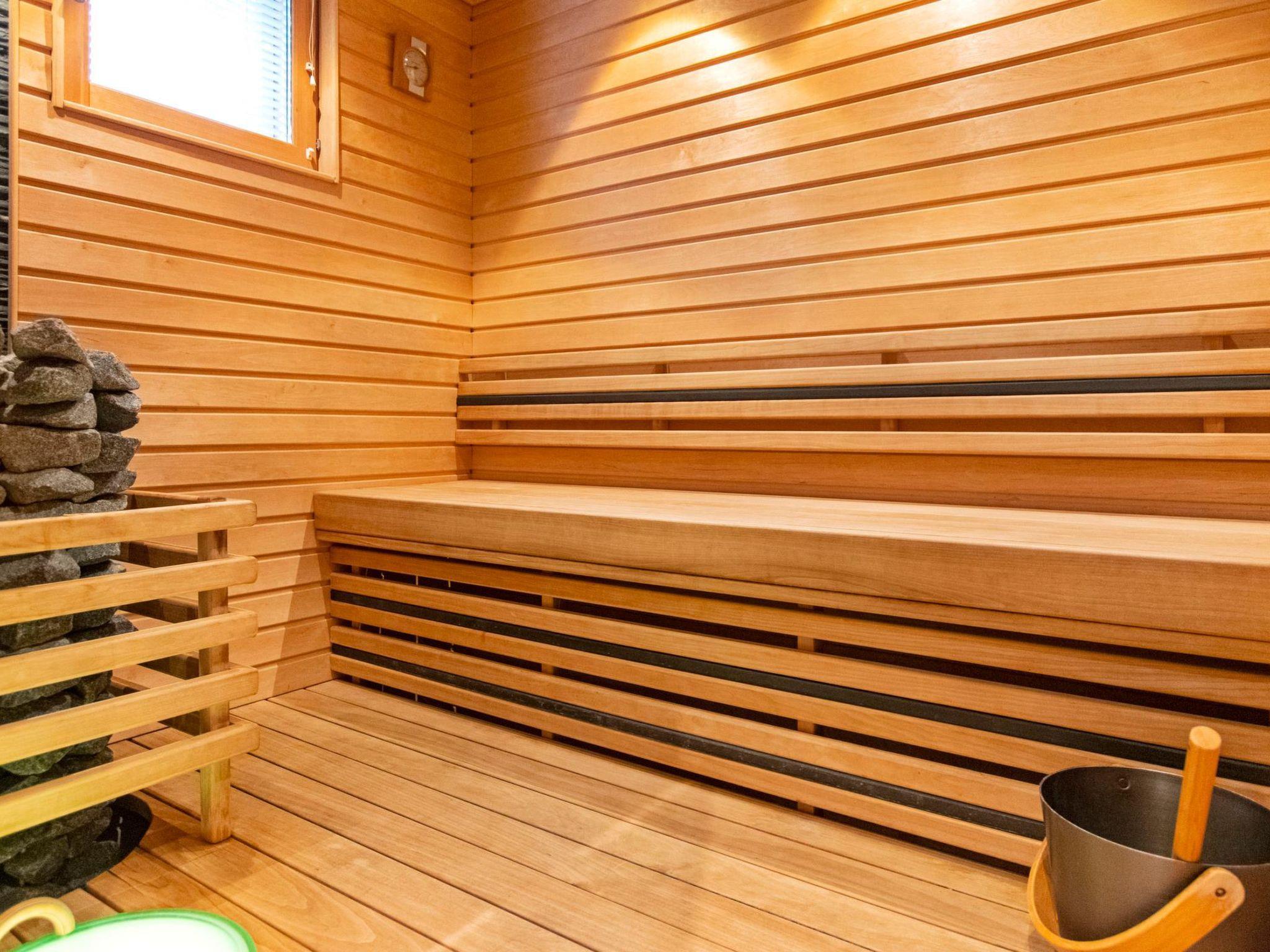 Ground floor: kitchen-living room, bedroom with two beds, sauna (electric stove), bathroom, toilet, covered terrace and a covered porch.