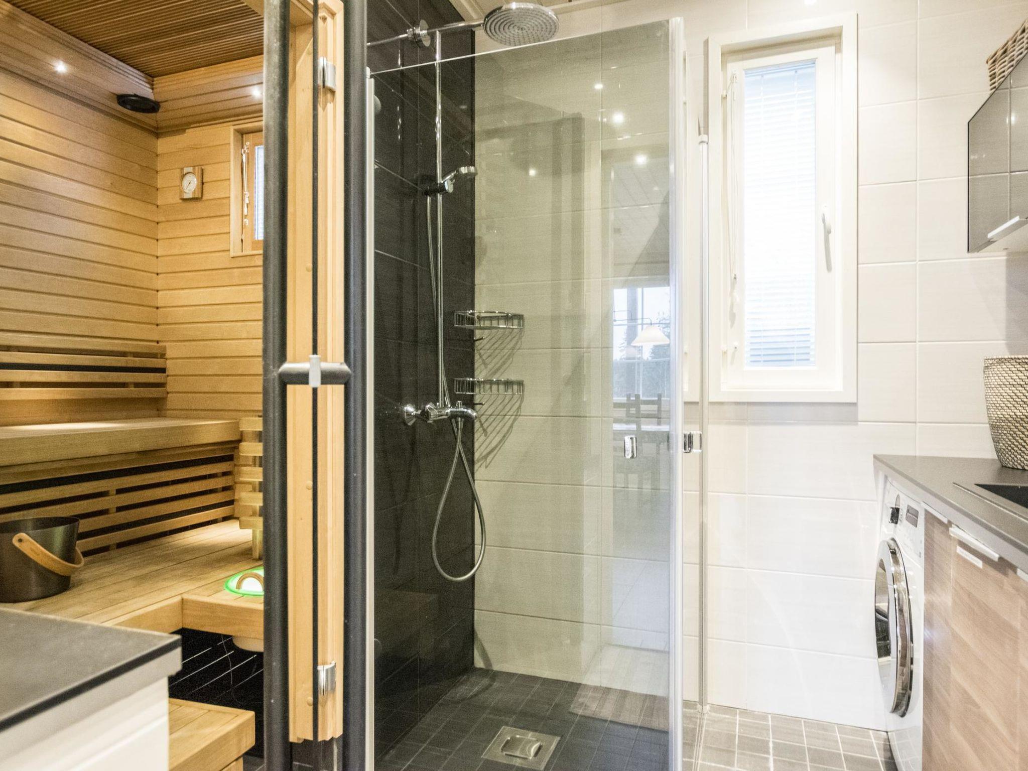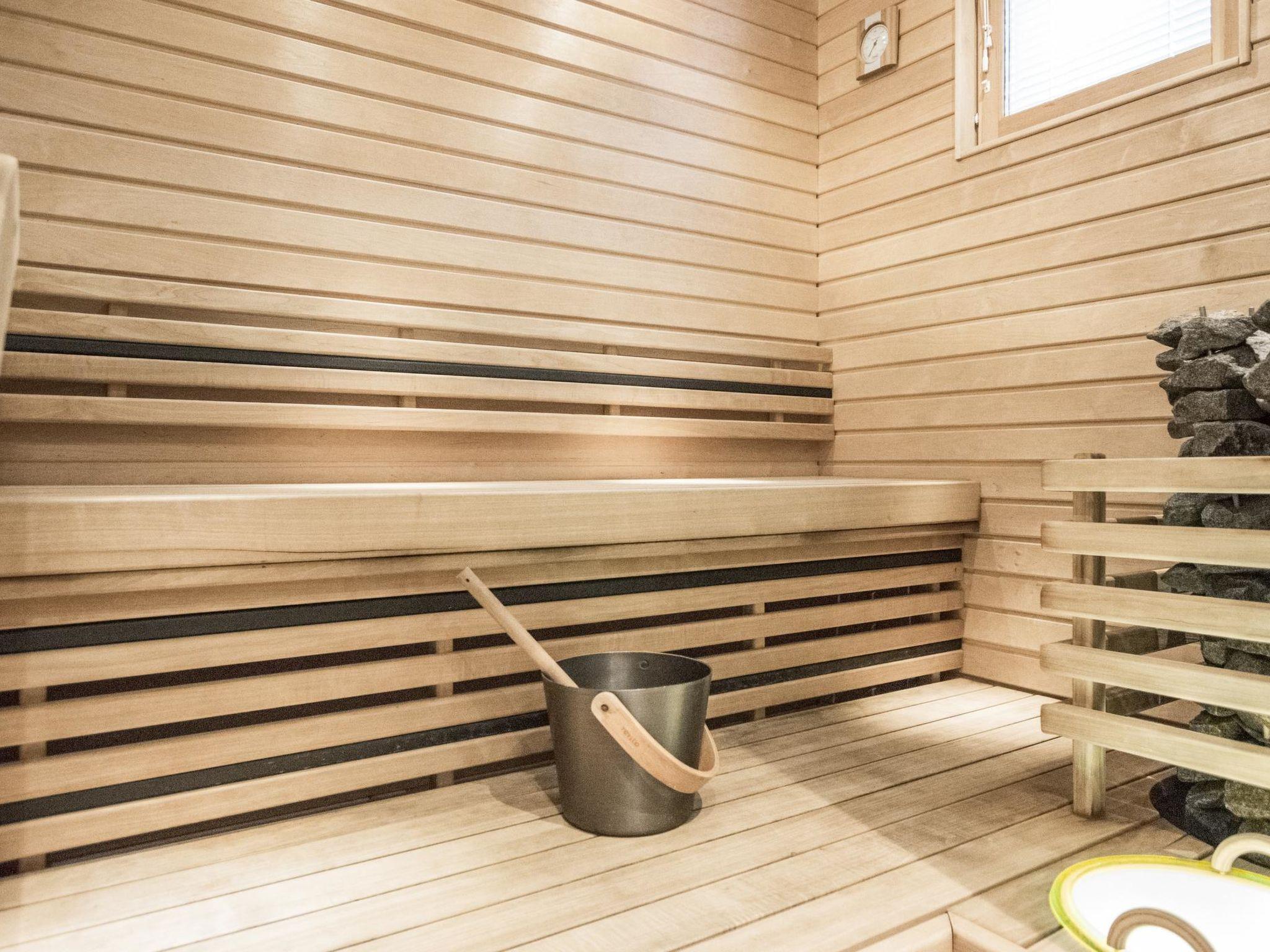 Ground floor: kitchen-living room, bedroom with two beds, sauna (electric stove), bathroom, toilet, covered terrace and a covered porch.
