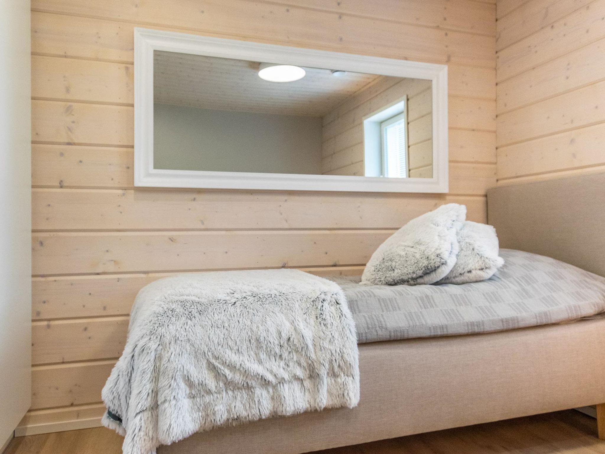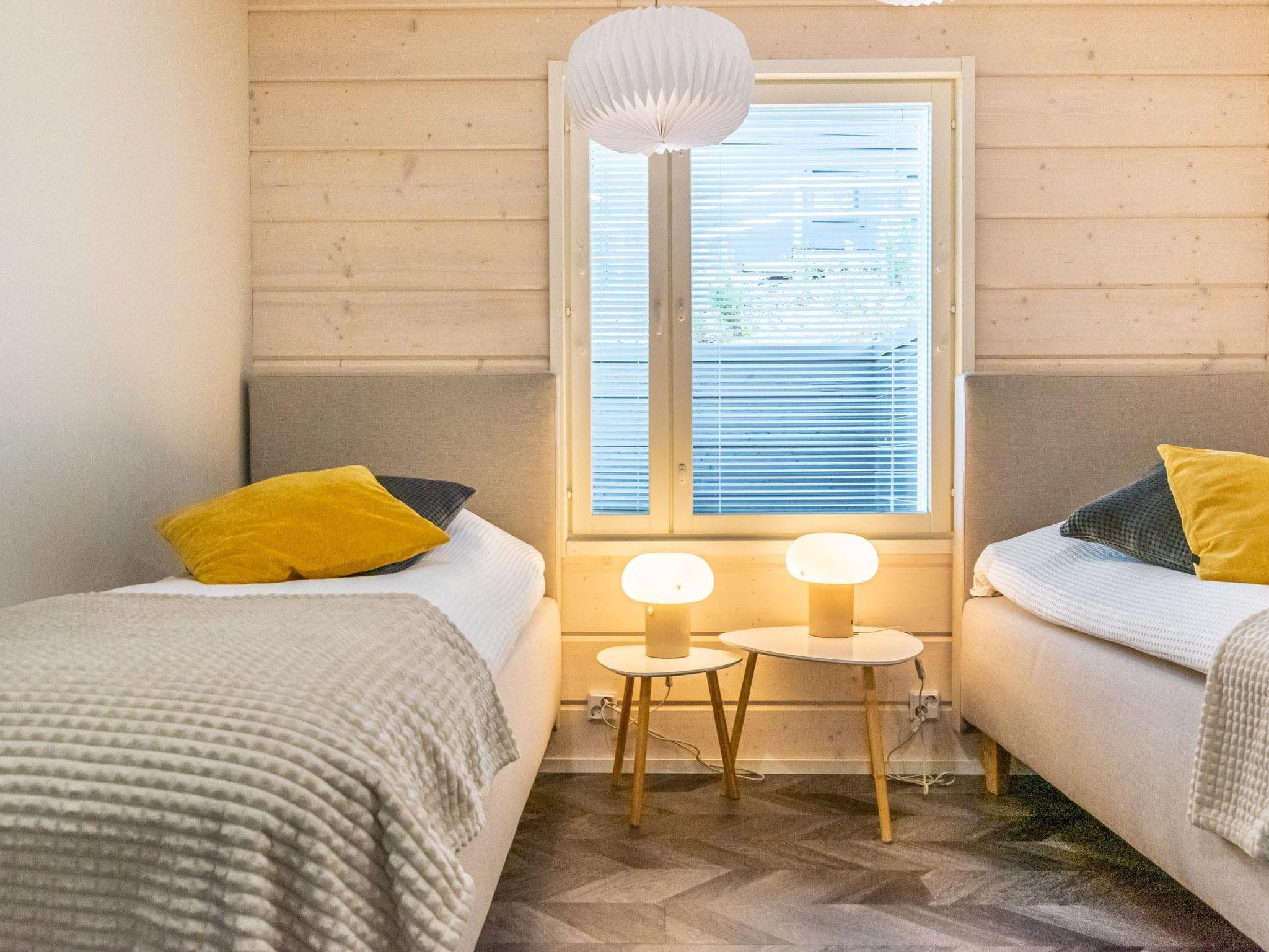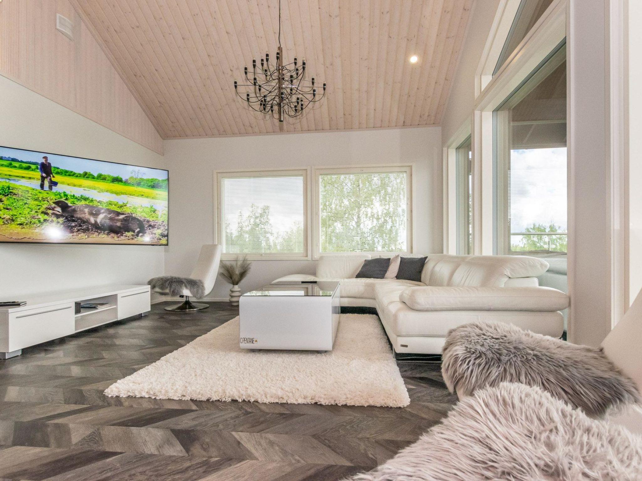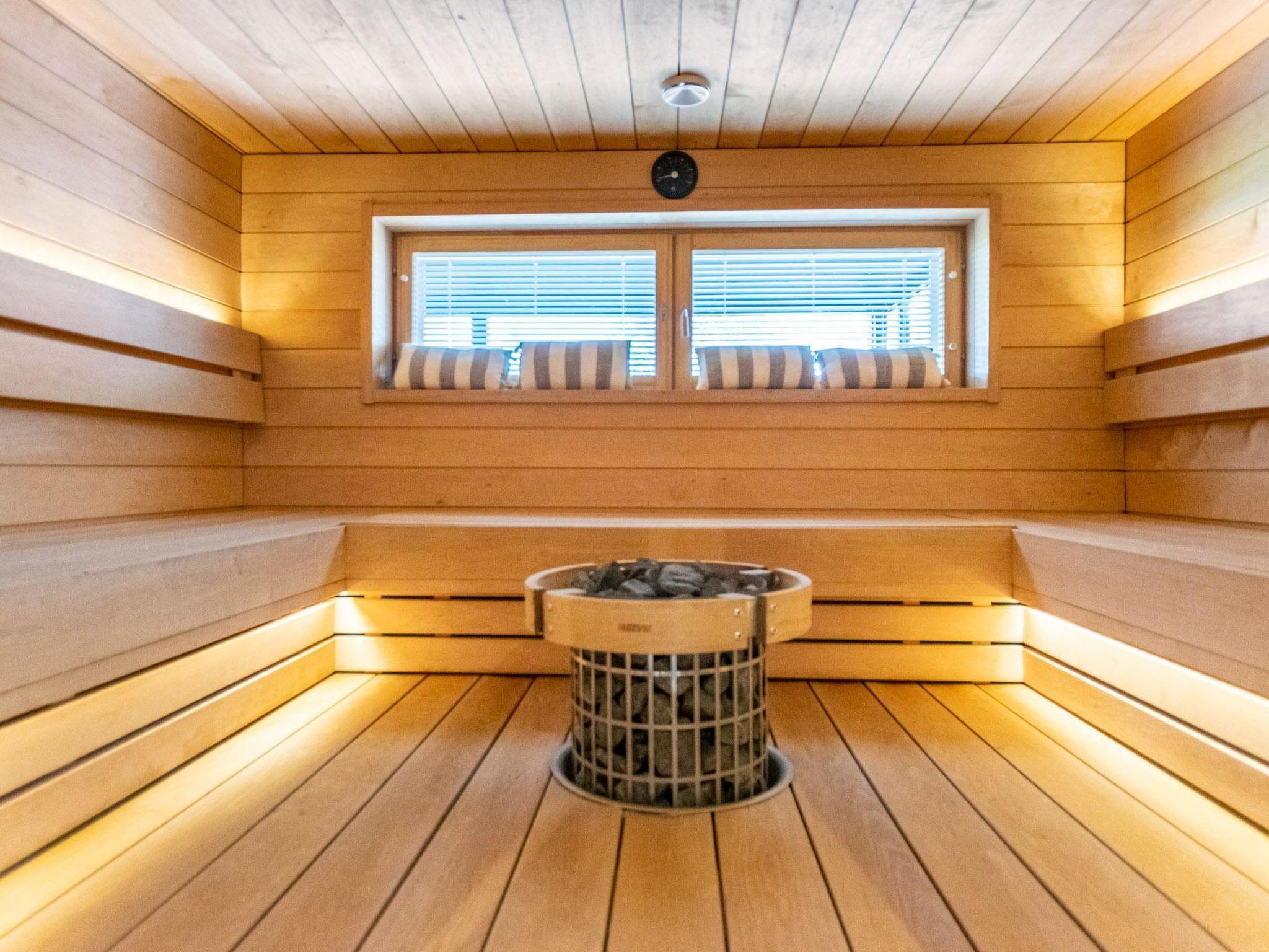 The ground floor includes a lounge area with sofas and a TV, a sauna (electric sauna stove), a bathroom with three showers, and two WCs. There is also a terrace with a hot tub available for rent. The cabin has a garage for storing golf carts, with space for one regular car. There is an electric outlet in the yard for charging electric cars with your own charger.
