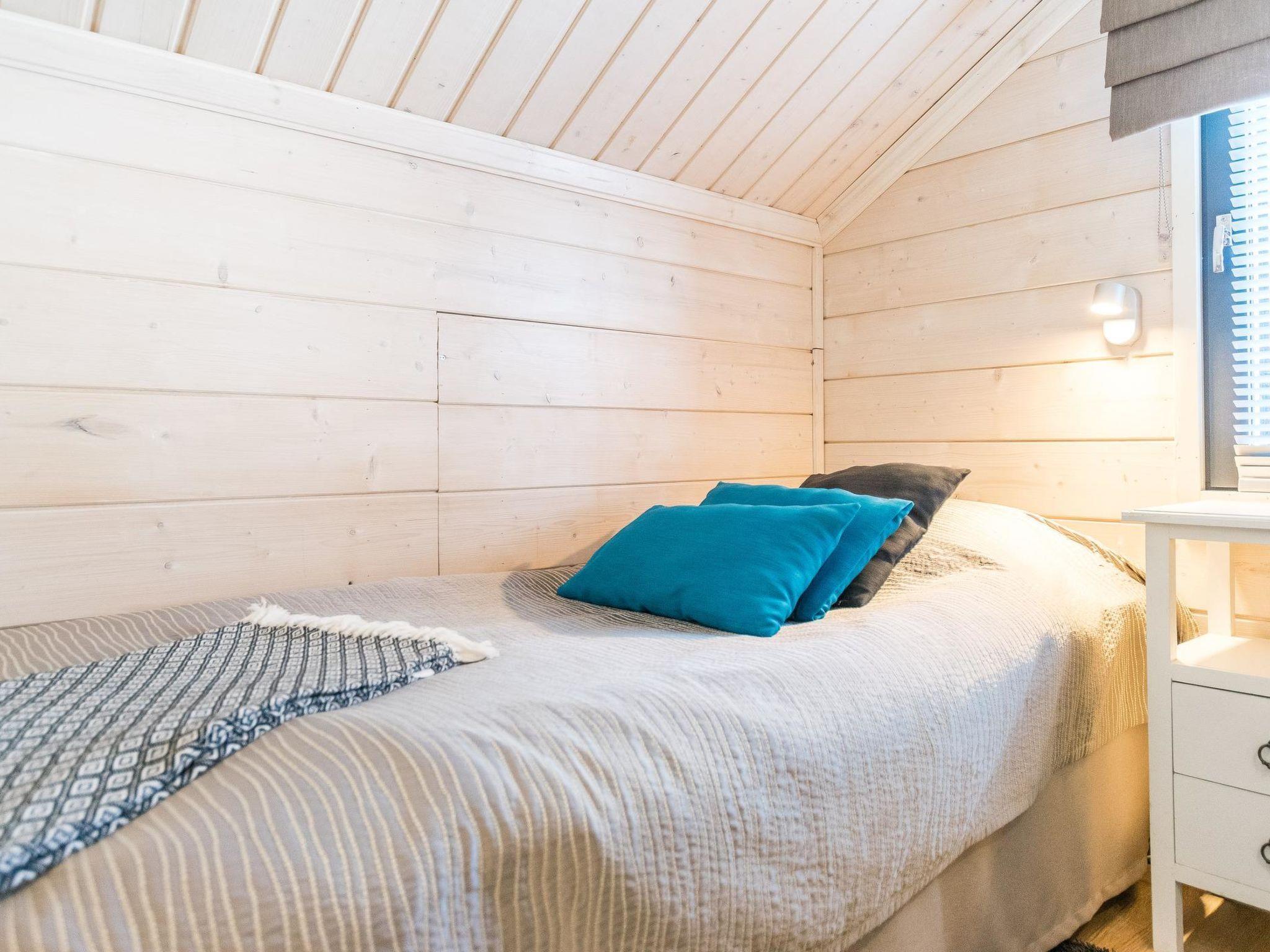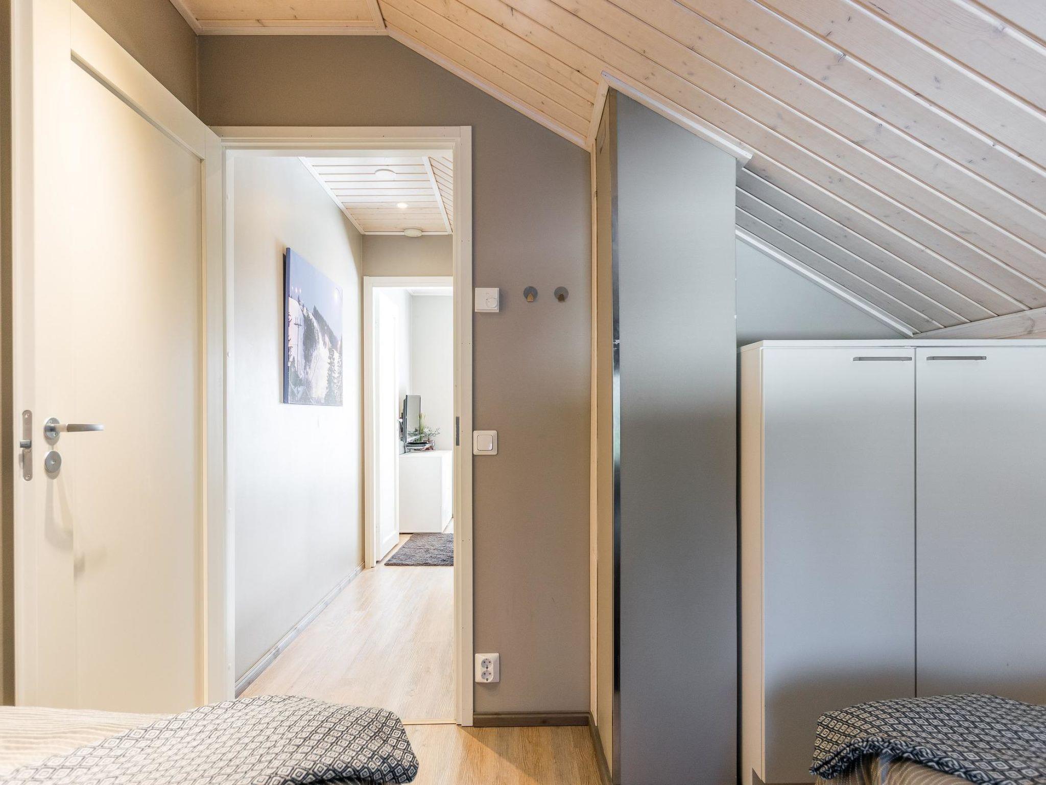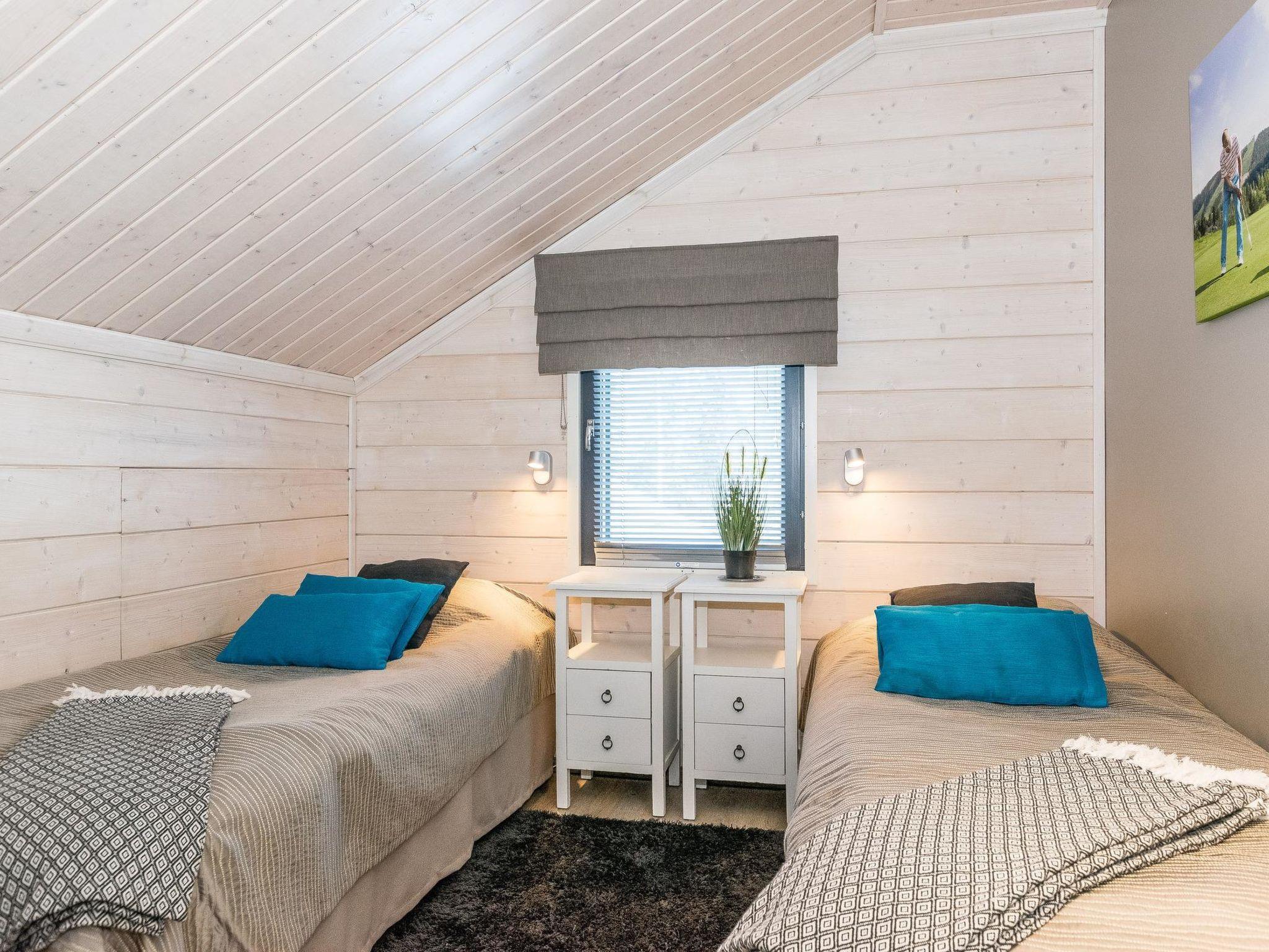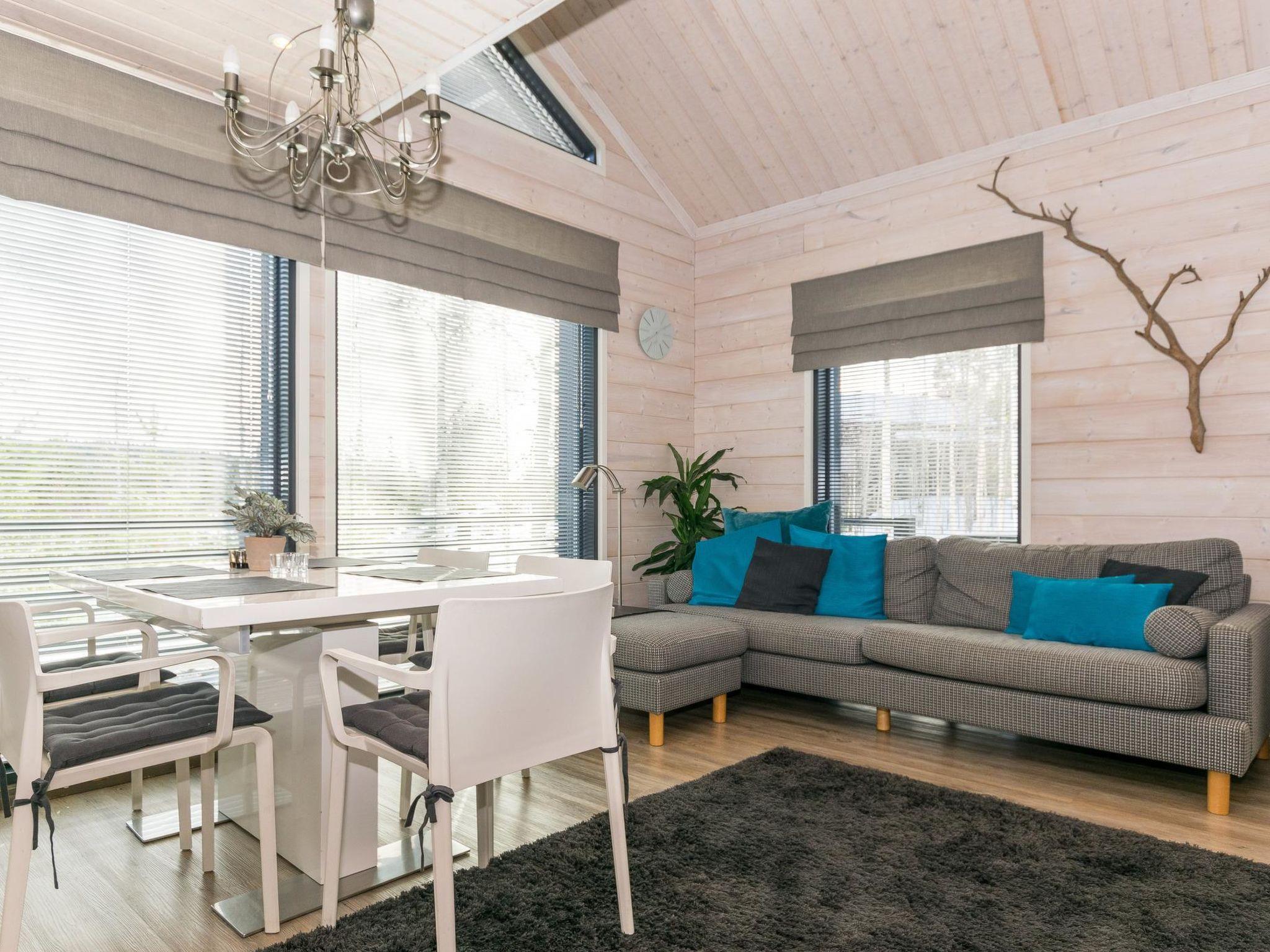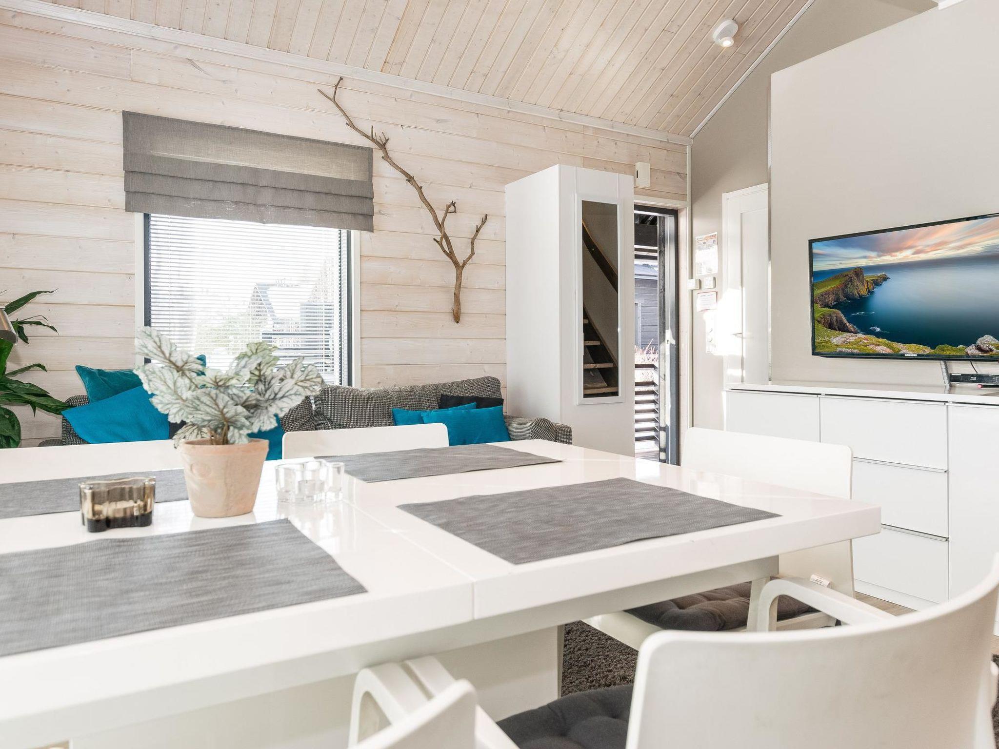 Wooden apartment (2014) with an open kitchen in the living room. The living room has a fireplace, dining area, sofa and large flat screen TV and Chromecast player. The downstairs bedroom has two beds. There is also a washroom with toilet and sauna (electrically heated stove) on the ground floor. The sauna offers a great place to relax, speakers have been installed under the benches for listening to music (can be connected via Bluetooth to the amplifier in the bathroom with all playback devices). Upstairs there are 2 bedrooms, each with two beds. There is also a separate toilet upstairs. All bedrooms have blinds, in addition, the downstairs bedroom and the second bedroom upstairs also have blackout curtains, upstairs there is a TV and a Chromecast player. The apartment is heated by geothermal / water-circulated underfloor heating, which can be controlled with room-specific thermostats. The apartment has mechanical ventilation, which also has a cooling function. A travel cot and high chair for a small child and a toilet seat (reducer) are available.
