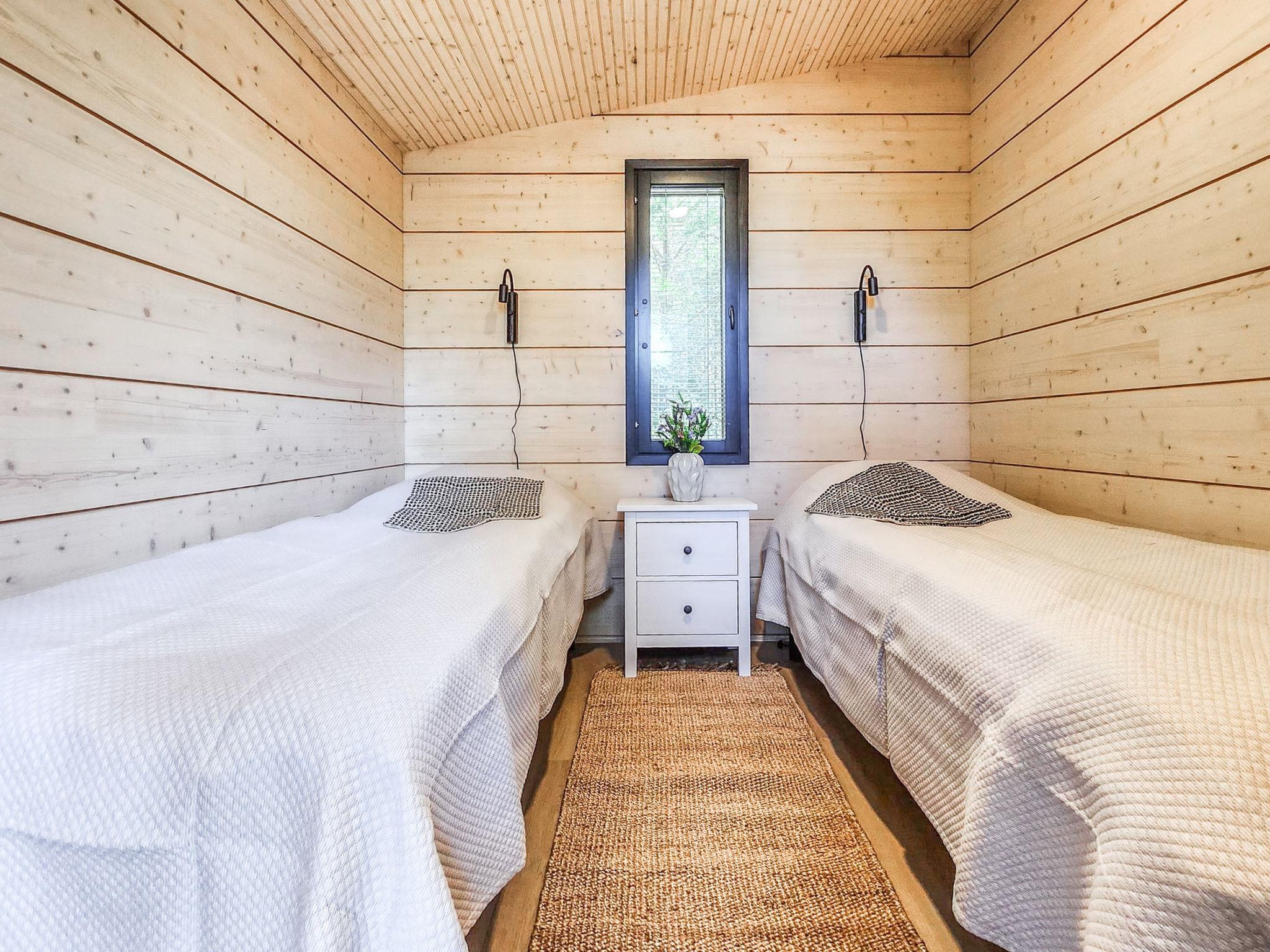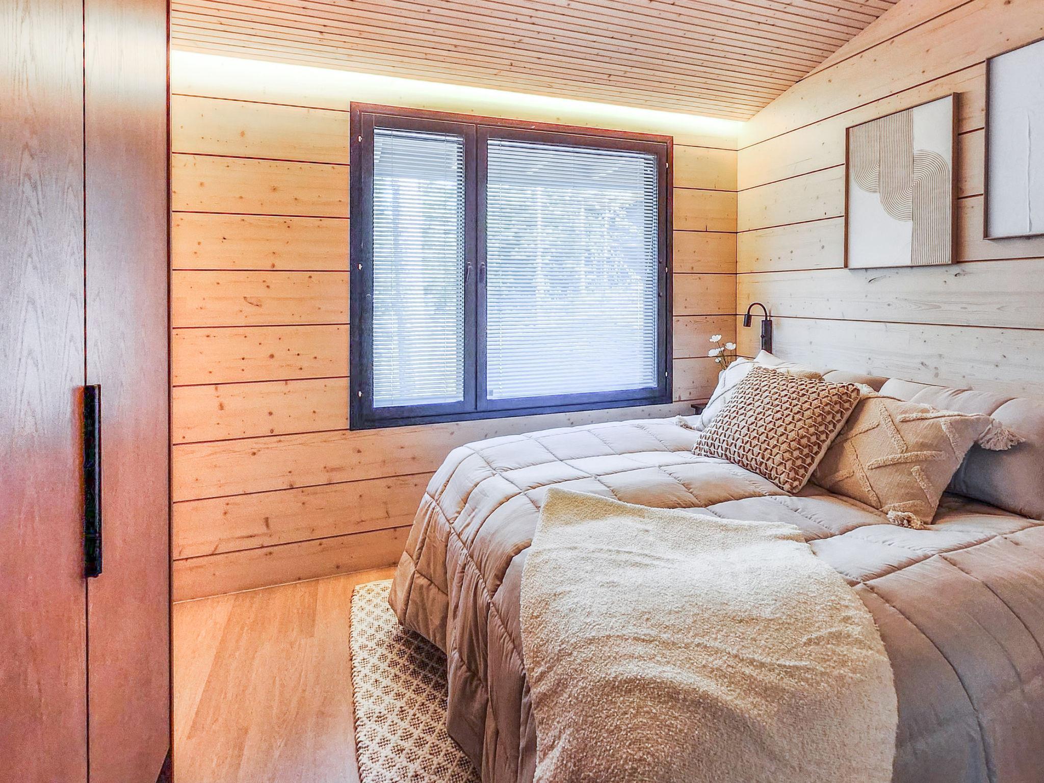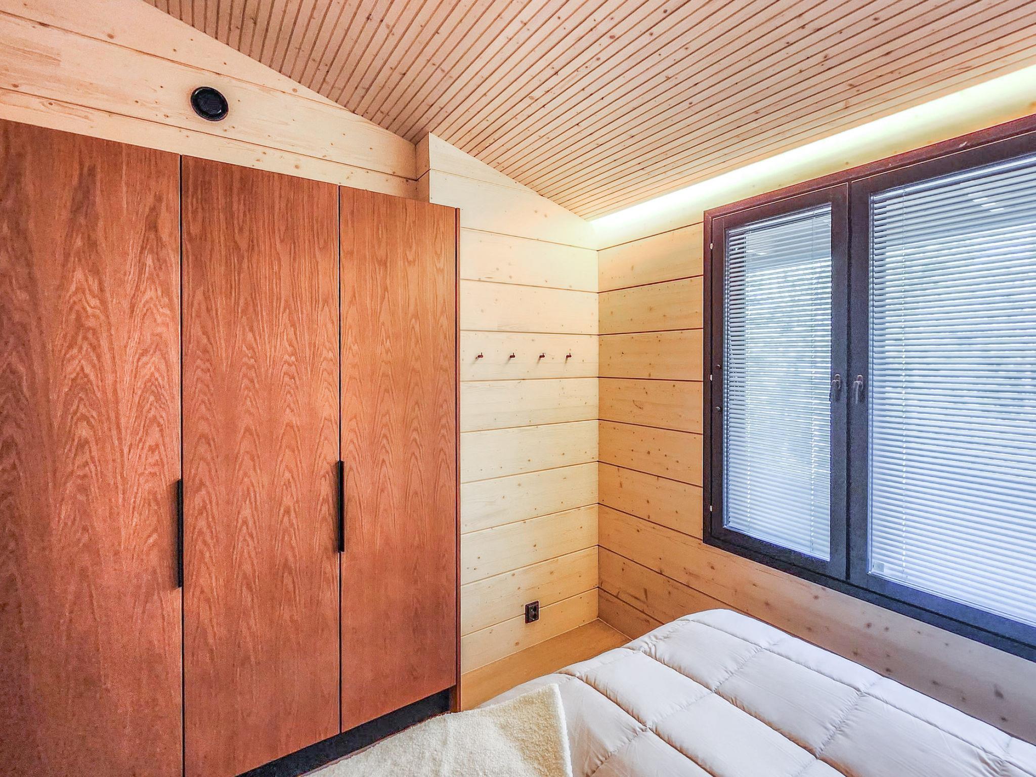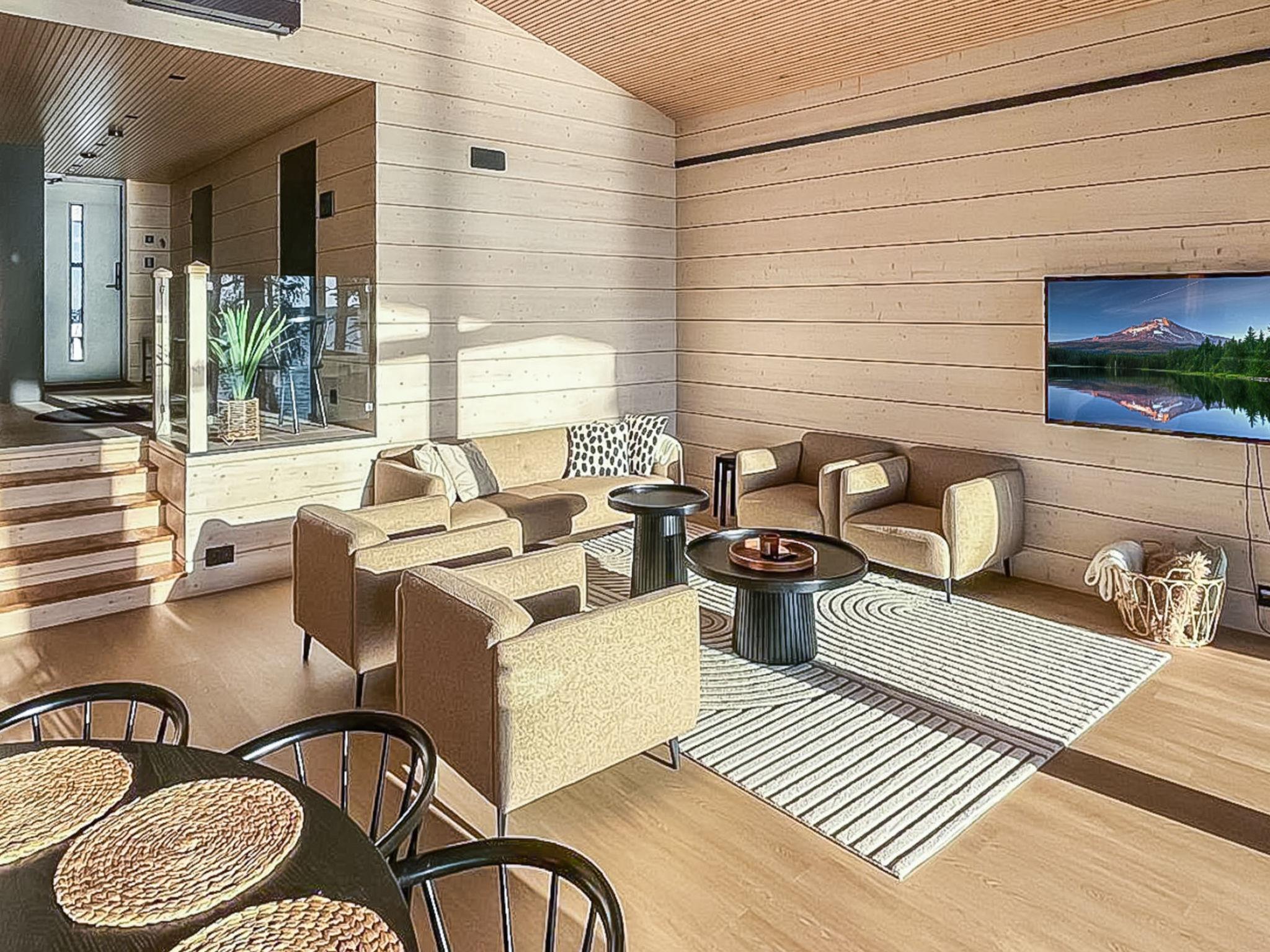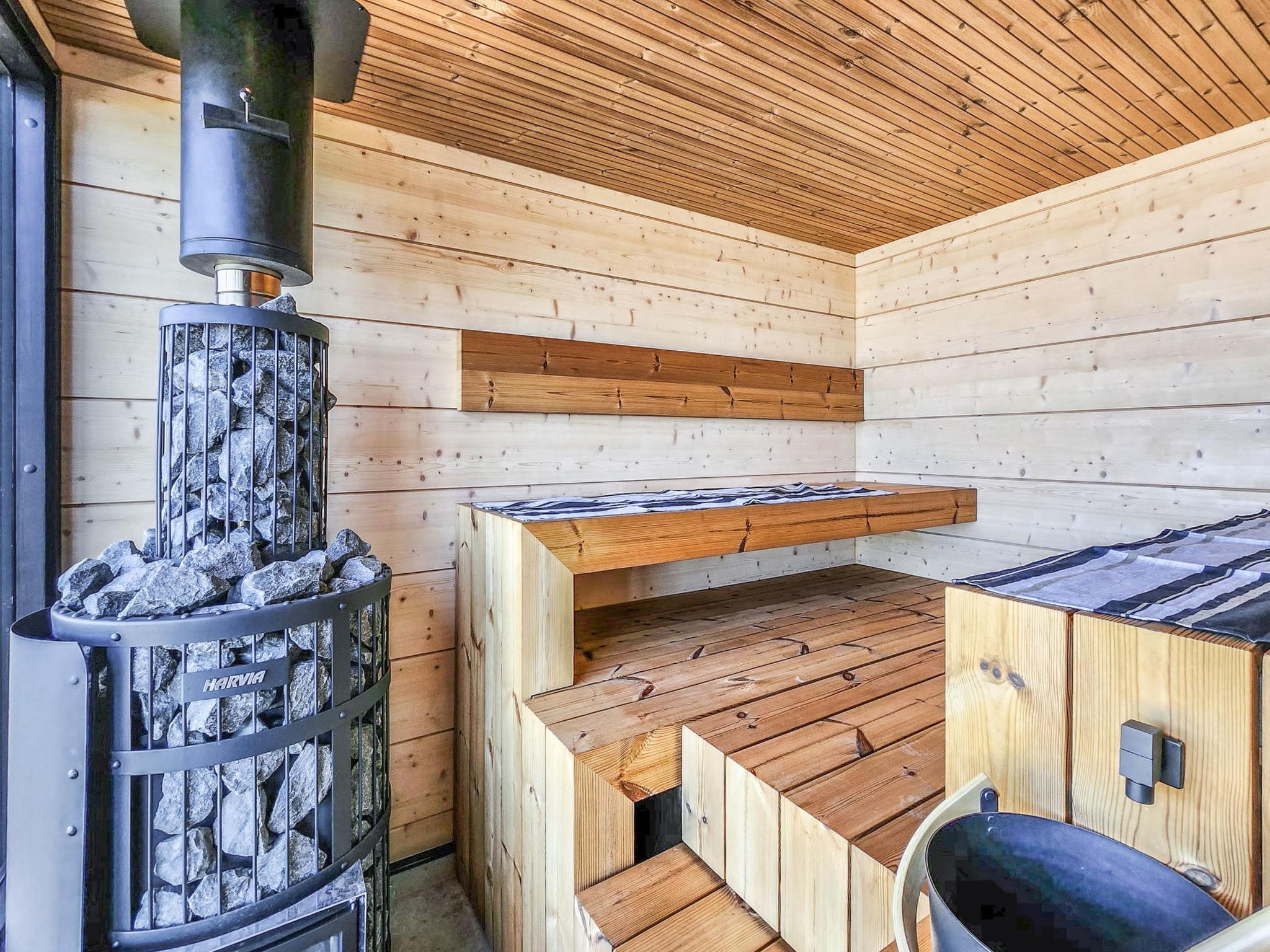 The sauna's living area includes a sofa bed that converts into a 160×200 cm bed for two. A fridge-freezer is also available. The cabin is heated by an eco-friendly air-to-water heat pump.
