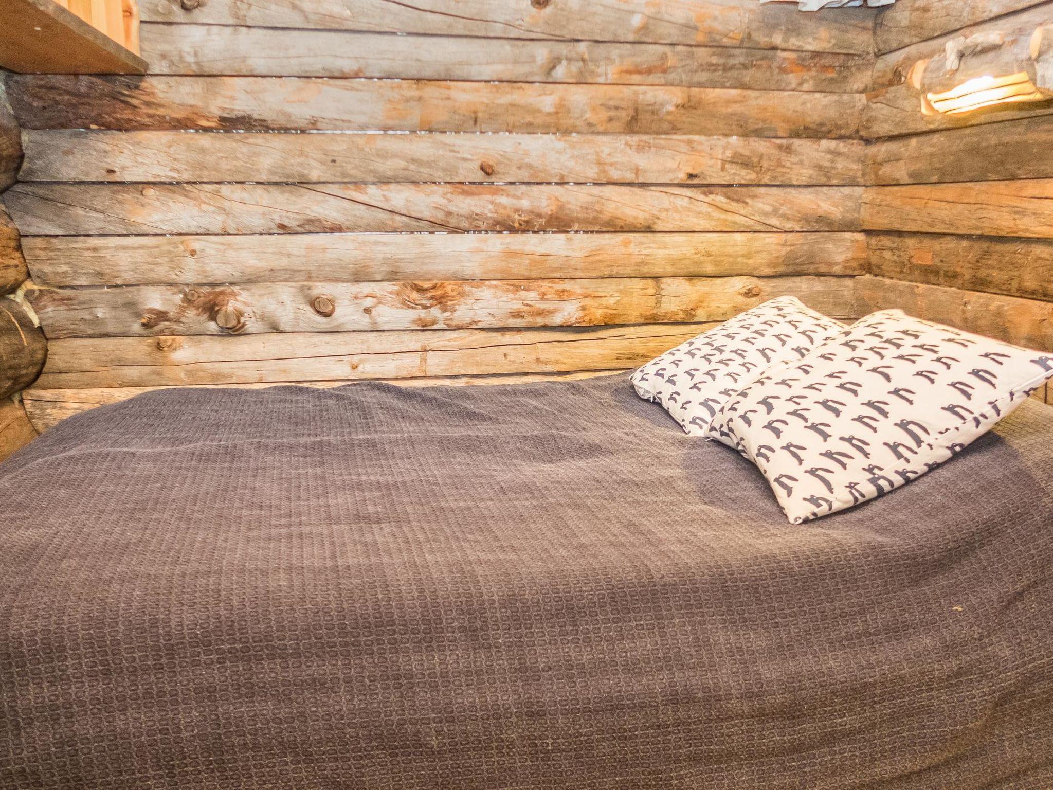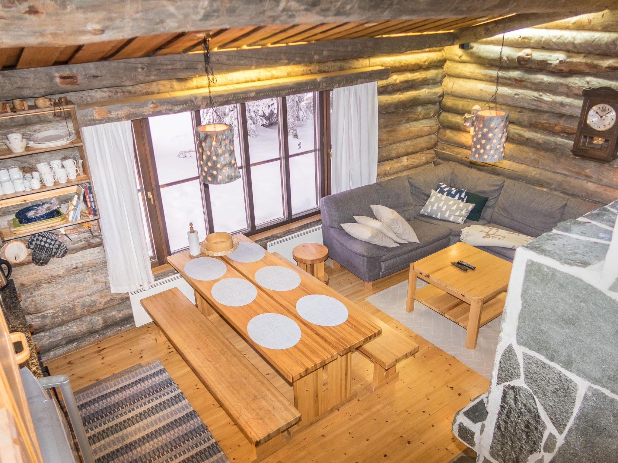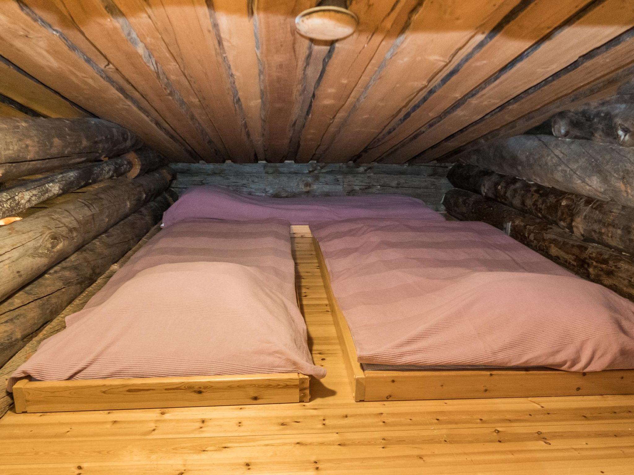 From Kuusamo to north 25 km, Ruka Village (West Ruka) 2 km, Vuosseli (East Ruka) 3 km. 1992 built semi-detached kelo log cabin, bedroom 1: bed + bunk bed, bedroom 2: bed + bunk bed, loft (steep stairs): double bed + 2 matresses. Combined kitchen + living room. Electric sauna.