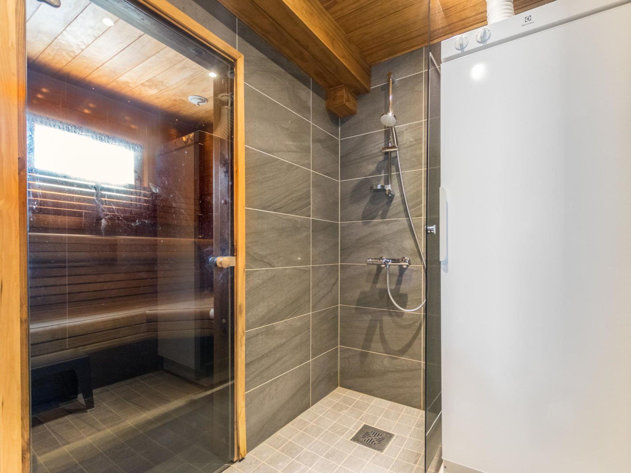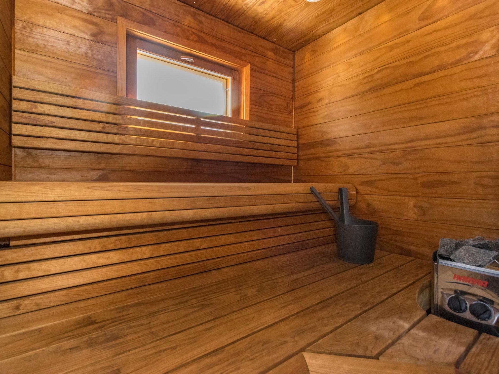 Downstairs bedroom: double bed, loft: 2 beds, combined kitchen/ living room, wash room, electric sauna, toilet, terrace. Downstairs 40 m² + loft 12 m².