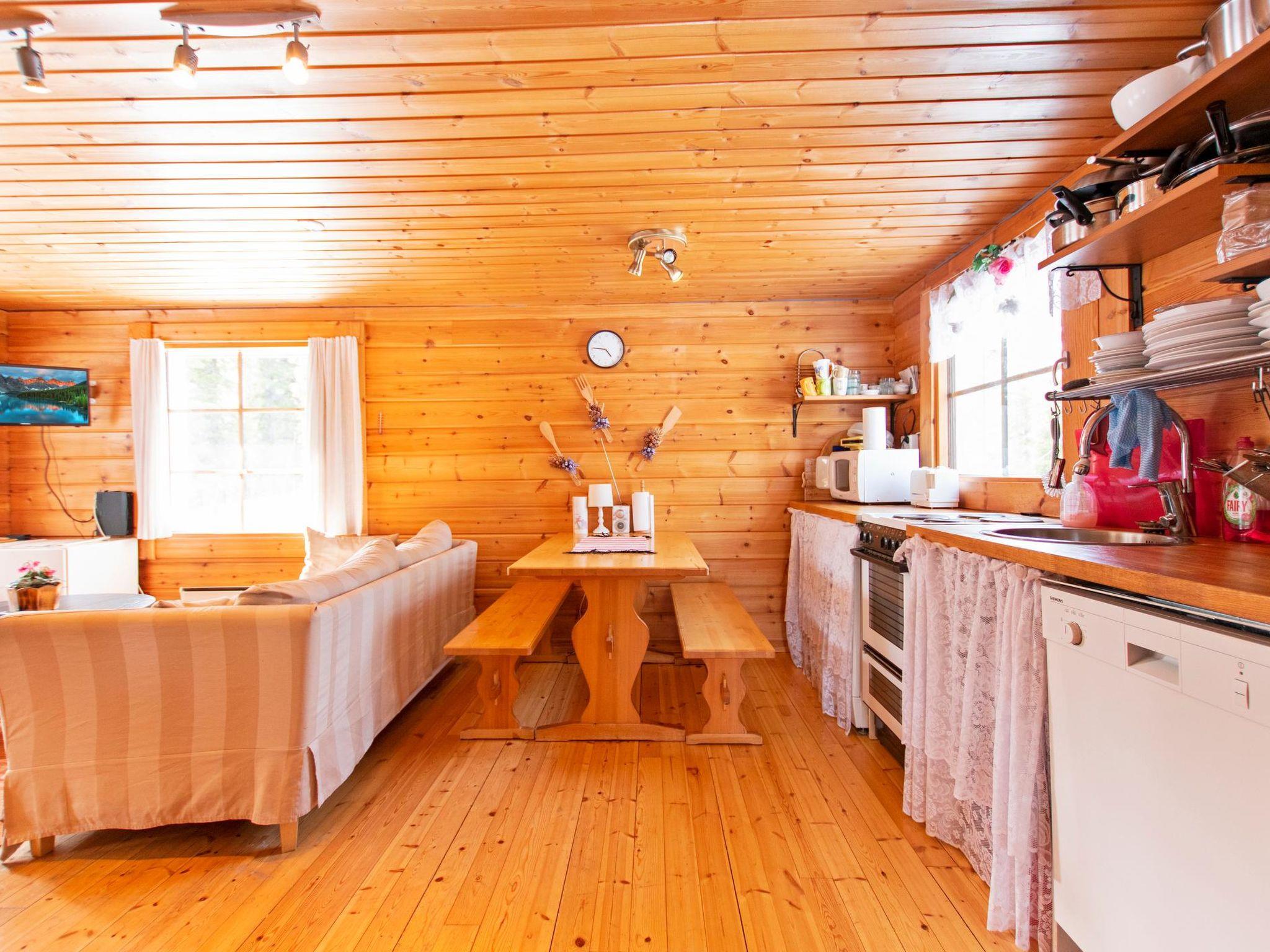 20 km north of Kuusamo, kitchen-living room, upstairs with 1 bed and 3 mattresses, alcove with 1 bed, living room with footstool bed, sauna with wood-fired stove, bathroom/toilet (no wash-basin), floor heating, balcony upstairs.