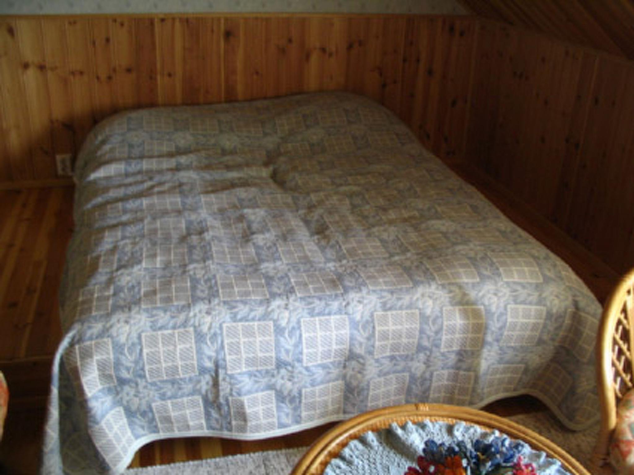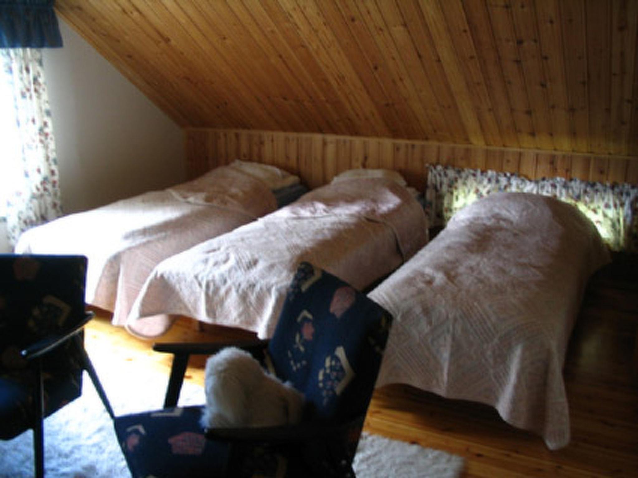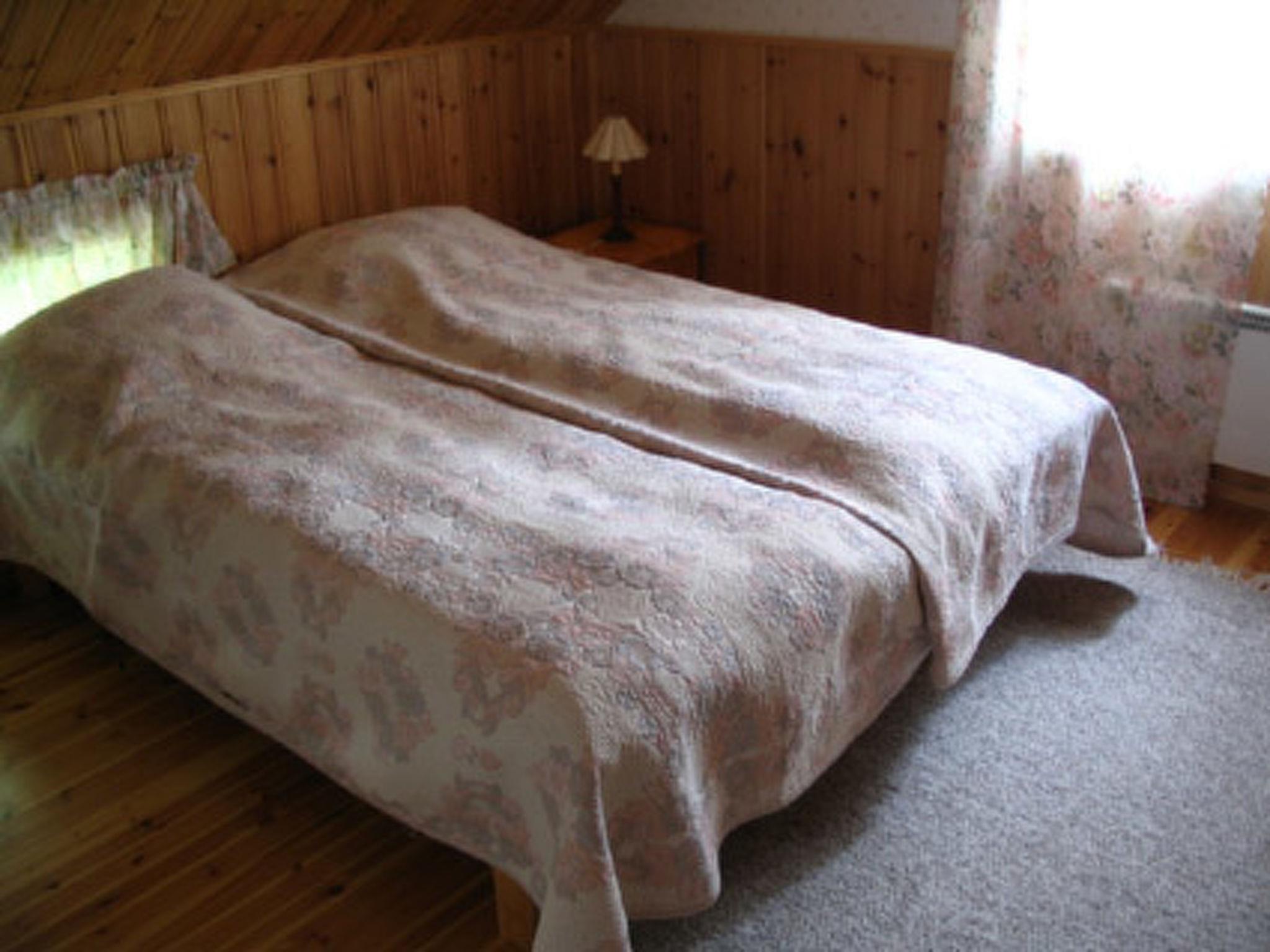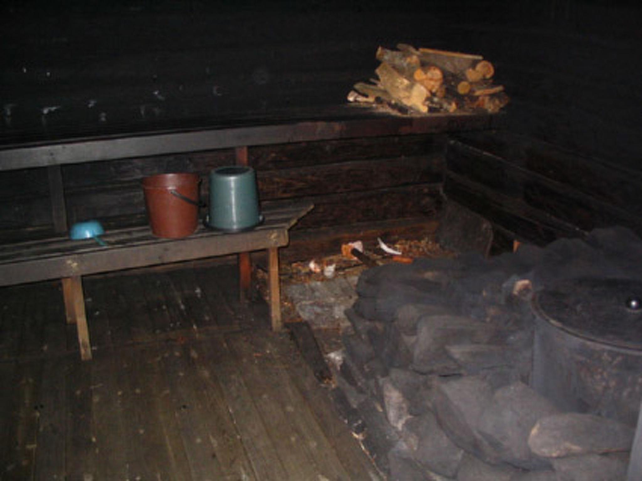 Firm log building built in the 1940s, fully renovated in 2001, entrance, large living room, kitchen (with both wood-fired and electric stove), bedroom downstairs (double bed), sauna (electric), utility room (desiccator, planes, washing machine), 3 bedrooms upstairs with 2 beds in each. Large living room (TV, armchairs, table), where 3 beds and 2 sofa beds, toilette also upstairs.