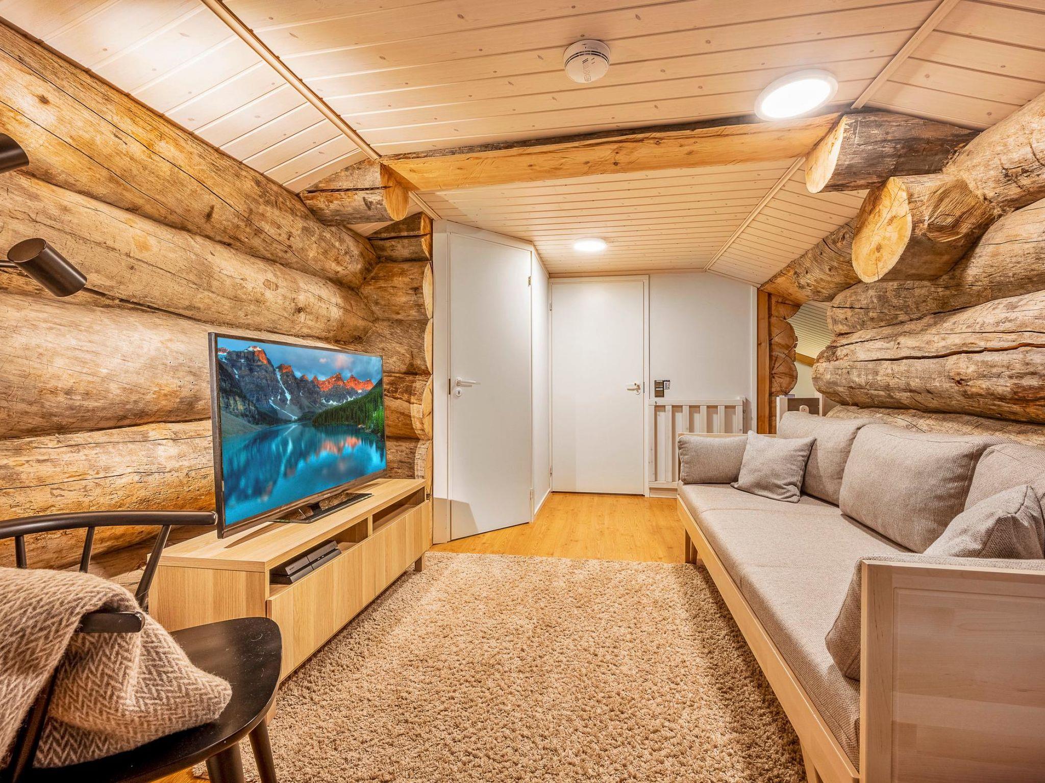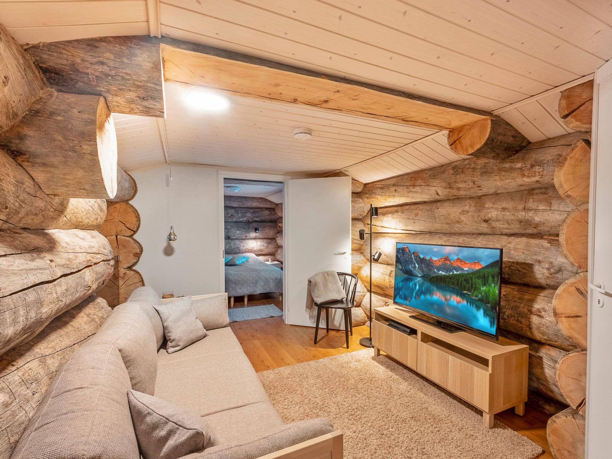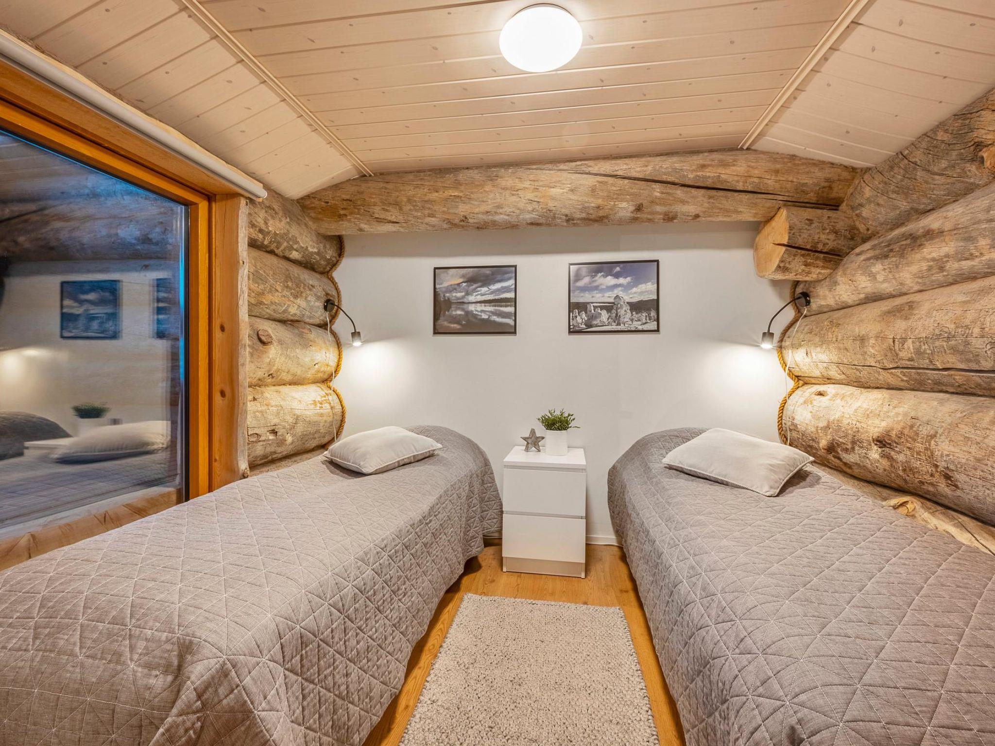 lobby on upstairs: spreadable sofa bed for two. Living room/kitchen, utility room, electric sauna and dressing room. Toilet both downstairs and upstairs. You can enjoy direct nature view from the glazed balcony.