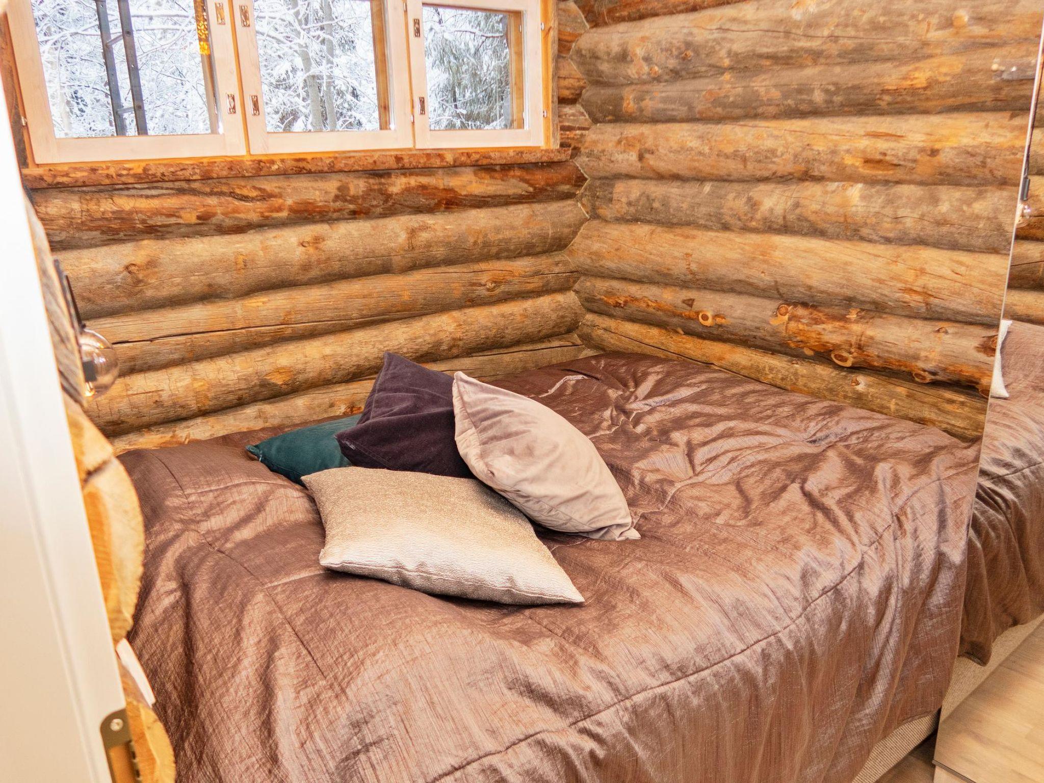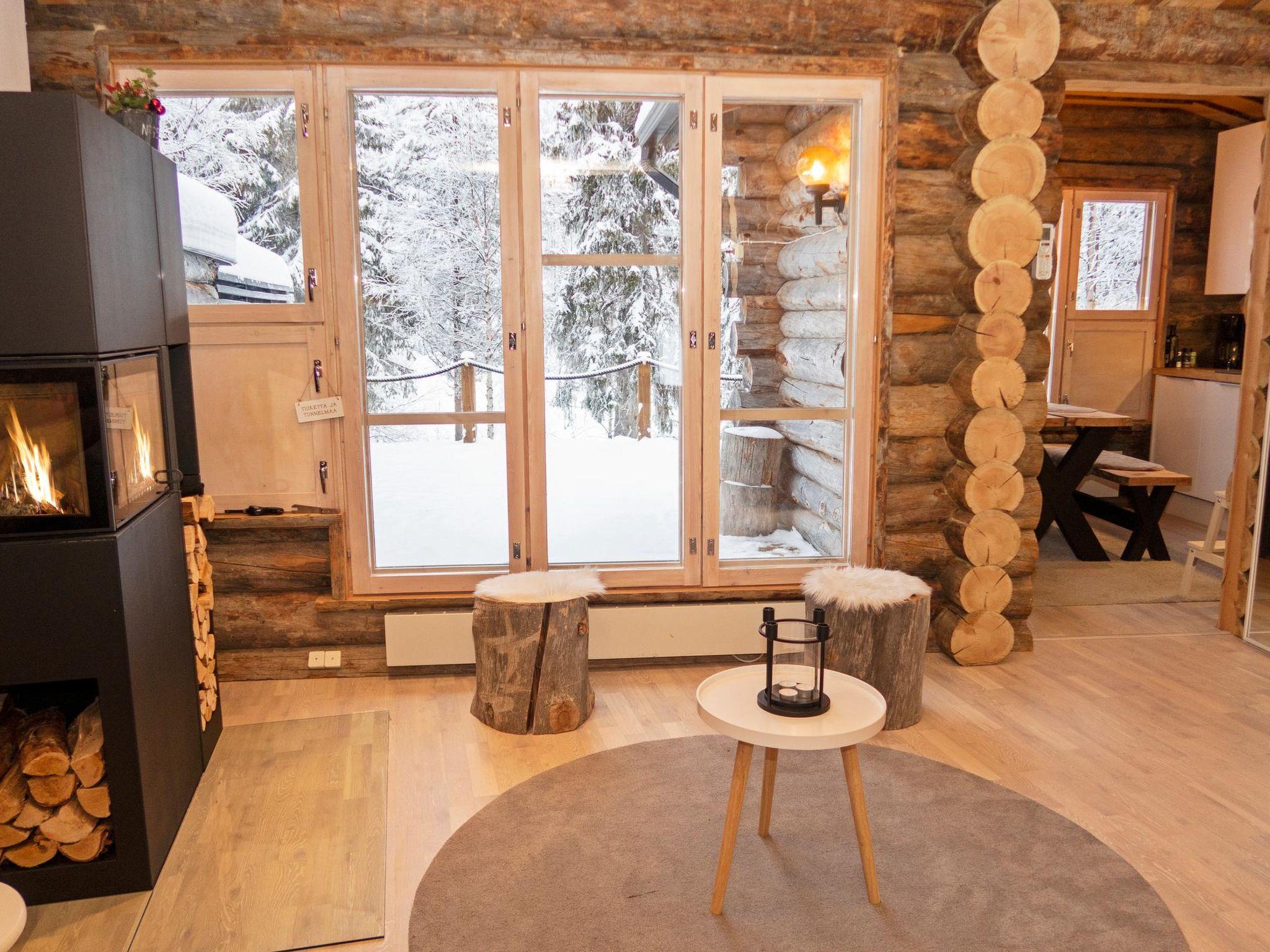27 km to the north from Kuusamo, Ruka village (West-Ruka) 3,5 km, pond Salmilampi 100 m. Kelo log-built apartment, built in 1989, in semi-detached house, bedroom with double bed, loft (low room height): box spring for two, living room with sofa bed for two. Kitchen. Electric sauna.