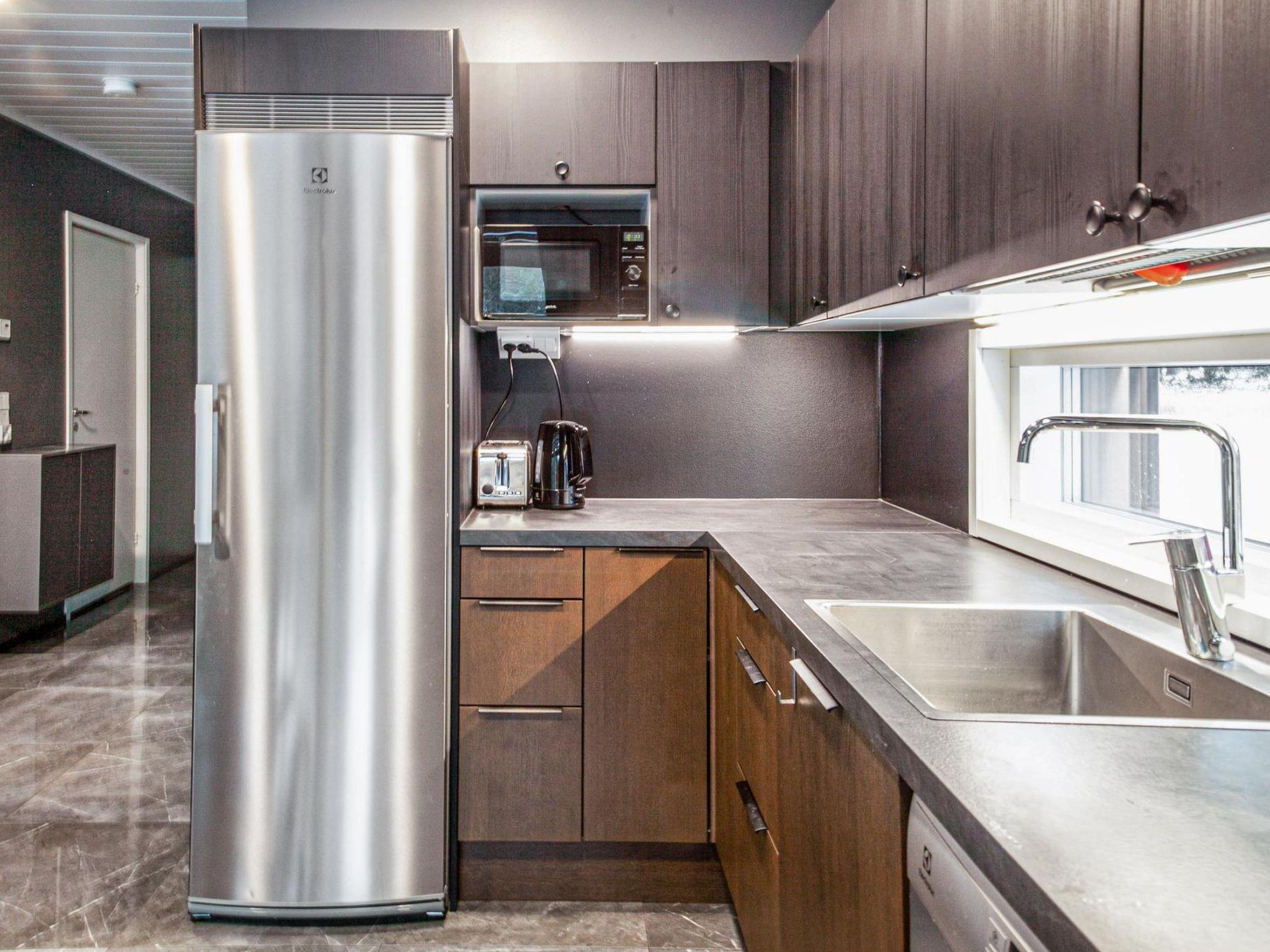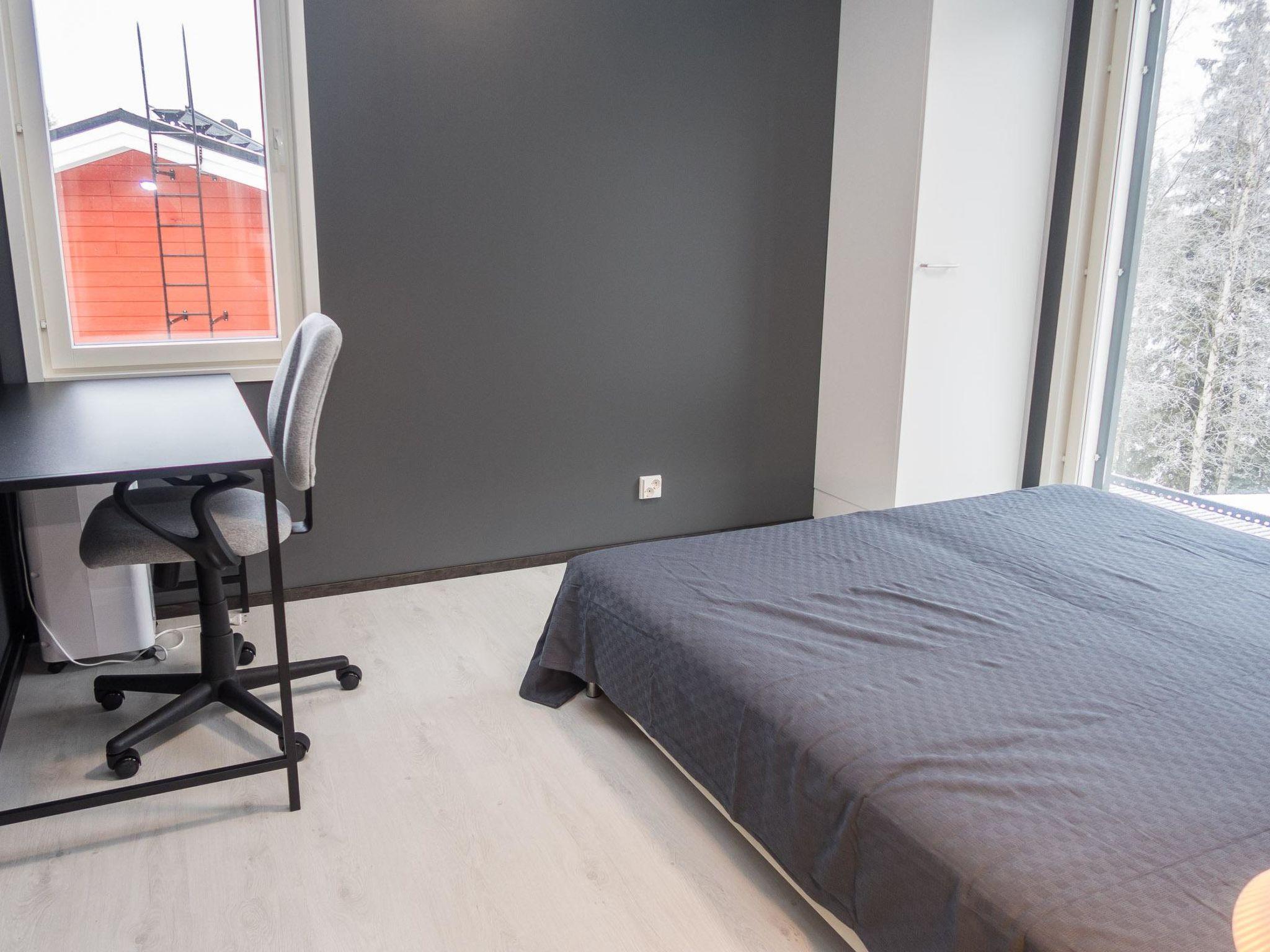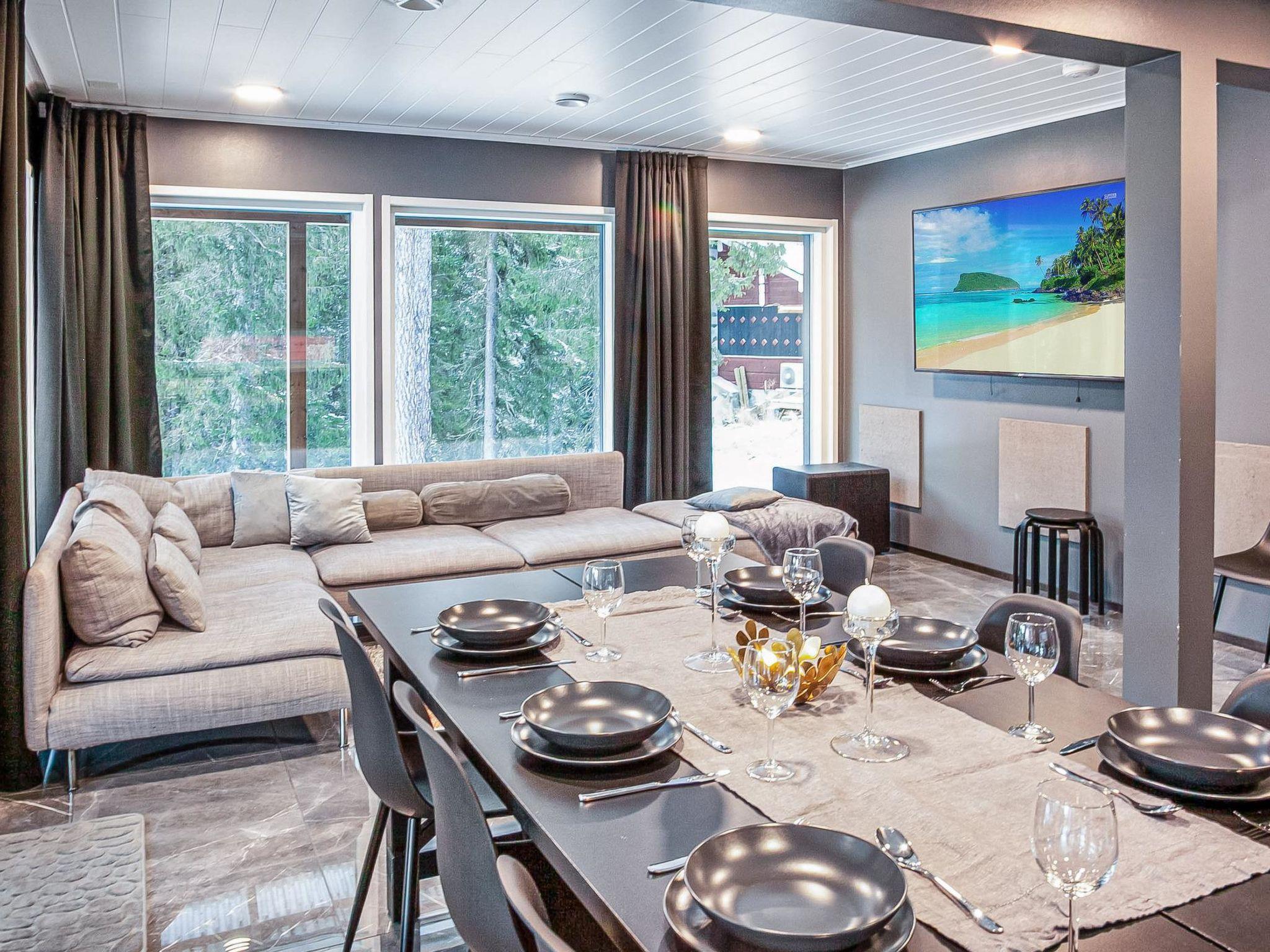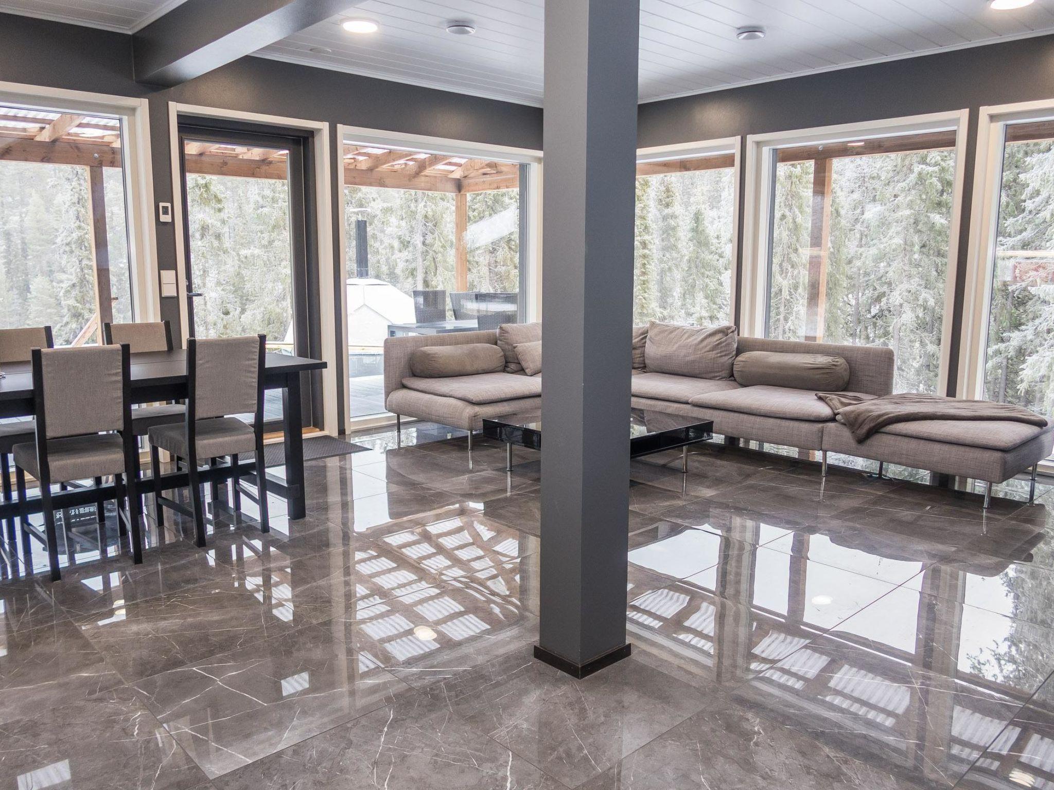 Stylish and spacious cabin by the pond Salmilampi, close to services of Ruka. All 5 bedrooms of the cabin are located upstairs. Three bedrooms have 2 separate beds and two have bunk beds. There is an electric sauna in the cabin. Wood-heated lakeside sauna with facilities for resting can be rented at additional cost. A glazed cooking hut is available for customers. Hydromassage bath outdoors on the cottage terrace for additional fee.
